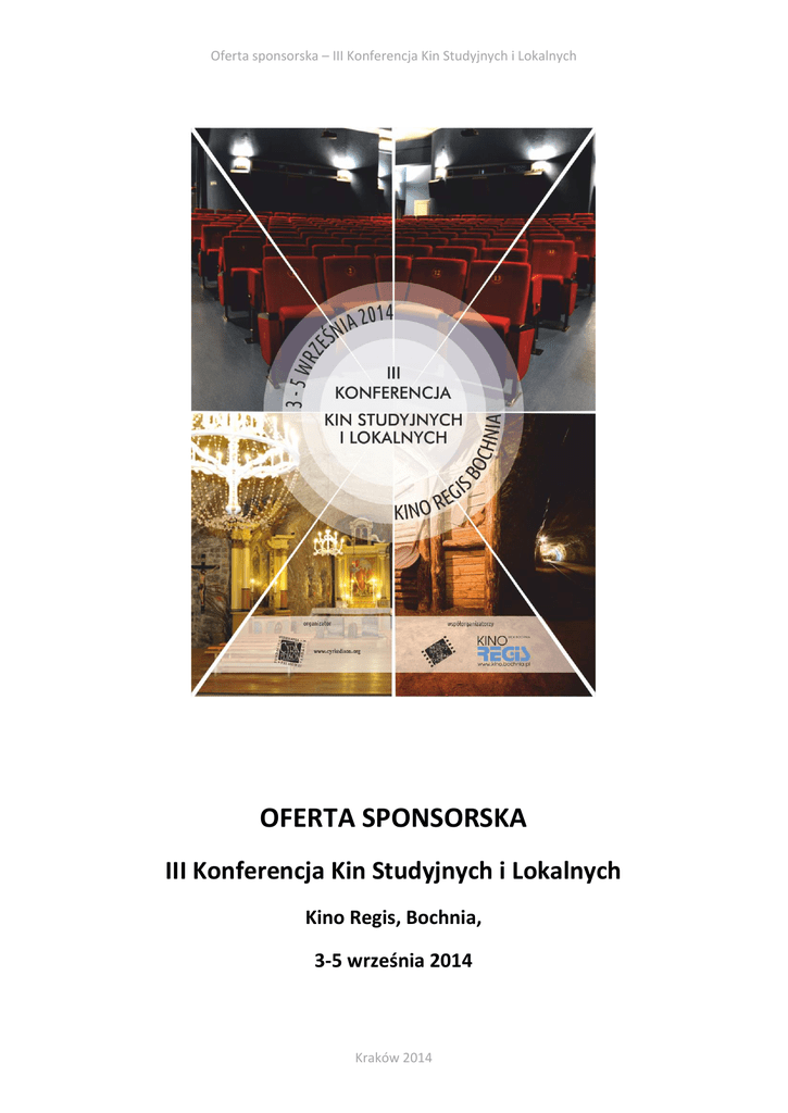 Oferta sponsorska – III Konferencja Kin Studyjnych i Lokalnych OFERTA SPONSORSKA III Konferencja Kin Studyjnych i Lokalnych Kino Regis, Bochnia, 3-5 września 2014 Kraków 2014 Oferta sponsorska – III Konferencja Kin Studyjnych i Lokalnych Wstęp: Serdecznie zapraszamy do zapoznania się z naszą ofertą sponsorską, z nadzieją na podjęcie owocnej współpracy. Niniejsza oferta dotyczy wsparcia organizacji III Konferencji Kin Studyjnych i Lokalnych, dzięki czemu Państwa firma może zyskać lub umocnić wizerunek firmy przyjaznej kulturze. Fundacja Wspierania Kultury Filmowej Cyrk Edison Tworzymy grupę pasjonatów, dla których kino to nie supermarket. Celem naszej fundacji jest propagowanie kultury filmowej, która niestety powoli ustępuje miejsca przemysłowi. Dawno, dawno temu, kiedy zaczynaliśmy przygodę z kinem, obcowanie z filmem miało inny charakter. Nie liczyło się to, że fotel niezbyt wygodny, a wentylacja niedomaga, najważniejsze było to co na ekranie. Dziś mamy fabryki rozrywki, maksymalnie wygodne i komfortowe, oraz coraz częściej świetnie wyposażone przybytki kultury filmowej. We wrześniu 2009 roku uruchomiliśmy w Krakowie kino Agrafka. Nowoczesne, spełniające wszystkie współczesne standardy kameralne kino studyjne, które już w 2010 roku otrzymało nagrodę Polskiego Instytutu Sztuki Filmowej dla najlepszego kina w Polsce. W 2012 roku uruchomiliśmy kolejne małe kino w krakowskim Podgórzu. KIKA jest obecnie jedynym tego typu kinem w Krakowie. W jednym miejscu można znaleźć dwie małe sale kinowe, program pełen znakomitych filmów, głównie europejskich, oraz przytulną kawiarnię. Przez 5 lat naszej działalności udało nam się zrealizować wiele projektów filmowych. W 2011 roku zwyciężyliśmy w jednej z edycji konkursu Alior Banku skierowanego do domów kultury, dzięki czemu zrealizowaliśmy projekt spotkań filmowych dla osób z dysfunkcją słuchu i wzroku pod nazwą „Kino bez Barier”. Rok później wraz z Fundacją Orange zrealizowaliśmy teoretyczno-praktyczny program akademii filmowej dla dzieci i młodzieży „Kręci mnie film”, w efekcie którego powstały krótkie formy filmowe. Od początku swojej działalności duży nacisk kładziemy na edukację młodego widza. W naszym programie Akademii Filmowej „Kino z Klasą” w roku szkolnym 2013/2014 udział wzięło blisko 1000 uczniów szkół podstawowych, gimnazjalnych oraz średnich. W grudniu 2013 roku we współpracy z Siecią Kin Studyjnych i Lokalnych wydaliśmy pierwszy numer Informatora Kin Studyjnych. Dotychczas ukazały się dwa kolejne numery – każdy w nakładzie 12 000 egzemplarzy, które trafiły do wszystkich kin studyjnych i lokalnych w Polsce. Informator Kin Studyjnych jest jedynym periodykiem na polskim rynku wydawniczym, który prezentuje filmy o wysokiej wartości z tak dużym wyprzedzeniem. Magazyn jest bezpłatnie dystrybuowany w blisko 200 kinach w Polsce. Można go także znaleźć na stronie internetowej www.iksmag.pl. Kraków 2014 Oferta sponsorska – III Konferencja Kin Studyjnych i Lokalnych W 2012 roku podjęliśmy się współorganizacji spotkania przedstawicieli i właścicieli kin należących do Sieci Kin Studyjnych i Lokalnych. W pierwszej konferencji wzięło udział kilkadziesiąt osób z całej polski. Rok później w Krośnie liczba uczestników się podwoiła. Szacujemy, że do Bochni może przyjechać 100 osób z branży kinowej. W tym roku po raz pierwszy chcemy przyznać nagrodę dla „Kiniarza Roku”, czyli osoby programującej kino w sposób niestandardowy, która nie ogranicza się do premierowych propozycji, dla której kino jest źródłem inspiracji. Sieć Kin Studyjnych i Lokalnych: Kina studyjne i Lokalne to blisko 200 obiektów w całej Polsce zrzeszonych w jednej sieci, lecz zasadniczo od siebie różnych. Konferencja stanowi świetną okazję do wymiany myśli i doświadczeń na temat ich funkcjonowania. Konferencji towarzyszyć będą przedpremierowe pokazy filmów studyjnych. Kino Regis, MDK w Bochni: Kino Regis kontynuuje tradycje nieistniejących już starych bocheńskich kin, począwszy od kina "Zorza "(1913 r.) poprzez kina "Syrenka" i "Jutrzenka". W 2006 r. Regis przystąpił do SKSiL, zaś w 2008 r. do MSKC. Przy kinie od 2009 r. działa DKF MACISTE. Patronem jest Maciste, bohater kilkudziesięciu włoskich przedwojennych filmów o siłaczu posiadającym niezwykłe moce. Działalność DKF była na tyle ważna i zajmująca, że w 2010 r. klub został nominowany do nagrody PISF. Ponadto na stałe w kalendarz wpisał się cykl spotkań "Na styku" twórczości muzycznej i filmowej. W jego ramach widzowie oglądają zarówno dokumenty muzyczne, koncerty, jak i filmy, w których muzyka odgrywa znacznie większą rolę niźli tylko dźwiękowe tło wydarzeń. Od 2013 r. kino bierze też udział w festiwalu OFF Plus Camera, pokazując wyselekcjonowane filmy festiwalowe oraz transmitując spotkania z gośćmi festiwalowymi. Kilka razy w roku widzowie podziwiają odrestaurowane cyfrowo dzieła polskiej kinematografii ze zbiorów Cyfrowego Repozytorium Filmowego. W kinowy repertuar wpisały się ponadto transmisje satelitarne spektakli teatralnych, przedstawień baletowych i koncertów. Kino od początku istnienia wspiera edukację młodego widza, poprzez organizację ( w miarę środków finansowych) warsztatów filmowych warsztatów medialnych, konkursów na amatorski film, czy programów edukacyjnych. Kraków 2014 Oferta sponsorska – III Konferencja Kin Studyjnych i Lokalnych Propozycja świadczeń sponsorskich i reklamowych Złoty sponsor Wysokość wsparcia: 7 000 zł /brutto/ Korzyści: Tytuł głównego sponsora Konferencji Tytuł Fundatora nagrody dla „Kiniarza Roku” Szeroka promocja na łamach Informatora Kin Studyjnych w katalogu Konferencji oraz w trakcie konferencji Całostronicowa reklama w Informatorze Kin Studyjnych, w numerach 3 i 4 – zapowiedź Konferencji, oraz w numerze 5 relacja z konf