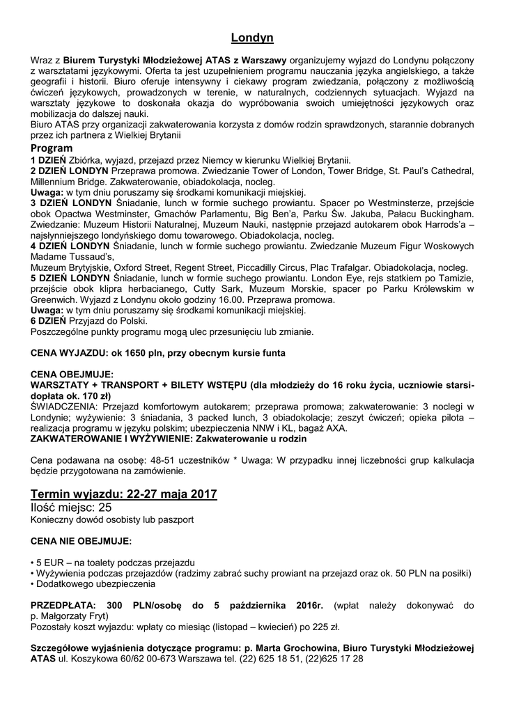 Londyn Wraz z Biurem Turystyki Młodzieżowej ATAS z Warszawy organizujemy wyjazd do Londynu połączony z warsztatami językowymi. Oferta ta jest uzupełnieniem programu nauczania języka angielskiego, a także geografii i historii. Biuro oferuje intensywny i ciekawy program zwiedzania, połączony z możliwością ćwiczeń językowych, prowadzonych w terenie, w naturalnych, codziennych sytuacjach. Wyjazd na warsztaty językowe to doskonała okazja do wypróbowania swoich umiejętności językowych oraz mobilizacja do dalszej nauki. Biuro ATAS przy organizacji zakwaterowania korzysta z domów rodzin sprawdzonych, starannie dobranych przez ich partnera z Wielkiej Brytanii Program 1 DZIEŃ Zbiórka, wyjazd, przejazd przez Niemcy w kierunku Wielkiej Brytanii. 2 DZIEŃ LONDYN Przeprawa promowa. Zwiedzanie Tower of London, Tower Bridge, St. Paul’s Cathedral, Millennium Bridge. Zakwaterowanie, obiadokolacja, nocleg. Uwaga: w tym dniu poruszamy się środkami komunikacji miejskiej. 3 DZIEŃ LONDYN Śniadanie, lunch w formie suchego prowiantu. Spacer po Westminsterze, przejście obok Opactwa Westminster, Gmachów Parlamentu, Big Ben’a, Parku Św. Jakuba, Pałacu Buckingham. Zwiedzanie: Muzeum Historii Naturalnej, Muzeum Nauki, następnie przejazd autokarem obok Harrods’a – najsłynniejszego londyńskiego domu towarowego. Obiadokolacja, nocleg. 4 DZIEŃ LONDYN Śniadanie, lunch w formie suchego prowiantu. Zwiedzanie Muzeum Figur Woskowych Madame Tussaud’s, Muzeum Brytyjskie, Oxford Street, Regent Street, Piccadilly Circus, Plac Trafalgar. Obiadokolacja, nocleg. 5 DZIEŃ LONDYN Śniadanie, lunch w formie suchego prowiantu. London Eye, rejs statkiem po Tamizie, przejście obok klipra herbacianego, Cutty Sark, Muzeum Morskie, spacer po Parku Królewskim w Greenwich. Wyjazd z Londynu około godziny 16.00. Przeprawa promowa. Uwaga: w tym dniu poruszamy się środkami komunikacji miejskiej. 6 DZIEŃ Przyjazd do Polski. Poszczególne punkty programu mogą ulec przesunięciu lub zmianie. CENA WYJAZDU: ok 1650 pln, przy obecnym kursie funta CENA OBEJMUJE: WARSZTATY + TRANSPORT + BILETY WSTĘPU (dla młodzieży do 16 roku życia, uczniowie starsidopłata ok. 170 zł) ŚWIADCZENIA: Przejazd komfortowym autokarem; przeprawa promowa; zakwaterowanie: 3 noclegi w Londynie; wyżywienie: 3 śniadania, 3 packed lunch, 3 obiadokolacje; zeszyt ćwiczeń; opieka pilota – realizacja programu w języku polskim; ubezpieczenia NNW i KL, bagaż AXA. ZAKWATEROWANIE I WYŻYWIENIE: Zakwaterowanie u rodzin Cena podawana na osobę: 48-51 uczestników * Uwaga: W przypadku innej liczebności grup kalkulacja będzie przygotowana na zamówienie. Termin wyjazdu: 22-27 maja 2017 Ilość miejsc: 25 Konieczny dowód osobisty lub paszport CENA NIE OBEJMUJE: • 5 EUR – na toalety podczas przejazdu • Wyżywienia podczas przejazdów (radzimy zabrać suchy prowiant na przejazd oraz ok. 50 PLN na posiłki) • Dodatkowego ubezpieczenia PRZEDPŁATA: 300 PLN/osobę do 5 października 2016r. (wpłat p. Małgorzaty Fryt) Pozostały koszt wyjazdu: wpłaty co miesiąc (listopad – kwiecień) po 225 zł. należy dokonywać do Szczegółowe wyjaśnienia dotyczące programu: p. Marta Grochowina, Biuro Turystyki Młodzieżowej ATAS ul. Koszykowa 60/62 00-673 Warszawa tel. (22) 625 18 51, (22)625 17 28