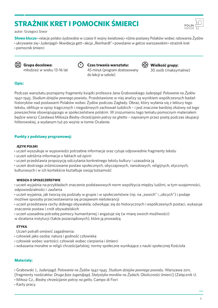 strażnik kret i pomocnik śmierci autor: Grzegorz Siwor Słowa klucze relacje polsko-żydowskie w czasie II wojny światowej różne postawy Polaków wobec ratowania Żydów ukrywanie się Judenjagd likwidacja gett akcja „Reinhardt” powstanie w getcie warszawskim strażnik kret pomocnik śmierci Grupa docelowa: młodzież w wieku 13-16 lat Czas trwania warsztatu: 45 minut (program dostosowany do lekcji w szkole) Wielkość grupy: 30 osób (maksymalnie) Opis: Podczas warsztatu poznajemy fragmenty książki profesora Jana Grabowskiego Judenjagd. Polowanie na Żydów 1942-1945. Studium dziejów pewnego powiatu. Przedstawione w niej analizy są wynikiem współczesnych badań historyków nad postawami Polaków wobec Żydów podczas Zagłady. Obraz, który wyłania się z lektury tego tekstu, obfituje w opisy tragicznych i niegodziwych zachowań ludzkich – i jest znacznie bardziej złożony od tego powszechnie obowiązującego w społeczeństwie polskim. W zrozumieniu tego tematu pomocnym materiałem będzie wiersz Czesława Miłosza Biedny chrześcijanin patrzy na ghetto – napisanym przez poetę podczas okupacji hitlerowskiej, a wydanym tuż po wojnie w tomie Ocalenie. Punkty z podstawy programowej: Język polski uczeń wyszukuje w wypowiedzi potrzebne informacje oraz cytuje odpowiednie fragmenty tekstu uczeń odróżnia informacje o faktach od opinii uczeń przedstawia propozycję odczytania konkretnego tekstu kultury i uzasadnia ją uczeń dostrzega zróżnicowanie postaw społecznych, obyczajowych, narodowych, religijnych, etycznych, kulturowych i w ich kontekście kształtuje swoją tożsamość wiedza o społeczeństwie uczeń wyjaśnia na przykładach znaczenie podstawowych norm współżycia między ludźmi, w tym wzajemności, odpowiedzialności i zaufania uczeń wyjaśnia, jak tworzą się podziały w grupie i w społeczeństwie (np. na „swoich” i „obcych”) i podaje możliwe sposoby przeciwstawiania się przejawom nietolerancji uczeń przedstawia cechy dobrego obywatela; odwołując się do historycznych i współczesnych postaci, wykazuje znaczenie postaw i cnót obywatelskich uczeń uzasadnia potrzebę pomocy humanitarnej i angażuje się (w miarę swoich możliwości) w działania instytucji (także pozarządowych), które ją prowadzą Etyka Uczeń potrafi omówić zagadnienia: człowiek jako osoba; natura i godność człowieka człowiek wobec wartości; człowiek wobec cierpienia i śmierci wskazania moralne w religii chrześcijańskiej; normy społeczne wynikające z nauki społecznej Kościoła Materiały: Grabowski J., Judenjagd. Polowanie na Żydów 1942-1945. Studium dziejów pewnego powiatu. Warszawa 2011, [fragmenty rozdziałów: Druga faza Jugendjagd, Statystyka mordów na Żydach, Okoliczności śmierci] (Załącznik 1). Miłosz Cz., Biedny chrześcijanin patrzy na getto, Campo di Fiori Karty pracy. 1 Strażnik kret i pomocnik śmierci Przebieg warsztatu (45 minut): 1. Uczestników warsztatu dzielimy na pięć grup. Rozdajemy wszystkim dwie karty pracy do analizy tekstów Jana Grabowskiego i Czesława Miłosza. 2. Uczestnicy analizują fragmenty książki Jana Grabowskiego Judenjagd. Polowanie na Żydów 1942-1945. Studium dziejów pewnego powiatu. Pracując w grupach z fragmentami tekstu, uczestnicy przygotowują wypowiedź zawierającą wnioski z tekstu Jana Grabowskiego. Prezentacja kolejnych wypowiedzi młodzieży może wywołać dyskusję, której nie należy unikać (25 minut). 3. Kolejny etap to próba analizy wiersza Miłosza Biedny chrześcijanin patrzy na ghetto. Lektura tekstu powinna stanowić komentarz do rozdziałów książki Jana Grabowskiego i emocji samych uczestników warsztatu (20 minut). 2 Strażnik kret i pomocnik śmierci karta pracy Jan Grabowski, Judenjagd. Polowanie na Żydów 1942-1945. Studium dziejów pewnego powiatur, 2011 1. Wskaż zawarte w tekście przykłady negatywnych postaw Polaków wobec ukrywających się Żydów. 2. Określ motywacje Polaków, którzy wydawali lub mordowali ukrywających się Żydów podczas okupacji hitlerowskiej. 3. Oceń reakcje społeczeństwa polskiego na przypadki wydawania i mordowania Żydów. 4. Przedstaw swoje wnioski z lektury w punktach. 5. Wskaż, co groziło Polakom za udzielenie pomocy Żydom. Czy kara ta zawsze była wykonywana? 3 Strażnik kret i pomocnik śmierci Czesław Miłosz, Biedny chrześcijanin patrzy na ghetto, 1945 Pszczoły obudowują czerwoną wątrobę Mrówki obudowują czarną kość Rozpoczyna się rozdzieranie, deptanie jedwabi, Rozpoczyna się tłuczenie szkła, drzewa, miedzi, niklu, srebra, pian Gipsowych, blach, strun, trąbek, kiści, kul, kryształów Pyk! Fosforyczny ogień z żółtych ścian Pochłania ludzkie i zwierzęce włosie. Pszczoły odbudowują plastry płuc Mrówki odbudowują białą kość, Rozdzierany jak papier, kauczuk, płótno, skóra, len Włókna, materie, celuloza, włos, wężowa łyska, druty Wali się w ogniu dach, ściana i żar ogarnia fundament. Jest już tylko piaszczysta, zdeptana z jednym drzewem bez liści Ziemia Powoli, drążąc tunel posuwa się strażnik - kret Z małą czerwoną latarką przypiętą na czole Dotyka ciał pogrzebanych, liczy, przedziera się dalej Rozróżnia ludzki popiół po tęczującym oparze Popiół każdego człowieka po innej barwie tęczy Pszczoły odbudowują czerwony ślad Mrówki odbudowują miejsce po moim ciele. Boję się, tak się boję strażnika - kreta. Jego powieka obrzmiała jak u patriarchy, Który siadywał dużo w blasku świec Czytając wielką księgę gatunku. Cóż powiem mu, ja, Żyd Nowego Testamentu Czekający od dwóch tysięcy lat na powrót Jezusa? Może rozbite ciało wyda mnie jego spojrzeniu I policzy mnie między pomocników śmierci Nieobrzezanych. 4 Strażnik kret i pomocnik śmierci Czesław Miłosz, Biedny chrześcijanin patrzy na ghetto, 1945 1. Wydziel z tekstu wiersza Miłosza sceny obrazujące ruiny, śmierć i zniszczenie. 2. Rozpoznaj wydarzenia, któryc