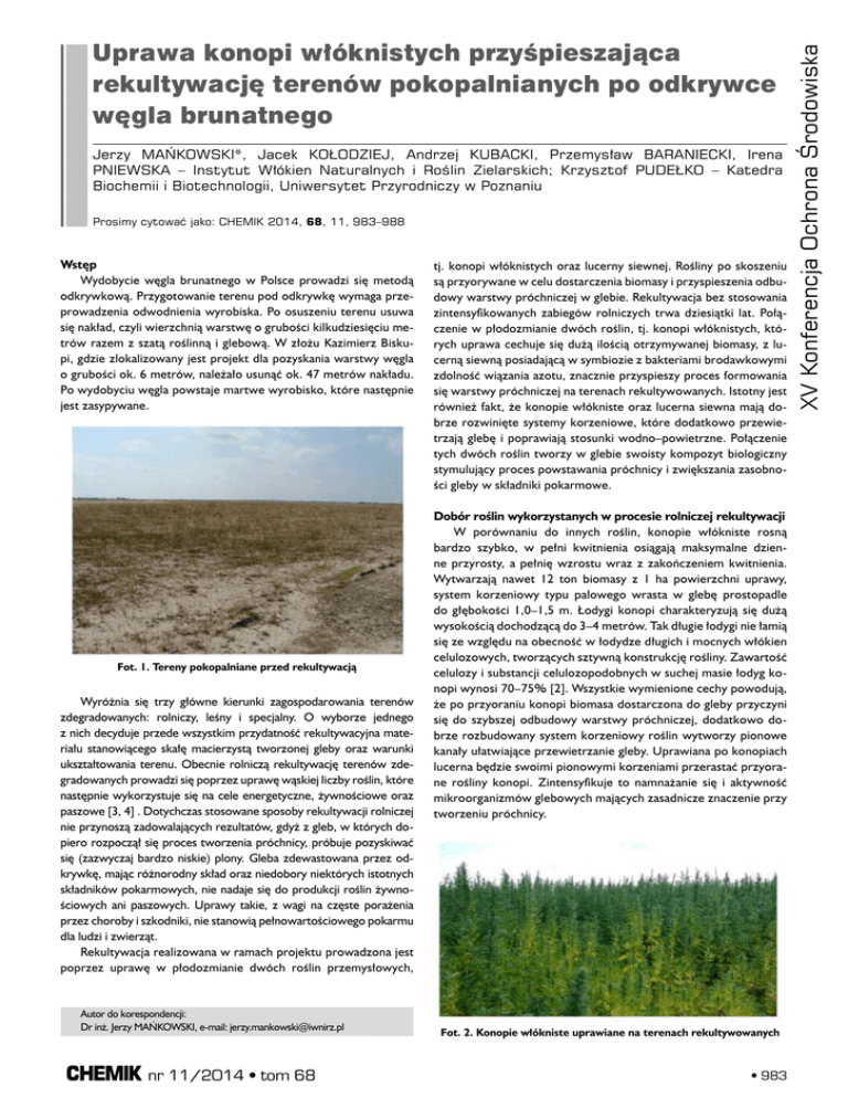 Jerzy MAŃKOWSKI*, Jacek KOŁODZIEJ, Andrzej KUBACKI, Przemysław BARANIECKI, Irena PNIEWSKA – Instytut Włókien Naturalnych i Roślin Zielarskich; Krzysztof PUDEŁKO – Katedra Biochemii i Biotechnologii, Uniwersytet Przyrodniczy w Poznaniu Prosimy cytować jako: CHEMIK 2014, 68, 11, 983–988 Wstęp Wydobycie węgla brunatnego w Polsce prowadzi się metodą odkrywkową. Przygotowanie terenu pod odkrywkę wymaga przeprowadzenia odwodnienia wyrobiska. Po osuszeniu terenu usuwa się nakład, czyli wierzchnią warstwę o grubości kilkudziesięciu metrów razem z szatą roślinną i glebową. W złożu Kazimierz Biskupi, gdzie zlokalizowany jest projekt dla pozyskania warstwy węgla o grubości ok. 6 metrów, należało usunąć ok. 47 metrów nakładu. Po wydobyciu węgla powstaje martwe wyrobisko, które następnie jest zasypywane. Fot. 1. Tereny pokopalniane przed rekultywacją Wyróżnia się trzy główne kierunki zagospodarowania terenów zdegradowanych: rolniczy, leśny i specjalny. O wyborze jednego z nich decyduje przede wszystkim przydatność rekultywacyjna materiału stanowiącego skałę macierzystą tworzonej gleby oraz warunki ukształtowania terenu. Obecnie rolniczą rekultywację terenów zdegradowanych prowadzi się poprzez uprawę wąskiej liczby roślin, które następnie wykorzystuje się na cele energetyczne, żywnościowe oraz paszowe [3, 4] . Dotychczas stosowane sposoby rekultywacji rolniczej nie przynoszą zadowalających rezultatów, gdyż z gleb, w których dopiero rozpoczął się proces tworzenia próchnicy, próbuje pozyskiwać się (zazwyczaj bardzo niskie) plony. Gleba zdewastowana przez odkrywkę, mając różnorodny skład oraz niedobory niektórych istotnych składników pokarmowych, nie nadaje się do produkcji roślin żywnościowych ani paszowych. Uprawy takie, z wagi na częste porażenia przez choroby i szkodniki, nie stanowią pełnowartościowego pokarmu dla ludzi i zwierząt. Rekultywacja realizowana w ramach projektu prowadzona jest poprzez uprawę w płodozmianie dwóch roślin przemysłowych, Autor do korespondencji: Dr inż. Jerzy Mańkowski, e-mail: [email protected] nr 11/2014 • tom 68 tj. konopi włóknistych oraz lucerny siewnej. Rośliny po skoszeniu są przyorywane w celu dostarczenia biomasy i przyspieszenia odbudowy warstwy próchniczej w glebie. Rekultywacja bez stosowania zintensyfikowanych zabiegów rolniczych trwa dziesiątki lat. Połączenie w płodozmianie dwóch roślin, tj. konopi włóknistych, których uprawa cechuje się dużą ilością otrzymywanej biomasy, z lucerną siewną posiadającą w symbiozie z bakteriami brodawkowymi zdolność wiązania azotu, znacznie przyspieszy proces formowania się warstwy próchniczej na terenach rekultywowanych. Istotny jest również fakt, że konopie włókniste oraz lucerna siewna mają dobrze rozwinięte systemy korzeniowe, które dodatkowo przewietrzają glebę i poprawiają stosunki wodno–powietrzne. Połączenie tych dwóch roślin tworzy w glebie swoisty kompozyt biologiczny stymulujący proces powstawania próchnicy i zwiększania zasobności gleby w składniki pokarmowe. Dobór roślin wykorzystanych w procesie rolniczej rekultywacji W porównaniu do innych roślin, konopie włókniste rosną bardzo szybko, w pełni kwitnienia osiągają maksymalne dzienne przyrosty, a pełnię wzrostu wraz z zakończeniem kwitnienia. Wytwarzają nawet 12 ton biomasy z 1 ha powierzchni uprawy, system korzeniowy typu palowego wrasta w glebę prostopadle do głębokości 1,0–1,5 m. Łodygi konopi charakteryzują się dużą wysokością dochodzącą do 3–4 metrów. Tak długie łodygi nie łamią się ze względu na obecność w łodydze długich i mocnych włókien celulozowych, tworzących sztywną konstrukcję rośliny. Zawartość celulozy i substancji celulozopodobnych w suchej masie łodyg konopi wynosi 70–75% [2]. Wszystkie wymienione cechy powodują, że po przyoraniu konopi biomasa dostarczona do gleby przyczyni się do szybszej odbudowy warstwy próchniczej, dodatkowo dobrze rozbudowany system korzeniowy roślin wytworzy pionowe kanały ułatwiające przewietrzanie gleby. Uprawiana po konopiach lucerna będzie swoimi pionowymi korzeniami przerastać przyorane rośliny konopi. Zintensyfikuje to namnażanie się i aktywność mikroorganizmów glebowych mających zasadnicze znaczenie przy tworzeniu próchnicy. Fot. 2. Konopie włókniste uprawiane na terenach rekultywowanych • 983 XV Konferencja Ochrona Środowiska Uprawa konopi włóknistych przyśpieszająca rekultywację terenów pokopalnianych po odkrywce węgla brunatnego XV Konferencja Ochrona Środowiska Prowadzone prace – otrzymane wyniki Przed rozpoczęciem zabiegów agrotechnicznych tereny rekultywowane oczyszczono z krzewów i chwastów oraz usunięto z powierzchni pól kamienie. Masa usuniętych kamieni była tak duża, że pozostawienie ich na polu całkowicie uniemożliwiło by prowadzenie zabiegów agrotechnicznych. Obydwa pola posiadają niską zawartość boru oraz średnią zawartość manganu, miedzi, cynku i żelaza. Zestawienie średniej zawartości próchnicy na polach zdegradowanych w dwóch pierwszych latach prowadzonego projektu przedstawiono w Tablicy 3. Tablica 3 Zawartość próchnicy w glebie w dwóch pierwszych latach prowadzonej rekultywacji Tablica 1 Parametry gleby przed rozpoczęciem procesu rekultywacji Pole pH P2O5 K2O Mg B MN CU ZN FE Poziom próchnicy, % Pole Próba (przed rekultywacją) mg/100g mg/100g mg/100g mg/1000g mg/1000g mg/1000g mg/1000g mg/1000g 7,9 2,2 11,1 7,9 0,85 153 4,3 6,7 1423 7,9 2,3 13,3 10,2 1,25 134 4,7 7,5 1301 8,0 2,4 12,6 8,3 1,43 138 4,0 6,7 1319 8,1 2,9 9,9 7,0 0,68 109 2,9 5,2 1106 I I II Fosfor w glebie oznaczano metodą spektrofotometryczną; potas metodą fotometrii płomieniowej, a magnez metodą absorpcyjnej spektrometrii atomowej, pH w 1N KCI. Mikroskładniki, takie jak mangan, cynk oraz miedź, oznaczano metodą absorpcyjnej spektrometrii atomowej, a