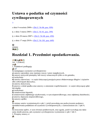 Ustawa o podatku od czynności cywilnoprawnych 1) z dnia 9 września 2000 r. (Dz.U. Nr 86, poz. 959) tj. z dnia 3 marca 2005 r. (Dz.U. Nr 41, poz. 399) tj. z dnia 28 marca 2007 r. (Dz.U. Nr 68, poz. 450) tj. z dnia 17 maja 2010 r. (Dz.U. Nr 101, poz. 649) zmiany Rozdział 1. Przedmiot opodatkowania. Art. 1 [Zakres] 1. Podatkowi podlegają: 1) następujące czynności cywilnoprawne: a) umowy sprzedaży oraz zamiany rzeczy i praw majątkowych, b) umowy pożyczki pieniędzy lub rzeczy oznaczonych tylko co do gatunku, c) (uchylona) d) umowy darowizny - w części dotyczącej przejęcia przez obdarowanego długów i ciężarów albo zobowiązań darczyńcy, e) umowy dożywocia, f) umowy o dział spadku oraz umowy o zniesienie współwłasności - w części dotyczącej spłat lub dopłat, g) (uchylona) h) ustanowienie hipoteki, i) ustanowienie odpłatnego użytkowania, w tym nieprawidłowego, oraz odpłatnej służebności, j) umowy depozytu nieprawidłowego, k) umowy spółki; 2) zmiany umów wymienionych w pkt 1, jeżeli powodują one podwyższenie podstawy opodatkowania podatkiem od czynności cywilnoprawnych, z zastrzeżeniem ust. 3 pkt 4; 3) orzeczenia sądów, w tym również polubownych, oraz ugody, jeżeli wywołują one takie same skutki prawne, jak czynności cywilnoprawne wymienione w pkt 1 lub 2. 2. Przepisy ustawy o: 1) umowie spółki i jej zmianie - stosuje się odpowiednio do aktów założycielskich spółek, statutów spółek i ich zmiany; 2) czynnościach cywilnoprawnych - stosuje się odpowiednio do przedmiotów opodatkowania określonych w ust. 1 pkt 2 i 3. 3. W przypadku umowy spółki za zmianę umowy uważa się: 1) przy spółce osobowej - wniesienie lub podwyższenie wkładu, którego wartość powoduje zwiększenie majątku spółki albo podwyższenie kapitału zakładowego, pożyczkę udzieloną spółce przez wspólnika, dopłaty oraz oddanie przez wspólnika spółce rzeczy lub praw majątkowych do nieodpłatnego używania; 2) przy spółce kapitałowej - podwyższenie kapitału zakładowego z wkładów lub ze środków spółki oraz dopłaty; 3) przekształcenie lub łączenie spółek, jeżeli ich wynikiem jest zwiększenie majątku spółki osobowej lub podwyższenie kapitału zakładowego; 4) przeniesienie na terytorium Rzeczypospolitej Polskiej z terytorium państwa niebędącego państwem członkowskim: a) rzeczywistego ośrodka zarządzania spółki kapitałowej, jeżeli jej siedziba nie znajduje się na terytorium państwa członkowskiego, b) siedziby spółki kapitałowej, jeżeli jej rzeczywisty ośrodek zarządzania nie znajduje się na terytorium państwa członkowskiego - także wtedy, gdy czynność ta nie powoduje podwyższenia kapitału zakładowego. 4. Czynności cywilnoprawne podlegają podatkowi, z zastrzeżeniem ust. 5, jeżeli ich przedmiotem są: 1) rzeczy znajdujące się na terytorium Rzeczypospolitej Polskiej lub prawa majątkowe wykonywane na terytorium Rzeczypospolitej Polskiej; 2) rzeczy znajdujące się za granicą lub prawa majątkowe wykonywane za granicą, w przypadku gdy nabywca ma miejsce zamieszkania lub siedzibę na terytorium Rzeczypospolitej Polskiej i czynność cywilnoprawna została dokonana na terytorium Rzeczypospolitej Polskiej. 5. Umowa spółki oraz jej zmiana podlega podatkowi, jeżeli w chwili dokonania czynności na terytorium Rzeczypospolitej Polskiej znajduje się: 1) w przypadku spółki osobowej - siedziba tej spółki; 2) w przypadku spółki kapitałowej: a) rzeczywisty ośrodek zarządzania albo b) siedziba tej spółki - jeżeli jej rzeczywisty ośrodek zarządzania nie znajduje się na terytorium innego państwa członkowskiego. 6. (uchylony) 7. (uchylony) 8. (uchylony) Art. 1a [Objaśnienie pojęć] Użyte w ustawie określenia oznaczają: 1) spółka osobowa - spółkę: cywilną, jawną, partnerską, komandytową lub komandytowoakcyjną; 2) spółka kapitałowa - spółkę: z ograniczoną odpowiedzialnością, akcyjną lub europejską; 3) siedziba spółki - siedzibę spółki określoną w umowie spółki; 4) rzeczywisty ośrodek zarządzania - miejscowość, w której ma siedzibę organ zarządzający spółki kapitałowej; 5) państwo członkowskie - państwo członkowskie Unii Europejskiej lub państwo członkowskie Europejskiego Porozumienia o Wolnym Handlu (EFTA) - strona umowy o Europejskim Obszarze Gospodarczym; 6) (uchylony) 7) podatek od towarów i usług - podatek od towarów i usług w rozumieniu ustawy z dnia 11 marca 2004 r. o podatku od towarów i usług (Dz.U. Nr 54, poz. 535, z późn. zm.2)) lub podatek od wartości dodanej pobierany na podstawie przepisów obowiązujących w państwach członkowskich. Art. 2 [Wyłączenia] Nie podlegają podatkowi: 1) 3) czynności cywilnoprawne w sprawach: a) alimentacyjnych, opieki, kurateli i przysposobienia, b) ubezpieczenia społecznego, ubezpieczenia zdrowotnego, opieki społecznej, ulg określonych w przepisach szczególnych dla żołnierzy niezawodowych i osób odbywających służbę zastępczą oraz ich rodzin, a także uprawnień dla osób niepełnosprawnych i osób objętych przepisami o szczególnych uprawnieniach dla kombatantów, c) wyboru Prezydenta Rzeczypospolitej Polskiej, wyborów do Sejmu, Senatu i organów samorządu terytorialnego oraz referendum, d) powszechnego obowiązku obrony, e) zatrudnienia, świadczeń socjalnych i wynagrodzeń za pracę, f) nauki, szkolnictwa i oświaty pozaszkolnej oraz zdrowia, g) podlegających przepisom o gospodarce nieruchomościami lub przepisom o autostradach płatnych, h) podlegających przepisom o szczególnych zasadach przygotowania i realizacji inwestycji w zakresie dróg krajowych, i) (uchylona) j) podlegających przepisom o szczególnych zasadach odbudowy, remontów i rozbiórek obiektów budowlanych zniszczonych lub uszkodzonych w wyniku działania żywiołu; 2) umowy sprzedaży nieruchomości lub prawa użytkowania wieczystego zawieranej w związku z realizacją roszczeń wynikających z