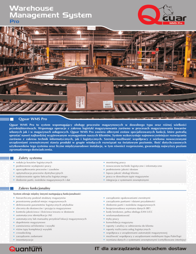Warehouse Management System Pro WMS Pro Qguar WMS Pro Qguar WMS Pro to system wspomagaj¹cy obs³ugê procesów magazynowych w dowolnego typu oraz ró¿nej wielkoœci przedsiêbiorstwach. Wspomaga operacje z zakresu logistyki magazynowania zarówno w procesach magazynowania towarów w³asnych jak i w magazynach us³ugowych. Qguar WMS Pro zawiera olbrzymi zestaw specjalizowanych funkcji, które potrafi¹ sprostaæ nawet najbardziej wygórowanym wymaganiom naszych klientów. System wykorzystuje najnowoczeœniejsze rozwi¹zania zarówno z zakresu technik informatycznych, jak i logistycznych. Szeroka mo¿liwoœæ wspó³pracy z wieloma nowoczesnymi urz¹dzeniami zewnêtrznymi stawia produkt w grupie wiod¹cych rozwi¹zañ na œwiatowym poziomie. Iloœæ dotychczasowych u¿ytkowników tego systemu oraz liczne miêdzynarodowe instalacje, w tym równie¿ rozproszone, gwarantuj¹ najwy¿szy poziom zgromadzonego doœwiadczenia. Zalety systemu § § § § § § redukcja kosztów logistycznych podniesienie wydajnoœci pracy uporz¹dkowanie procesów i zasobów optymalizacja procesów dystrybucyjnych nadzorowanie ogniw ³añcucha logistycznego œledzenie partii, noœników magazynowych i dat § § § § § § monitoring pracy nowoczesne techniki logistyczne i informatyczne podniesienie jakoœci dostaw lepsza jakoœæ obs³ugi klienta praca w dowolnym typie magazynów integracja z systemami zewnêtrznymi § § § § § § § § § § § § § zarz¹dzanie opakowaniami zwrotnymi zarz¹dzanie partiami i datami przydatnoœci œledzenie partii i noœników magazynowych bezprzewodowa wymiana danych (RF) kody kreskowe, pe³na obs³uga EAN UCC wielomandantowoœæ tryby pracy konsolidacja magazynu raporty i analizy w odniesieniu do klienta raporty rozliczania us³ug logistycznych wspó³praca z urz¹dzeniami automatyki magazynowej mo¿liwoœæ wspó³pracy z urz¹dzeniami mobilnymi (typu PalmTop) wymiana danych z systemami zewnêtrznymi (certyfikowane interfejsy) Zakres funkcjonalny System oferuje miêdzy innymi nastêpuj¹c¹ funkcjonalnoœæ: § § § § § § § § § § § § § hierarchiczny podzia³ struktury magazynów przestrzenny podzia³ miejsc magazynowych definiowanie parametrów logistycznych artyku³ów zlecenia do dostawców i przyjêcia magazynowe kontrola jakoœciowa i iloœciowa towaru w dostawie automatyczna identyfikacja (AI) automatyczny lub manualny przydzia³ lokacji magazynowych dope³nienie magazynowe zamówienia od klientów i wysy³ki ró¿ne typy kompletacji wysy³ek crossdocking zarz¹dzanie zadaniami inwentaryzacje Qguar Warehouse Management System - Pro Przegl¹d podstawowych cech systemu Inwentaryzacje Integracja urz¹dzeñ zewnêtrznych Radioterminale (RF) Wielomandantowoœæ Automatyczna identyfikacja (AI) Tryby pracy Partie, statusy jakoœci, daty przydatnoœci Konsolidacja magazynu Kompletacje Opakowania zwrotne Raportowanie na klienta Wysy³ki z magazynu EAN UCC Pe³na customizacja Qguar WMS Pro Dostawy do magazynu Zarz¹dzanie lokacjami A Zakres us³ug Quantum oprócz gotowych produktów oferuje bogat¹ paletê specjalistycznych us³ug: § § § § § projekty wdro¿eniowe (STW, SPI) § instalacje oprogramowania § szkolenia u¿ytkowników § wdro¿enia systemów asystê powdro¿eniow¹ serwis gwarancyjny i pogwarancyjny doradztwo informatyczno-logistyczne us³ugi integracyjne Przeznaczenie Qguar WMS Pro to narzêdzie wspomagaj¹ce pracê dowolnie z³o¿onego magazynu wyposa¿onego w ró¿norodn¹ gamê urz¹dzeñ magazynowych. Dedykowane jest ono przede wszystkim do magazynów o bardzo du¿ej iloœci towarów oraz du¿ej iloœci operacji magazynowych. W magazynach logistycznych pozwala miêdzy innymi na równoczesne zarz¹dzanie towarem wielu klientów koñcowych we wspólnych zasobach magazynowych. Przeznaczenie systemu to przede wszystkim centra dystrybucyjne, magazyny logistyczne oraz rozbudowane zaplecza magazynowe firm produkcyjnych. Qguar WMS Pro – przyk³adowy ekran systemu Pytaj równie¿ o inne systemy... WMS Easyway Warehouse Management Easyway TMS Transport Managment SDS SAP All-in-One Supply and Distribution Management YMS Yard Management mySAP ERP 4WEB Internet Access Dashboard VPM Voice Picking Manager Queryser Quantum software S.A. ul. Walerego S³awka 3A 30-633 Kraków tel.: +48 (012) 646 98 00 fax: +48 (012) 646 98 02 e-mail: [email protected] mySAP Business Suite