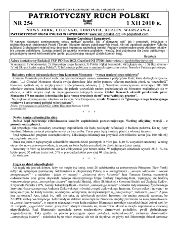 „PATRIOTYCZNY RUCH POLSKI” NR 254, 1 GRUDZIEŃ 2010 R. 1 PATRIOTYCZNY RUCH POLSKI NR 254 1 XII 2010 R . ----------------------------------------------------------------------------------------------------------------------------------------------------------------- NOWY JORK, CHICAGO, TORONTO, BERLIN, WARSZAWA. P ATRIOTYCZNY R UCH P OLSKI W INTERNECIE : www.wicipolskie.org lub polpatriot.com Drodzy Czytelnicy i Sympatycy!, W naszym biuletynie zamieszczamy teksty różnych autorów, tak „z pierwszej ręki” jak i przedruki, traktujące o najistotniejszych problemach Polski i Świata. Kluczem doboru publikowanych treści, nie jest zgodność poglądów Autorów publikacji z poglądami redakcji lecz decyduje imperatyw ważnością tematu. Poglądy prezentowane przez Autorów tekstów, nie zawsze podzielamy. Uznając jednak że wszelka wymiana poglądów i wiedzy, jest pożyteczna dla życia publicznego prezentujemy nawet kontrowersyjne opinie, pozostawiając naszym czytelnikom ich osąd. Redakcja Adres kontaktowy Redakcji PRP: PO Box 1602, Cranford NJ 07016 i internetowy: [email protected] W numerze: 1) Wiadomości; 2) Blumsztajn i jego faszyści; 3) Polski trójkąt bermudzki; 4) Lękajcie się - I; 5) Bez strachu IV; 6) Ukryci Żydzi rządzą Polską?; 7) Informacja publiczna o zamiarach syjonizmu wobec Narodu i Państwa polskiego; -------------------------------------------------------------------------------------------------------------------------------------------------------------------------------------------------------------------------------------------------------------------------------------------------------------------------------------------------------------------------------------------------------------------------------------------------------------------------------------------------------------------------------------------------------------------------------------------------------------------------------------------------------------------------------------------------------------------------------------------------------------------------------------------------� � � � � � � � � � � � � � � � � � � � � � � � � � � � � � � � � � � � � � � � � � � � � ------------------------------------------------------------------------------------------------------ Haitańscy rolnicy odrzucają darowiznę koncernu Monsanto - “wroga tradycyjnego rolnictwa” Koncern Monsanto przekazał wiele ton opatentowanych nasion, nawozów i pestycydów Haiti, które dotknęło trzęsienie ziemi. (…) Chociaż Monsanto określa swoją darowiznę jako próbę pomocy ofiarom trzęsienia ziemi, ta “szczodrość” koncernu spotkała się ze sceptycyzmem i zdecydowaną odmową. (…) Narodowe stowarzyszenie zrzeszające 200 000 członków zachęca haitańskich rolników do palenia wszystkich nasion pochodzących od Monsanto znajdujących się w obrocie, a także wzywa rząd do nieprzyjmowania kolejnych nasion. Global Research określił przekazanie przez Monsanto 475 ton nasion i chemikaliów jako “nowe trzęsienie ziemi” oraz “zabójczy prezent”. Największe stowarzyszenie rolników na świecie, Via Campesina, uznała Monsanto za “głównego wroga tradycyjnego rolnictwa i suwerennej polityki rolnej państw”. Źródło: www.naturalnews.com/029222_GMOs_Haiti.html /Nexus nr 5/2010 Za: bibula.com # # # Dania: koniec refundacji in vitro Duński rząd zaprzestaje refundowania kosztów zapłodnienia pozaustrojowego. Według oficjalnej wersji - z powodu oszczędności. Od przyszłego roku procedury sztucznego zapłodnienia nie będą podlegały refundacji z budżetu państwa. Do tej pory Fundusz Zdrowia zwracał pieniądze nawet za trzy próby. Teraz pary będą musiały płacić z własnej kieszeni. Rząd wprowadził program oszczędnościowy. Likwidacja refundacji ma przynieść 200 milionów koron [ok. 100 mln zł.] oszczędności rocznie. Dania ma jeden z najwyższych wskaźników urodzeń dzieci poczętych in vitro [ok. 8-10 % wszystkich urodzeń]. Według ekspertów nowe prawo spowoduje, że rocznie na świat będzie przychodziło około tysiąca dzieci mniej. Procedury in vitro są kosztowne, ale ich efektywność jest bardzo niska. W najlepszych ośrodkach wynosi 28-31 % dla kobiet przed 35 rokiem życia i ok. 5 % w przypadku kobiet powyżej 40 roku życia. Za: bibula.com # # # Elegia na dzień niepodległości Ale nigdy nie jest tak dobrze, żeby nie mogło być lepiej, toteż 28 października na uniwersytecie Princeton [New York] odbył się sympozjon poświęcony holokaustowi w okupowanej Polsce, a w szczególności - „nowym odkryciom i nowym interpretacjom” - z udziałem - jakże by inaczej! - „światowej sławy historyka” Jana Tomasza Grossa, rozmaitych cudzoziemców oraz grona obywateli naszego nieszczęśliwego kraju: Barbary Engelking-Boni, zajmującej się historią warszawskiego getta, „antropologa kultury” Agnieszki Haskiej, Aliny Skibińskiej z Centrum Badań nad Zagładą Żydów, Krzysztofa Persaka z IPN, Joanny Tokarskiej-Bakir - również „antropologa kultury” i członka rady naukowej Żydowskiego Instytutu Historycznego oraz Andrzeja Żbikowskiego - również z tegoż żydowskiego Instytutu. Co tam odkryli nowego - to mniejsza z tym, bo każdy rozumie, że odkrycia - odkryciami, ale najważniejsze są „interpretacje”, zwłaszcza „nowe”. A jaka jest najnowsza? Ano, jakaż by, jeśli nie taka, że tubylczych polskich Irokezów nie można zostawić samopas, bo ZNOWU zrobią coś okropnego. Toteż kiedy na dalekim uniwersytecie Princeton, między przerwami na kawę formułowane są „nowe interpretacje”, w naszym nieszczęśliwym kraju redaktor Blumsztajn nawołuje wszystkich ludzi dobrej woli by 11 listopada „wygwizdali” marsz „faszystów”, którym zamaniło się maszerować akurat w święto wspominania utraconej niepodległości. Red