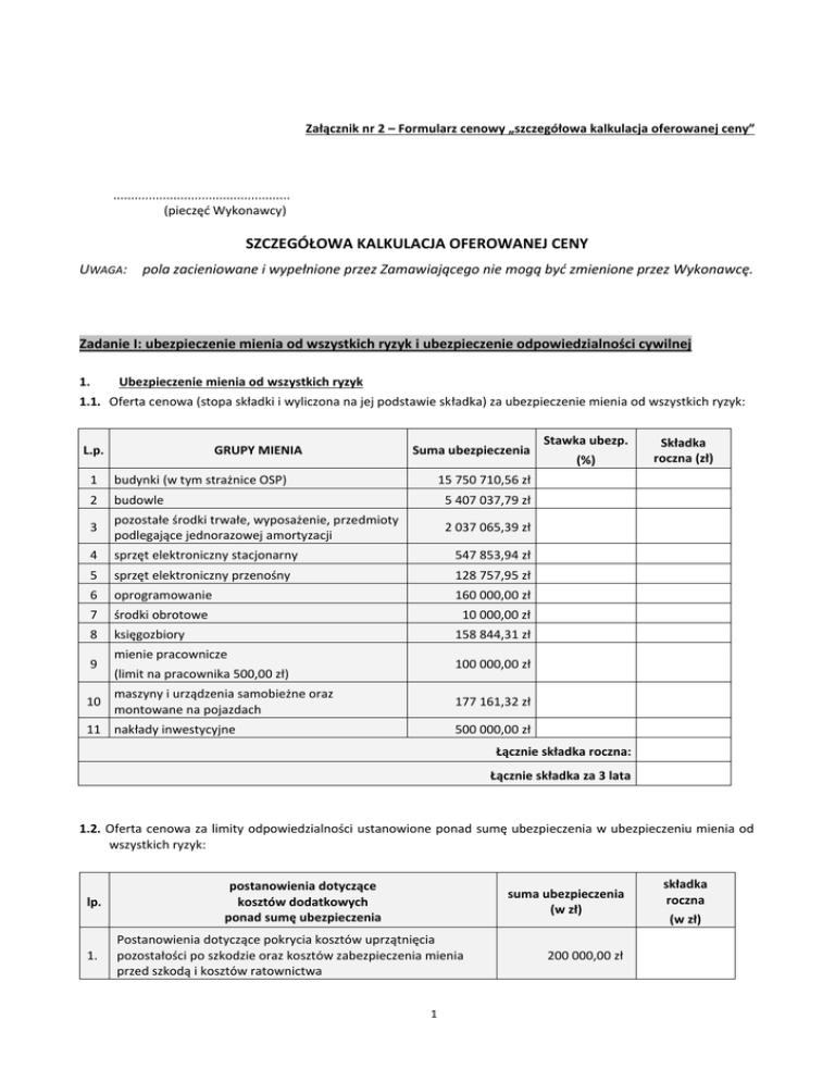 Załącznik nr 2 – Formularz cenowy „szczegółowa kalkulacja oferowanej ceny” .................................................. (pieczęć Wykonawcy) SZCZEGÓŁOWA KALKULACJA OFEROWANEJ CENY UWAGA: pola zacieniowane i wypełnione przez Zamawiającego nie mogą być zmienione przez Wykonawcę. Zadanie I: ubezpieczenie mienia od wszystkich ryzyk i ubezpieczenie odpowiedzialności cywilnej 1. Ubezpieczenie mienia od wszystkich ryzyk 1.1. Oferta cenowa (stopa składki i wyliczona na jej podstawie składka) za ubezpieczenie mienia od wszystkich ryzyk: L.p. GRUPY MIENIA Suma ubezpieczenia 1 budynki (w tym strażnice OSP) 2 budowle 5 407 037,79 zł 3 pozostałe środki trwałe, wyposażenie, przedmioty podlegające jednorazowej amortyzacji 2 037 065,39 zł 4 sprzęt elektroniczny stacjonarny 547 853,94 zł 5 sprzęt elektroniczny przenośny 128 757,95 zł 6 oprogramowanie 160 000,00 zł 7 środki obrotowe 10 000,00 zł 8 księgozbiory 9 10 Stawka ubezp. (%) Składka roczna (zł) 15 750 710,56 zł 158 844,31 zł mienie pracownicze 100 000,00 zł (limit na pracownika 500,00 zł) maszyny i urządzenia samobieżne oraz montowane na pojazdach 177 161,32 zł 11 nakłady inwestycyjne 500 000,00 zł Łącznie składka roczna: Łącznie składka za 3 lata 1.2. Oferta cenowa za limity odpowiedzialności ustanowione ponad sumę ubezpieczenia w ubezpieczeniu mienia od wszystkich ryzyk: lp. 1. postanowienia dotyczące kosztów dodatkowych ponad sumę ubezpieczenia suma ubezpieczenia (w zł) Postanowienia dotyczące pokrycia kosztów uprzątnięcia pozostałości po szkodzie oraz kosztów zabezpieczenia mienia przed szkodą i kosztów ratownictwa 1 200 000,00 zł składka roczna (w zł) 2. Postanowienia dotyczące pokrycia kosztów rzeczoznawców 20 000,00 zł 3. Postanowienia dotyczące pokrycia kosztów identyfikacji miejsc awarii 20 000,00 zł 4. Postanowienia dotyczące kosztów restytucji dokumentów 50 000,00 zł 5. Postanowienia dotyczące pokrycia kosztów odtworzenia danych i oprogramowania 50 000,00 zł Łącznie składka roczna: Łącznie składka za 3 lata 1.3. Lp. Rodzaj ubezpieczenia Składka za 3 lata (w zł) 1. Oferta cenowa za ubezpieczenie mienia od wszystkich ryzyk (pkt. 1.1.) 2. Oferta cenowa za limity ponad sumę ubezpieczenia w ubezpieczeniu mienia od wszystkich ryzyk (pkt. 1.2.) Łącznie: 2. Ubezpieczenie odpowiedzialności cywilnej Oferta cenowa za ubezpieczenie odpowiedzialności cywilnej wynikającej z prowadzonej działalności i posiadanego mienia: Lp. 1 Przedmiot ubezpieczenia Składka roczna (w zł) Suma gwarancyjna Ubezpieczenie odpowiedzialności cywilnej wynikającej z prowadzonej działalności i posiadanego mienia z uwzględnieniem klauzul, o których mowa w SIWZ 1 000 000,00 zł Łącznie składka za 3 lata 3. RAZEM do przeniesienia do Formularza „Oferta” – Zadanie I Lp. Przedmiot ubezpieczenia Składka za 3 lata (w zł) 1 Oferta cenowa za ubezpieczenie mienia od wszystkich ryzyk (pkt. 1.3) 2 Oferta cenowa za ubezpieczenie odpowiedzialności cywilnej (pkt. 2) Łącznie: do przeniesienia do Formularza „Oferta” 2 Zadanie II: ubezpieczenie następstw nieszczęśliwych wypadków Lp. Ubezpieczony Liczba ubezpieczonych 1 Członkowie Ochotniczej Straży Pożarnej oraz Młodzieżowych Drużyn Pożarniczych 120 Suma ubezpieczenia 10 000,00 zł/ os. Składka roczna za osobę w zł Łącznie składka roczna (w zł) Łącznie składka za 3 lata: do przeniesienia do Formularza „Oferta” Zadanie III: ubezpieczenie pojazdów Obowiązkowe ubezpieczenie OC posiadaczy pojazdów mechanicznych L.p. 1. 2. 3. 4. 5. 6. Rodzaj pojazdu ciężarowe pożarnicze przyczepy Pozostałe: wolnobieżne, rolnicze Ciągnik siodłowy Wóz asenizacyjny Liczba pojazdów Składka OC za pojazd Składka OC za wszystkie pojazdy 2 16 4 ciągniki 5 1 1 Łącznie składka roczna: Ubezpieczenie Autocasco L.p. Rodzaj pojazdu 1. 2. 3. ciężarowe pożarnicze przyczepy Pozostałe: wolnobieżne, ciągniki rolnicze Ciągnik siodłowy Wóz asenizacyjny 4. 5. 6. Liczba pojazdów 2 16 4 Łączna suma ubezpieczenia 47 400,00 zł 1 721 485,00 zł 2 800,00 zł 5 408 045,00 zł 1 1 23 750,00 zł 52 933,05 zł Stawka AC Składka AC za wszystkie pojazdy Łącznie składka roczna: Ubezpieczenie NNW L.p. 1. 2. 3. 4. 5. 6. Rodzaj pojazdu ciężarowe pożarnicze przyczepy Pozostałe: wolnobieżne, rolnicze Ciągnik siodłowy Wóz asenizacyjny ciągniki Liczba pojazdów Składka NNW za pojazd Składka NNW za wszystkie pojazdy 2 16 4 x x x x 5 1 1 3 Łącznie składka roczna: RAZEM do przeniesienia do Formularza „Oferta” – Zadanie III Lp. 1. 2. 3. Rodzaj ubezpieczenia Składka (w zł) Oferta cenowa za obowiązkowe ubezpieczenie OC posiadaczy pojazdów mechanicznych Ubezpieczenie Autocasco Ubezpieczenie NNW Łącznie składka roczna: Łącznie składka za 3 lata: do przeniesienia do Formularza „Oferta” L.p. Nazwa(y) Wykonawcy(ów) Nazwisko i imię osoby(osób) upoważnionej(ych) do podpisania niniejszej oferty w imieniu Wykonawcy (ów) Podpis(y) osoby (osób) upoważnionej(ych) do podpisania niniejszej oferty w imieniu Wykonawcy(ów) 4 Pieczęć(cie) Wykonawcy (ów) Miejscowość i data