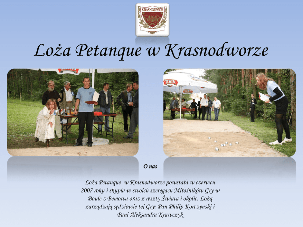 Loża Petanque w Krasnodworze O nas Loża Petanque w Krasnodworze powstała w czerwcu 2007 roku i skupia w swoich szeregach Miłośników Gry w Boule z Bemowa oraz z reszty Świata i okolic. Lożą zarządzają sędziowie tej Gry: Pan Philip Korczynski i Pani Aleksandra Krawczyk Historia W Polsce znana jest także jako boules, bule, kulki - jest grą wywodzącą się, prawdopodobnie ze starożytnej Grecji. Początkowo do Gry używano kamieni w miarę kulistych, które przez greków wyrzucane były na jak największą odległość, natomiast rzymianie preferowali precyzję - i to oni do Gry wprowadzili mały kamyczek będący celem, tak powstała najważniejsza Zasada Gry w petanque wygrywa ten, kto rzuci swoje kule jak najbliżej celu. Rzymianie jako pierwsi zaczęli do Gry używać kul zamiast kamieni, były to kule drewniane, pokryte metalem, w historii znane są przypadki stosowania do Gry kul armatnich. Obecnie używa się kul metalowych o średnicy od 70,5 do 80,0 mm i wadze 650 - 800 gram. Obecna formuła Gry jest wypadkową wersji rzymskiej i Gry z południa Francji – jeu de provencal. W 1910 roku zawodnicy francuscy postanowili uprościć zasady aby gra stała się bardziej powszechna, dzięki temu petanque rozprzestrzeniła się poza Prowansję i dotarła w każdy zakątek świata. W 1987 roku w Singapurze odbyły się pierwsze międzynarodowe zawody – „Petanque Open”, traktowane jako pierwsze Mistrzostwa Świata. Obecnie główną organizacją zrzeszającą ponad 600 000 graczy z 57 krajów jest Federation Internationale de Petanque et Jeu Provancal (FIPJP) utworzona w 1958 roku w Marsylii. Od 2003 roku jej członkiem jest również Polska Federacja Petanque – Związek Sportowy. Zasady Gry Drużynę lub osobę rozpoczynającą rozgrywkę wybiera się losowo. Gracz rozpoczynający wybiera miejsce rzutów i rysuje na ziemi okrąg, z tego okręgu rzuca się kulami stojąc obiema nogami w narysowanym okręgu. Obie stopy rzucającego muszą znajdować się wewnątrz okręgu i mieć kontakt z podłożem do momentu dotknięcia rzucaną kulą ziemi. Gracz rozpoczynający rzuca małą drewnianą kulkę na odległość 6m -1Om, zachowując odległość około 1m odstępu od końca boiska. Gracz rozpoczynający, rzuca kulą stalową możliwie blisko małej kulki. Gracz drużyny przeciwnej, przeciwnik rzucając kulą stara się umieścić swoją kulę, bliżej małej kulki albo wybić, usunąć kulę rywala. Grę kontynuuje drużyna, osoba, której kula jest dalej od małej kulki do momentu umieszczenia swojej kuli bliżej małej kulki. Gdy drużynie, osobie przegrywającej „skończą się” kule lub zrezygnuje ona z dalszych rzutów i swojej kolejki (traktuje się taką sytuację jakby drużyna, osoba wyrzuciła wszystkie kule), drużyna przeciwna, osoba stara się umieścić resztę swoich kul bliżej małej kulki. Gdy zespoły, osoby nie mają już kul następuje obliczenie punktów. Wygrywający dostaje tyle punktów, ile kul umieścił bliżej małej kulki. Drużyny (jeden z jej graczy), osoba, która wygrała rzuca małą kulką z miejsca, w którym ostatnio kulka leżała. Rozpoczyna się następna rozgrywka. Wygrywa drużyna, osoba, który pierwsza zgromadzi 13 punktów. Loża Petanque w Krasnodworze Najbliższe wydarzenie 1 czerwca 2008 odbędzie się Turniej Petanque o Puchar Przewodniczącego Rady Gminy Bemowo Pana Grzegorza Popielarza. Turniej odbędzie się w trzech kategoriach: 1. Turniej indywidualny kobiet 2. Turniej indywidualny mężczyzn 3. Turniej drużynowy (do 3 osób) Chętnych do udziału w turnieju prosimy o kontakt: Aleksandra Krawczyk 601-400-703 [email protected] Philip Korczyński 667-790-184 [email protected]