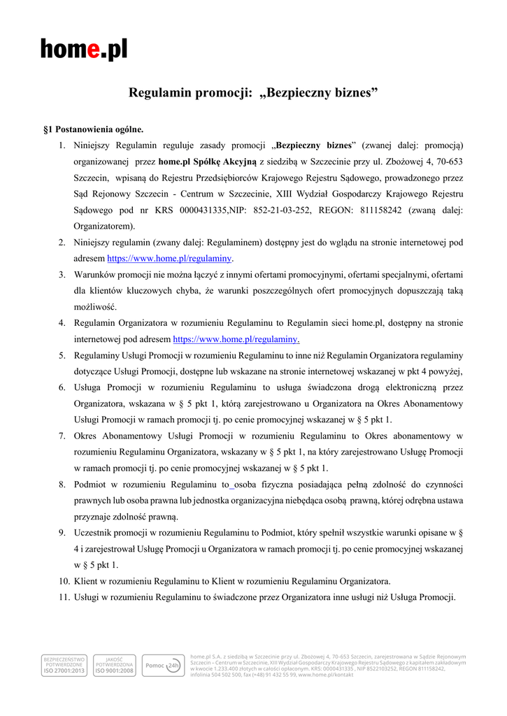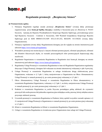 Regulamin promocji: „Bezpieczny biznes” §1 Postanowienia ogólne. 1. Niniejszy Regulamin reguluje zasady promocji „Bezpieczny biznes” (zwanej dalej: promocją) organizowanej przez home.pl Spółkę Akcyjną z siedzibą w Szczecinie przy ul. Zbożowej 4, 70-653 Szczecin, wpisaną do Rejestru Przedsiębiorców Krajowego Rejestru Sądowego, prowadzonego przez Sąd Rejonowy Szczecin - Centrum w Szczecinie, XIII Wydział Gospodarczy Krajowego Rejestru Sądowego pod nr KRS 0000431335,NIP: 852-21-03-252, REGON: 811158242 (zwaną dalej: Organizatorem). 2. Niniejszy regulamin (zwany dalej: Regulaminem) dostępny jest do wglądu na stronie internetowej pod adresem https://www.home.pl/regulaminy. 3. Warunków promocji nie można łączyć z innymi ofertami promocyjnymi, ofertami specjalnymi, ofertami dla klientów kluczowych chyba, że warunki poszczególnych ofert promocyjnych dopuszczają taką możliwość. 4. Regulamin Organizatora w rozumieniu Regulaminu to Regulamin sieci home.pl, dostępny na stronie internetowej pod adresem https://www.home.pl/regulaminy. 5. Regulaminy Usługi Promocji w rozumieniu Regulaminu to inne niż Regulamin Organizatora regulaminy dotyczące Usługi Promocji, dostępne lub wskazane na stronie internetowej wskazanej w pkt 4 powyżej, 6. Usługa Promocji w rozumieniu Regulaminu to usługa świadczona drogą elektroniczną przez Organizatora, wskazana w § 5 pkt 1, którą zarejestrowano u Organizatora na Okres Abonamentowy Usługi Promocji w ramach promocji tj. po cenie promocyjnej wskazanej w § 5 pkt 1. 7. Okres Abonamentowy Usługi Promocji w rozumieniu Regulaminu to Okres abonamentowy w rozumieniu Regulaminu Organizatora, wskazany w § 5 pkt 1, na który zarejestrowano Usługę Promocji w ramach promocji tj. po cenie promocyjnej wskazanej w § 5 pkt 1. 8. Podmiot w rozumieniu Regulaminu to osoba fizyczna posiadająca pełną zdolność do czynności prawnych lub osoba prawna lub jednostka organizacyjna niebędąca osobą prawną, której odrębna ustawa przyznaje zdolność prawną. 9. Uczestnik promocji w rozumieniu Regulaminu to Podmiot, który spełnił wszystkie warunki opisane w § 4 i zarejestrował Usługę Promocji u Organizatora w ramach promocji tj. po cenie promocyjnej wskazanej w § 5 pkt 1. 10. Klient w rozumieniu Regulaminu to Klient w rozumieniu Regulaminu Organizatora. 11. Usługi w rozumieniu Regulaminu to świadczone przez Organizatora inne usługi niż Usługa Promocji. §2 Zmiana zasad promocji. 1. Zasady promocji mogą ulec zmianie w czasie jej trwania, z tym zastrzeżeniem, że nie dotyczy to umów zawartych przed dokonaną zmianą. 2. Organizator poinformuje o zakresie zmiany na stronie internetowej, pod adresem https://www.home.pl. §3 Czas trwania promocji. 1. Promocja trwa od dnia 17 stycznia 2017 roku do dnia 30 kwietnia 2017 roku. 2. Organizator może odwołać przed upływem terminu wskazanego w pkt 1 powyżej, promocję bez podania przyczyny. 3. Organizator może przedłużyć termin trwania promocji wskazany w pkt 1 powyżej. 4. Informacja o odwołaniu promocji lub przedłużeniu terminu trwania promocji zostanie zamieszczona na stronie internetowej pod adresem https://www.home.pl. §4 Uczestnicy promocji. 1. Podmiot, który w trakcie trwania promocji: a. dokonał rejestracji Usługi Promocji u Organizatora, oraz b. zaakceptował Regulamin, oraz c. zaakceptował Regulamin Organizatora, oraz d. zaakceptował Regulaminy Usługi Promocji, oraz e. spełnił pozostałe warunki określone regulaminami wskazanymi w lit. b-d powyżej, oraz f. uiścił w całości opłaty należne z tytułu rejestracji Usługi Promocji u Organizatora, oraz g. wyraził zgodę na otrzymywanie od Organizatora oraz innych podmiotów, w tym Rejestrów Nazw Domen, Jednostek certyfikujących, wszelkich informacji określonych regulaminami wskazanymi w lit. b-d powyżej, a także innych związanych z wykonywaniem Usługi Promocji lub dotyczących innych oferowanych przez Organizatora Usług, w tym handlowych (reklamowych i marketingowych) oraz służących celom statystycznym, w szczególności badaniu poziomu satysfakcji z wykonania Usługi Promocji lub Usług, w szczególności w trybie połączenia telefonicznego lub wiadomości elektronicznej lub sms z wykorzystaniem adresu email lub numeru telefonu podanych Organizatorowi w trakcie rejestracji lub w trakcie korzystania z Usługi Promocji, oraz h. nie posiada zarejestrowanej u Organizatora i aktywnej Usługi Promocji. 2. Z warunków promocji nie mogą korzystać Podmioty, które nie dokonały płatności za Usługi lub opóźniły się z płatnością za Usługi, albo dotychczas zawarte z Organizatorem umowy wykonywały w sposób nienależyty chyba, że Organizator postanowi inaczej. §5 Opis promocji. 1. Podmioty, które spełniły warunki określone w § 4 mogą zarejestrować u Organizatora Usługę Promocji wskazaną w tabeli poniżej za cenę promocyjną w kwocie wskazanej w tabeli poniżej na Okres Abonamentowy Usługi Promocji wskazany w tabeli poniżej. Usługa Promocji Okres Abonamentowy Cena promocyjna Usługi Promocji Business Cloud Starter 1 rok 14,61 zł Click Shop Premium 1 rok 147,60 zł Click Web Basic 1 rok 103,32 zł Personal Email 1 rok 14,61 zł Click Shop 1 rok 118,08 zł Business Cloud Basic 1 rok 29,37 zł Business Cloud Server 1 rok 88,56 zł Business Cloud Unlimited 1 rok 147,60 zł Click Web Premium 1 rok 191,88 zł Click Web Unlimited 1 rok 236,16 zł Business Email 1 rok 14,61 zł Certyfikat homeSSL 1 rok 12,18 zł Kaspersky Anti-Virus 2 st. 1 rok 84,87 zł Kaspersky Internet Security 2 st. 1 rok 109,47 zł WordPress Hosting Basic 1 rok 73,80 zł WordPress Hosting 1 rok 118,08 zł WordPress Hosting Premium 1 rok 221,40 zł 1 rok 129,25 zł Business Email + Cloud Email Xchange 2. Każdy Uczestnik promocji uprawniony jest do rejestracji u Organizatora na warunkach promocji opisanych w pkt 1 powyżej, wyłącznie jednej Usługi Promocji. 3. Świadczenie otrzymane przez Uczestnika