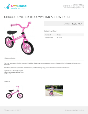 SMYKOLAND.PL ŻABNO 53, 88-342 WYLATOWO 784 387 126 lub (52) 56 99 128 CHICCO ROWEREK BIEGOWY PINK ARROW 17161 Cena: 189,90 PLN Opis słownikowy Producent Chicco Zastosowanie dla dzieci Opis produktu Pierwszy rower pociechy, który pomoże jej zdobyć niezbędną równowagę a tym samym ułatwia kolejny krok do prawdziwego roweru z pedałami. Pink Arrow jest z lekkiego metalu, ma kierownicę i siedzenie z regulacją wysokości odpowiednio do ciała dziecka. Wymiary: 12 x 45 x 60 (wys.) cm Maksymalna waga dziecka: 25kg Wiek: 3-5 lat Galeria Plik wygenerowano: 02-03-2017 Powered by TCPDF (www.tcpdf.org) Oprogramowanie sklepu: AptusShop