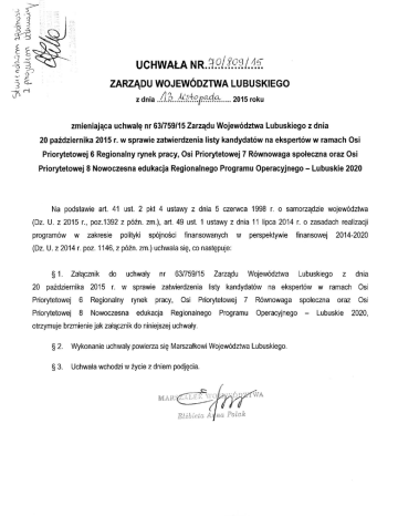 ZARZADU WOJEWODZTWA LUBUSKIEGO z dnia .A&MS&Sdfr..... 2015 roku zmieniajaca uchwal§ nr 63/759/15 Zarza^du Wojewodztwa Lubuskiego z dnia 20 pazdziernika 2015 r. w sprawie zatwierdzenia listy kandydatow na ekspertow w ramach Osi Priorytetowej 6 Regionalny rynek pracy, Osi Priorytetowej 7 Rownowaga spoteczna oraz Osi Priorytetowej 8 Nowoczesna edukacja Regionalnego Programu Operacyjnego - Lubuskie 2020 Na podstawie art. 41 ust. 2 pkt 4 ustawy z dnia 5 czerwca 1998 r. o samorzadzie wojewodztwa (Dz. U. z 2015 r., poz.1392 z pozn. zm.), art. 49 ust. 1 ustawy z dnia 11 tipca 2014 r. o zasadach realizacji programow w zakresie polityki spojnosci finansowanych w perspektywie finansowej 2014-2020 (Dz. U. z2014 r. poz. 1146, z pozn. zm.) uchwala si§, co nast§puje: § 1. Zalacznik do uchwaly nr 63/759/15 Zarzadu Wojewodztwa Lubuskiego z dnia 20 pazdziernika 2015 r. w sprawie zatwierdzenia listy kandydatow na ekspertow w ramach Osi Priorytetowej 6 Regionalny Priorytetowej 8 Nowoczesna rynek pracy, Osi Priorytetowej edukacja Regionalnego 7 Programu Rownowaga spoleczna Operacyjnego otrzymuje brzmienie jak zatacznik do niniejszej uchwaly. § 2. Wykonanie uchwaly powierza si? Marszalkowi Wojewodztwa Lubuskiego. § 3. Uchwate wchodzi w zycie z dniem podj§cia. Elzbieta Adna Polak - oraz Lubuskie Osi 2020, Nr1 ^ do Uchwatynr ..7 Zarzadu Wqjewodztwa Lubuskiego z dnia //3..&UtW^.kx.2015 roku Lista kandydatow na ekspertow w ramach Osi Priorytetowej 6 Regionalny rynek pracy, Osi Priorytetowej 7 Rownowaga spoleczna oraz Osi Priorytetowej 8 Nowoczesna edukacja Regionalnego Programu Operacyjnego- Lubuskie 2020 Lp. 1. Nazwisko i imi§ 8. 9, 10, 11. Augustowska Magdalena Anna BaJ< Monika Bileri ki-Swisterska Anna Patrycja BurnatAndrzej Cisek Tomasz Ciszewska Agnieszka Katarzyna Ciupa Rafal Czarnecka Justyna Maria Czarnecki PaweJ Dauksza Joanna Dabrowski Arkadiusz 12. 13. Derski Marek Dygoh March 14. Firlej Mafgorzata Firlej-Bylinowska Grazyna Florczyk Marek Pawef Glasek Arkadiusz 2. 3. 4. 5. 6. 7. 15. 16. 17. 18. 19. 20. 21. 22. 23. 24. 25, Gfowacki Radoslaw Grzegorz Goliriska-Gawrohska Joanna Daria Grodowska Barbara Grzes Barbara Idryjan Karolina Marta Janiak Maria Elzbieta Kaczorowski Artur Kalandyk Magdalena Jadwiga Obszar oceny (Os Priorytetowa*/ Dzialanie**) 6,7,8 [email protected] 6,7,8 6(6.2,6.3,6.4,6.5,6.6), kontakt.. [email protected] [email protected], [email protected] 7,8 6,7,8 6,7,8 8 [email protected] [email protected] [email protected] 8 6 (6.2, 6.4, 6.7) 6,7,8 6(6.3,6.4,6.5,6.6),7,8 6(6.2,6.3,6.4,6.5,6.6), 7,8 6,7,8 6(6.2,6.3,6.4,6.5,6.6), 7,8 6 {6.2, 6.3, 6.4, 6.5, 6.6), 7 6,7,8 6 (6.3, 6.4, 6.5), 8 6(6.2,6.3,6.4,6.5,6.6), 7,8 7 Adres e-mail [email protected] [email protected] [email protected] [email protected] [email protected] [email protected] [email protected] m_f [email protected] [email protected] [email protected] [email protected] [email protected] 6,7,8 [email protected] 6 (6.5) 7 6 (6.2, 6.4, 6.6), 7 6,7,8 6 (6.2, 6.3, 6.5, 6.6} 6,7,8 [email protected] [email protected] [email protected] [email protected] aa. kaczorows ki@wp. pi [email protected] 26. 33. 34. Kapela Anna Kogucka Ewa Komorkiewicz Michaf Marian Korczyhska Dorota Kotecki Marek Kubiak Dorota Jadwiga Kukielihska Paulina Barbara Kuzniar-Pelc Agnieszka Lesniewska Jolanta 35. 36. 37. 38. 39. Lewandowska Marta Lewihski Marek Maksymow Przemystew Matysik Barbara Mortka Joanna Katarzyna 40. 41, Napierala Jaroslaw Niemotko Katarzyna Sylwia Osikowska Magdalena Osowiecki Tadeusz Witold Pakuta Nina 27. 28. 29 30. 31. 32. 42. 43. 44. 45. 48. Pietrzykowska Katarzyna Anna Pizori Karolina Bronistawa Plizga Renata Bernadeta Polanowska Katarzyna 49. 50. Przybyl Jaroslaw PydzikHalina Wanda 51. Pytko Edyta Barbara Ratajczak Anna Maria Rokicki Tomasz Arkadiusz Rulihska Malgorzata Mariola Rutka Antoni Stanislaw Rutkowski Dariusz Sadowska Anna Sarwa Ewa Snop Sebastian Stefanski Jarostaw Szczesniak Marcin Tryba - Taborska Katarzyna Tyc Andrzej Wasik Radoslaw Wiankowski Rafat 46. 47. 52 53. 54. 55. 56. 57. 58. 59. 60. 61. 62. 63. 64. 65. 8 6 (6.4, 6.7), 7 8 6,7,8 6 (6.2, 6.3, 6.4,6.5,6.6), 8 6,8 6(6.2,6.3,6.4,6.5,6.6), 7,8 6,7,8 6(6.2,6,3,6.4,6.5,6.6), 7,8 6,7,8 6 (6.2, 6.4), 7 7,8 6 (6.2, 6.7), 7, 8 6(6.2,6.3,6.4,6,5,6.6), 7,8 6,7,8 6,7,8 [email protected] [email protected] [email protected] [email protected] [email protected] [email protected] [email protected] [email protected] [email protected] [email protected] [email protected] [email protected] [email protected] [email protected] [email protected] [email protected] 8 6,7,8 6(6.2,6.3,6,4,6.5,6.6), 7,8 6 (6.2, 6.3, 6.4, 6.5, 6.6), 8 [email protected] [email protected] [email protected] 8 8 6(6.2,6.3,6.4,6.5,6.6), 7,8 8 6,7 [email protected] [email protected] [email protected] 6,7 6,7,8 6 (6.2, 6.4, 6.5, 6.6), 7, 8 6,7,8 6,7,8 6,8 6(6.2,6.4,6.6) 6,7,8 6,7,8 6,7,8 6 (6.2, 6.3, 6.4, 6.6), 7, 8 6(6.2,6.3,6.4,6.5,6.6), 7,8 6,7,8 6 (6.2, 6.4, 6.6), 8 6 (6.2, 6.3, 6.4, 6.6), 7, 8 [email protected] [email protected] [email protected] [email protected] [email protected] [email protected] [email protected] [email protected] [email protected] [email protected] [email protected] [email protected] [email protected] [email protected] [email protected] [email protected] [email protected] [email protected] [email protected] Wojciech 66. 67. Winter Krzysztof Wrobel Katarzyna Justyna 6,7,8 6,7,8 [email protected] [email protected] * W przypadku wskazania samej Osi Priorytetowej (tj. braku wskazania DziaJari) osoba zostaje kandydatem na eksperta w ramach catej Osi Priorytetowej (tj. w ramach wszystkich Dzialari w danym Priorytecie, o ktore istniala mozliwosc wnioskowania na etapie skladania wniosku tj. w przypadku Osi Priorytetowej 6: Dzialania 6.2, 6.3, 6.4, 6.5, 6.6, 6.7, cata 0£ Priorytetowa 7, cafa Os Priorytetowa 8) ** W przypadku wskazania Dzialania/h osoba zostaje kandydatem na eksperta tylko w ramach tych Dziatan w danej Osi Priorytetowej, ktore zostafy wyszczegolnione.