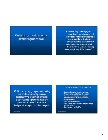 Kultura organizacji jest zespoł zespołem podstawowych zał założeń, któ które dana grupa ustanowił ustanowiła w trakcie pokonywania problemó problemów adaptacji do otoczenia i budowania wewnę wewnętrznej integracji /wg E.Scheina/. E.Scheina/. Kultura organizacyjna przedsiębiorstwa © Piotr Wachowiak © Piotr Wachowiak Kultura organizacyjna to: Kultura danej grupy jest jakby jej kodem genetycznym zapisanym w świadomoś wiadomości społ społecznej i powodują powodującym powtarzalność powtarzalność zachowań zachowań indywidualnych i zbiorowych. © Piotr Wachowiak Tradycje, wartoś wartości, normy. Niewidzialny łańcuch reguł reguł. Pas transmisyjny mię między przeszł przeszłością cią a przyszł przyszłością cią. Drogowskaz. Coś Coś co motywuje. Coś Coś, do czego ludzie się się stosują stosują, akceptują akceptują. Społ Społeczny „ klej ”. © Piotr Wachowiak 1 SYSTEMY SYMBOLI Szczeble kulturowe JĘZYK SYSTEM SYMBOLI : NORMY I STANDARDY ZAŁOŻENIA PODSTAWOWE © Piotr Wachowiak RYTUAŁ RYTUAŁY UBRANIA FORMY STOSUNKÓ STOSUNKÓW © Piotr Wachowiak ZAŁ ZAŁOŻENIA PODSTAWOWE NORMY I STANDARDY MAKSYMY IDEOLOGIE ZAKAZY WYTYCZNE ZACHOWAŃ ZACHOWAŃ © Piotr Wachowiak WIDOCZNE, ALE WYMAGAJĄ WYMAGAJĄCE INTERPRETACJI CZĘŚ CIOWO CZĘŚCIOWO WIDOCZNE CZĘŚ CIOWO CZĘŚCIOWO NIEŚ NIEŚWIADOME STOSUNEK DO OTOCZENIA PRAWDA NATURA CZŁ CZŁOWIEKA NATURA LUDZKICH DZIAŁ DZIAŁAŃ NATURA LUDZKICH STOSUNKÓ STOSUNKÓW NIEWIDOCZNE NAJCZĘŚ CIEJ NAJCZĘŚCIEJ NIEŚ NIEŚIWADOME © Piotr Wachowiak 2 UWARUNKOWANIA KULTURY ORGANIZACYJNEJ Wymiary narodowej kultury Badania G. Hofstede TYP OTOCZENIA TYP ORGANIZACJI KULTURA CECHY UCZESTNIKÓW CECHY ORGANIZACJI © Piotr Wachowiak © Piotr Wachowiak DYSTANS WŁ WŁADZY Mał Mały dystans wł władzy: Duż Duży dystans wł władzy: nieró nierównomierność wnomierność społ społeczna jest naganna i powinna być być minimalizowana nieró nierówność wność jest naturalna i zapewnia w społ społeczeń eczeństwie ład i porzą porządek wszyscy ludzie są są od siebie wzajemnie zależ zależni hierarchia - to nieró nierówność wność ról niektó niektórzy ludzie powinni być być niezależ niezależni, pozostali - zależ zależni od innych osoby mają mające wł władzę adzę mają mają prawo do specjalnych przywilejó przywilejów winę dy ponoszą winę za błę błędy ponoszą ci podwł podwładni, któ którzy źle wykonują wykonują polecenia zwierzchnik powinien utrzymywać utrzymywać stał stały kontakt z pracownikami władza powinna być być legalna i poddawana stał stałej kontroli, aby był była sprawowana w sposó sposób etyczny system ponosi winę dy winę za błę błędy przeł przełożeni i podwł podwładni pracują pracują razem i są są sobie potrzebni © Piotr Wachowiak podwł podwładni są są stał stałym zagroż zagrożeniem dla zwierzchnika - dążą do przeję przejęcia władzy i nie moż można im ufać ufać istnieje ukryty konflikt mię między tymi, któ którzy mają mają władzę adzę, a tymi, któ którzy są jej pozbawieni dystans wł władzy, indywidualizm \ kolektywizm, męskość skość,, unikanie niepewnoś niepewności. INDYWIDUALIZM - KOLEKTYWIZM Indywidualizm: czł człowiek jest niezależ niezależną jednostką jednostką czł człowiek przystę przystępuje do organizacji, ponieważ ponieważ widzi w tym wł własny interes waż ważne są są osią osiągnię gnięcia i inicjatywa; ideał ideałem jest przywó przywództwo każ każdy ma prawo do życia prywatnego i nikt nie powinien w nie ingerować ingerować zaufanie do decyzji indywidualnych każ każdy jest kowalem swego losu Kolektywizm: czł cią ą wię człowiek jest częś części większej grupy: rodziny, klanu, narodu czł człowiek angaż angażuje się się uczuciowo i moralnie w dział działalność alność organizacji waż ważna jest przynależ przynależność ność do organizacji; ideał ideałem jest uczestniczenie życie prywatne jest podporzą podporządkowane dobru społ społecznemu zaufanie do decyzji grupowych jesteś jesteśmy odpowiedzialni za naszych bliź bliźnich © Piotr Wachowiak 3 UNIKANIE NIEPEWNOŚ NIEPEWNOŚCI MĘSKOŚĆ SKOŚĆ - KOBIECOŚĆ KOBIECOŚĆ Męskość skość:: liczy się się efekt Kobiecość Kobiecość:: waż ważna jest jakość jakość życia żyje się się po to, by pracować pracować pracuje się się po to, by żyć waż ważne są są pienią pieniądze i przedmioty waż ważni są są ludzie i przyroda ambicja motywuje do dział działania podziwia się się tych, któ którzy osią osiągnę gnęli sukces; nieudacznicy nie zasł zasługują ugują na uwagę uwagę duż duże jest wspaniał wspaniałe kto pierwszy ten lepszy jeś jeśli przepisy nie są są przestrzegane należ należy je zmienić zmienić mał małe jest pię piękne spiesz się się powoli duż duże zaufanie do zdrowego rozsą rozsądku jeś jeśli przepisy nie są są przestrzegane, należ należy ukarać ukarać winnych nieprzestrzegania ich ufa się się tylko ekspertom © Piotr Wachowiak każ każdy dzień dzień trzeba przyjmować przyjmować z radoś radością cią i otwartoś otwartością cią cięż ka praca, sama dla siebie, nie jest ciężka cnotą cnotą Kultura pozytywna i negatywna. Kultura introwertyczna i ekstrawertyczna. Kultura zachowawcza i innowacyjna. Kultura mę męska i kobieca. Kultura biurokratyczna i pragmatyczna. Kultura elitarna i kultura egalitarna. Kultura silna i sł słaba. © Piotr Wachowiak konflikty mogą mogą być być wykorzystywane w sposó sposób konstruktywny; należ należy przestrzegać przestrzegać zasad fair play różnica zdań zdań jest akceptowana; należ należy okazywać okazywać tolerancję tolerancję i szacunek wobec tego co odmienne mał małe nasilenie nacjonalizmu duż duży szacunek społ społeczny dla ludzi młodych przyszł przyszłość jest zagroż zagrożeniem; niespodzianki