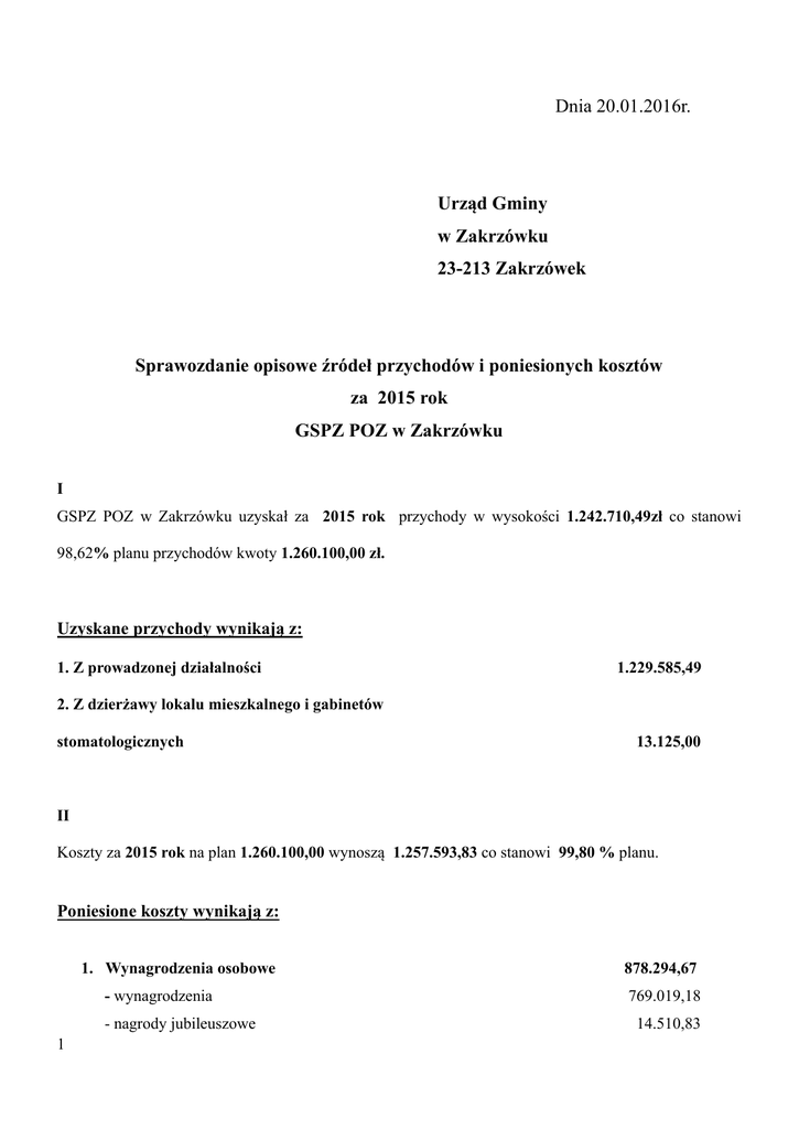 Dnia 20.01.2016r. Urząd Gminy w Zakrzówku 23-213 Zakrzówek Sprawozdanie opisowe źródeł przychodów i poniesionych kosztów za 2015 rok GSPZ POZ w Zakrzówku I GSPZ POZ w Zakrzówku uzyskał za 2015 rok przychody w wysokości 1.242.710,49zł co stanowi 98,62% planu przychodów kwoty 1.260.100,00 zł. Uzyskane przychody wynikają z: 1. Z prowadzonej działalności 1.229.585,49 2. Z dzierżawy lokalu mieszkalnego i gabinetów stomatologicznych 13.125,00 II Koszty za 2015 rok na plan 1.260.100,00 wynoszą 1.257.593,83 co stanowi 99,80 % planu. Poniesione koszty wynikają z: 1. Wynagrodzenia osobowe - wynagrodzenia - nagrody jubileuszowe 1 878.294,67 769.019,18 14.510,83 - świadczenia urlopowe - wynagrodzenia chorobowe 19.964,23 4.691,00 - umowy zlecenia 17.260,00 - umowy cywilne 42.358,00 - odprawy emerytalne 10.327,50 - ekwiwalent za urlop 163,93 2. Składki ZUS od wynagrodzeń 3. Fundusz Pracy 133.838,59 12.668,77 4. Szkolenia pracowników 2.545,00 5. Koszty podróży służbowych w tym: 2.682,08 - delegacje - ryczałty dla lekarzy i pielęgniarek 6. Zakup materiałów, w tym: 2.575,68 44.163,50 - zakup materiałów jednorazowego użytku 8.571,11 - zakup leków 6.297,66 - zakup odczynników chemicznych 1.446,42 - zakup materiałów czystościowych 3.867,22 zakup materiałów biurowych 5.613,58 - zakup recept i druków medycznych 2.212,33 - zużycie paliwa do ambulansu 4.685,49 - zakup węgla 2.941,60 - zakup oleju grzewczego 4.592,50 - pozostałe koszty materiałowe 3.935,59 7. Zakup wyposażenia, w tym: 2 106,40 4.534,98 - zakup notebooka LENOVO 1.399,00 - zakup kosiarki do trawy 1.638,00 - zakup lodówki 399,99 - zakup kuchenki mikrofalowej 199,00 - - zakup ciśnieniomierzy 2szt - zakup wziernika do otoskopu 80,00 - zakup urządzenia wielofunkcyjnego HP 329,00 - zakup telefonu Panasonic 149,99 8. Zakup energii, wody i ciepła 20.571,61 - woda 1.769,85 - ciepło 10.648,73 - energia 8.153,03 9. Zakup usług pozostałych, w tym: 100.102,11 - usługi pocztowo – telekomunikacyjne 7.336,38 - utylizacja 1.506,60 - usługi prawnicze 4.920,00 - usługi medyczne obce 66.654,30 - wywóz nieczystości płynnych 1.466,53 - usługi biura BHP 2.952,00 - przeglądy sprzętu p.poż. i inne 3.526,38 - konserwacja i dozór windy 2.952,00 - podatki i opłaty 1.817,99 - pozostałe koszty i usługi 6.925,65 - dzierżawa pojemnika na śmieci 10. Ubezpieczenia i inne opłaty 3 340,00 44,28 7.654,58 11. Zakup ubrań roboczych i ekwiwalenty 11.769,33 12. Amortyzacja 19.171,00 13. Prowizje bankowe i odsetki od kredytu 12.722,47 - prowizje i opłaty bankowe 3.945,46 - odsetki od kredytu 8.777,01 14. Wykonanie ogrodzenia 6.875,14 Ośrodka Zdrowia w Studziankach Należności na 31-12-2015 r. stanowią kwotę 100.438,99zł i są to należności od NFZ i inne. Zobowiązania na 31-12-2015 r. łącznie z kredytem stanowią kwotę 173.022,60zł w tym zobowiązania bieżące wobec ZUS, Urzędu Skarbowego i inne to 49.882,50 zł oraz kredyt 123.140,10zł. Dnia 20-01-2016r. Alina Wnuczek Główny Księgowy 4 Jacek Sygacz Dyrektor