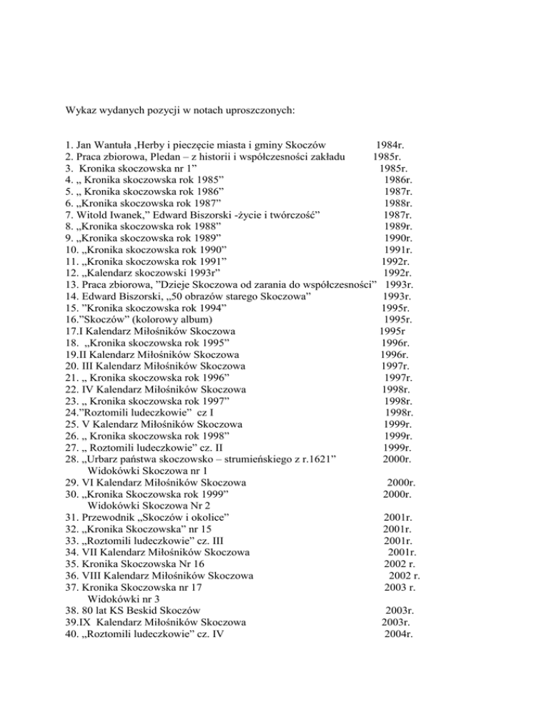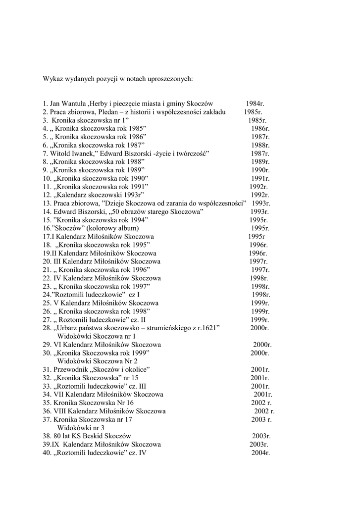 Wykaz wydanych pozycji w notach uproszczonych: 1. Jan Wantuła ,Herby i pieczęcie miasta i gminy Skoczów 1984r. 2. Praca zbiorowa, Pledan – z historii i współczesności zakładu 1985r. 3. Kronika skoczowska nr 1” 1985r. 4. „ Kronika skoczowska rok 1985” 1986r. 5. „ Kronika skoczowska rok 1986” 1987r. 6. „Kronika skoczowska rok 1987” 1988r. 7. Witold Iwanek,” Edward Biszorski -życie i twórczość” 1987r. 8. „Kronika skoczowska rok 1988” 1989r. 9. „Kronika skoczowska rok 1989” 1990r. 10. „Kronika skoczowska rok 1990” 1991r. 11. „Kronika skoczowska rok 1991” 1992r. 12. „Kalendarz skoczowski 1993r” 1992r. 13. Praca zbiorowa, ”Dzieje Skoczowa od zarania do współczesności” 1993r. 14. Edward Biszorski, „50 obrazów starego Skoczowa” 1993r. 15. ”Kronika skoczowska rok 1994” 1995r. 16.”Skoczów” (kolorowy album) 1995r. 17.I Kalendarz Miłośników Skoczowa 1995r 18. „Kronika skoczowska rok 1995” 1996r. 19.II Kalendarz Miłośników Skoczowa 1996r. 20. III Kalendarz Miłośników Skoczowa 1997r. 21. „ Kronika skoczowska rok 1996” 1997r. 22. IV Kalendarz Miłośników Skoczowa 1998r. 23. „ Kronika skoczowska rok 1997” 1998r. 24.”Roztomili ludeczkowie” cz I 1998r. 25. V Kalendarz Miłośników Skoczowa 1999r. 26. „ Kronika skoczowska rok 1998” 1999r. 27. „ Roztomili ludeczkowie” cz. II 1999r. 28. „Urbarz państwa skoczowsko – strumieńskiego z r.1621” 2000r. Widokówki Skoczowa nr 1 29. VI Kalendarz Miłośników Skoczowa 2000r. 30. „Kronika Skoczowska rok 1999” 2000r. Widokówki Skoczowa Nr 2 31. Przewodnik „Skoczów i okolice” 2001r. 32. „Kronika Skoczowska” nr 15 2001r. 33. „Roztomili ludeczkowie” cz. III 2001r. 34. VII Kalendarz Miłośników Skoczowa 2001r. 35. Kronika Skoczowska Nr 16 2002 r. 36. VIII Kalendarz Miłośników Skoczowa 2002 r. 37. Kronika Skoczowska nr 17 2003 r. Widokówki nr 3 38. 80 lat KS Beskid Skoczów 2003r. 39.IX Kalendarz Miłośników Skoczowa 2003r. 40. „Roztomili ludeczkowie” cz. IV 2004r. 41. Kronika Skoczowska nr 18 42. X Kalendarz Miłośników Skoczowa 2005 43. Kronika Skoczowska nr 19 44. Studia z dziejów Skoczowa w czasach nowożytnych 45.XI Kalendarz Miłośników Skoczowa na 2006 r. 46. Tadeusz Kopoczek, „Ostatni strzał” 47. Kronika Skoczowska nr 20 Widokówki Skoczowa nr 4 48. XII Kalendarz Miłośników Skoczowa 49. Karol Kajzer „Dzieje wsi Ochaby” 50. Kronika Skoczowska nr 21 51. XIII Kalendarz Miłośników Skoczowa 52. Kronika Skoczowska nr 22 53. XIV Kalendarz Miłośników Skoczowa 54. Kronika Skoczowska nr 23 55. XV Kalendarz Miłośników Skoczowa Widokówki Skoczowa nr 5 56. Kronika Skoczowska nr 24 57. Kronika Skoczowska nr 25 58. XVI Kalendarz Miłośników Skoczowa 2004r. 2004r. 2005r. 2005r. 2005r. 2006r. 2006r. 2007r. 2007 r. 2007 r. 2008 r. 2008 r. 2009 r. 2009 r. 2010 r. 2012 r. 2013 r. 2014 r.