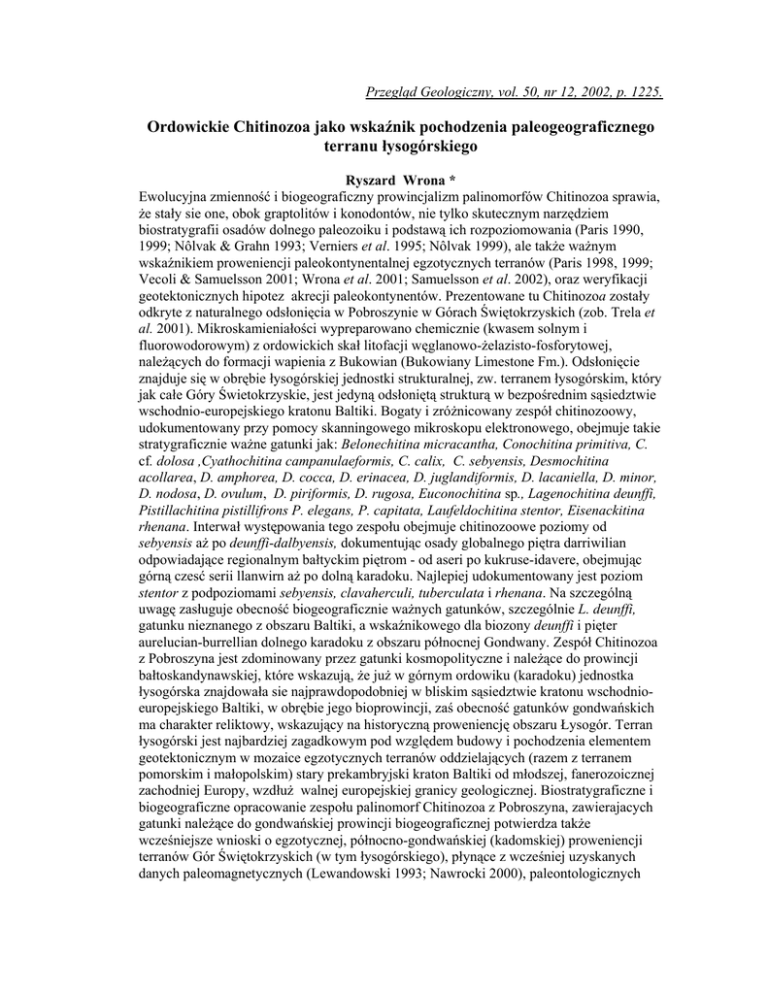 Przegląd Geologiczny, vol. 50, nr 12, 2002, p. 1225. Ordowickie Chitinozoa jako wskaźnik pochodzenia paleogeograficznego terranu łysogórskiego Ryszard Wrona * Ewolucyjna zmienność i biogeograficzny prowincjalizm palinomorfów Chitinozoa sprawia, że stały sie one, obok graptolitów i konodontów, nie tylko skutecznym narzędziem biostratygrafii osadów dolnego paleozoiku i podstawą ich rozpoziomowania (Paris 1990, 1999; Nôlvak & Grahn 1993; Verniers et al. 1995; Nôlvak 1999), ale także ważnym wskaźnikiem proweniencji paleokontynentalnej egzotycznych terranów (Paris 1998, 1999; Vecoli & Samuelsson 2001; Wrona et al. 2001; Samuelsson et al. 2002), oraz weryfikacji geotektonicznych hipotez akrecji paleokontynentów. Prezentowane tu Chitinozoa zostały odkryte z naturalnego odsłonięcia w Pobroszynie w Górach Świętokrzyskich (zob. Trela et al. 2001). Mikroskamieniałości wypreparowano chemicznie (kwasem solnym i fluorowodorowym) z ordowickich skał litofacji węglanowo-żelazisto-fosforytowej, należących do formacji wapienia z Bukowian (Bukowiany Limestone Fm.). Odsłonięcie znajduje się w obrębie łysogórskiej jednostki strukturalnej, zw. terranem łysogórskim, który jak całe Góry Świetokrzyskie, jest jedyną odsłoniętą strukturą w bezpośrednim sąsiedztwie wschodnio-europejskiego kratonu Baltiki. Bogaty i zróżnicowany zespół chitinozoowy, udokumentowany przy pomocy skanningowego mikroskopu elektronowego, obejmuje takie stratygraficznie ważne gatunki jak: Belonechitina micracantha, Conochitina primitiva, C. cf. dolosa ,Cyathochitina campanulaeformis, C. calix, C. sebyensis, Desmochitina acollarea, D. amphorea, D. cocca, D. erinacea, D. juglandiformis, D. lacaniella, D. minor, D. nodosa, D. ovulum, D. piriformis, D. rugosa, Euconochitina sp., Lagenochitina deunffi, Pistillachitina pistillifrons P. elegans, P. capitata, Laufeldochitina stentor, Eisenackitina rhenana. Interwał występowania tego zespołu obejmuje chitinozoowe poziomy od sebyensis aż po deunffi-dalbyensis, dokumentując osady globalnego piętra darriwilian odpowiadające regionalnym bałtyckim piętrom - od aseri po kukruse-idavere, obejmując górną czesć serii llanwirn aż po dolną karadoku. Najlepiej udokumentowany jest poziom stentor z podpoziomami sebyensis, clavaherculi, tuberculata i rhenana. Na szczególną uwagę zasługuje obecność biogeograficznie ważnych gatunków, szczególnie L. deunffi, gatunku nieznanego z obszaru Baltiki, a wskaźnikowego dla biozony deunffi i pięter aurelucian-burrellian dolnego karadoku z obszaru północnej Gondwany. Zespół Chitinozoa z Pobroszyna jest zdominowany przez gatunki kosmopolityczne i należące do prowincji bałtoskandynawskiej, które wskazują, że już w górnym ordowiku (karadoku) jednostka łysogórska znajdowała sie najprawdopodobniej w bliskim sąsiedztwie kratonu wschodnioeuropejskiego Baltiki, w obrębie jego bioprowincji, zaś obecność gatunków gondwańskich ma charakter reliktowy, wskazujący na historyczną proweniencję obszaru Łysogór. Terran łysogórski jest najbardziej zagadkowym pod względem budowy i pochodzenia elementem geotektonicznym w mozaice egzotycznych terranów oddzielających (razem z terranem pomorskim i małopolskim) stary prekambryjski kraton Baltiki od młodszej, fanerozoicznej zachodniej Europy, wzdłuż walnej europejskiej granicy geologicznej. Biostratygraficzne i biogeograficzne opracowanie zespołu palinomorf Chitinozoa z Pobroszyna, zawierajacych gatunki należące do gondwańskiej prowincji biogeograficznej potwierdza także wcześniejsze wnioski o egzotycznej, północno-gondwańskiej (kadomskiej) proweniencji terranów Gór Świętokrzyskich (w tym łysogórskiego), płynące z wcześniej uzyskanych danych paleomagnetycznych (Lewandowski 1993; Nawrocki 2000), paleontologicznych (Jendryka-Fuglewicz 2002; Żylińska 2002) i geochronologicznych (datowań U-Pb w cyrkonie i K-Ar w muskowicie) uzyskane ze skał starszych (vide Belka et al. 2002). Literatura Belka Z., Valverde-Vaquero P., Ahrendt H., Wemmer K., Franke W. & Schäfer J. 2002. Accretion of first Gondwana-derived terranes at the margin of Baltica. - In: Winchester, J.A., Pharaoh T.C. & Verniers J. Palaeozoic Amalgamation of Central Europe. - Geol. Soc., London, Spec. Pub., 201: 19-36. Jendryka-Fuglewicz B. 2002. - Związki paleogeograficzne polskiego kambru w świetle badań ramienionogów. - XVIII Konferencja Naukowa Paleontologów, PTG, Instytut Geologii UAM, Poznań, 17-20. Lewandowski M. 1993. - Paleomagnetism of the Paleozoic Rocks of the Holy Cross Mts (Central Poland) and the Origin of the Variscan Orogen. - Publ. Inst. Geophys. Pol. Acad. Sci. 265 (A-23): 1-84. Nawrocki J. 2000.- Late Silurian paleomagnetic pole from the Holy Cross Mountains: constraints for the post-Caledonian tectonic activity of the Trans-European Suture Zone. Earth Planet. Sci. Lett., 179: 325-334. Nôlvak J. 1999. - Ordovician Chitinozoan biozonation of Baltoscandia. Acta Univ. Carolinae - Geologia, 43: 287-291. Nôlvak J. & Grahn Y. 1993. - Ordovician chitinozoan zones from Baltoscandia. - Rev. Palaeobot. Palynol., 79: 245-269. Paris F. 1990. - The Ordovician chitinozoan biozones of the Northern Gondwana Domain. Rev. Palaeobot. Palynol., 66: 181-209. Paris F. 1998. - Early Palaeozoic palaeobiogeography of northern Gondwana regions. Acta Univ. Carolinae - Geologia, 42: 473-483. Paris F. 1999. - Palaeobiodiversification of Ordovician chitinozoans from northern Gondwana. - Acta Univ. Carolinae - Geologia, 43: 283-286. Paris F., Verniers J., Achab A., Albani R., Ancilletta A., Asselin E., Chen X., Fatka O., Grahn Y., Molyneux S., Nôlvak J., Samuelsson J., Sennikov V.N., Soufiane A., Wang X. & Winchestr-Seeto T. 1999. - Correlation of Ordovician regional chitinozoan biozonations. Acta Univ. Carolinae - Geologia, 43: 291-294. Samuelsson J., Vecoli M., Bednarczyk S.W. & Verniers J. 2002. - Timing of the AvaloniaBaltica plate Convergence as inferred fro