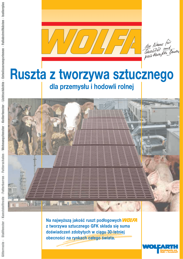 Gitterroste · Stallfenster · Kunststoffroste · Futterbarren · Futterschalen · Wohnungsfenster · Kellerfenster · Lichtschächte · Entwässerungsrinnen · Fußabstreifkästen · Isolierglas Ruszta z tworzywa sztucznego dla przemysłu i hodowli rolnej Na najwyższą jakość ruszt podłogowych z tworzywa sztucznego GFK składa się suma doświadczeń zdobytych w ciągu 30-letniej obecności na rynkach całego świata. Gitterroste · Stallfenster · Kunststoffroste · Futterbarren · Futterschalen · Wohnungsfenster · Kellerfenster · Lichtschächte · Entwässerungsrinnen · Fußabstreifkästen · Isolierglas Ruszta z tworzywa ysłu i m e z r p a sztucznego dl rolnej i l w o d o h Ruszta z tworzywa sztuczngo szklanym (GFK) Ruszta produkowane są z poliestru wzmocnionego włóknem zapewniają szereg korzyści w produkcji rolnej i przemysłowej Korzyści wynikające z zastosowania ruszt inwentarskich: ■ ■ ■ ■ ■ ■ ■ ■ ■ w obiektach przyjazny zwierzętom, zapobiegający wychłodzeniu materiał maksymalna możliwa powierzchnia szczelin, gwarantująca czystość pewne oparcie bez dodatkowego wspornika szybki montaż i czyszczenie odporność na kwasy i korozję konstrukcja zapewniająca higienę wysoka nośność, idealne pod hodowlę świń i cieląt materiał słabopalny (w przeciwieństwie do materiałów termoplastycznych takich jak PVC, Polipropylen itp.) długa żywotność, potwierdzona od dziesięcioleci Ruszta z tworzywa sztucznego od ponad 30 lat znajdują zastosowanie przy hodowli zwierząt. Oferujemy Państwu system ruszt idealny przy hodowli świń, cieląt, owiec i kóz. Nasze ruszta podłogowe są dopuszczone pod hodowlę zwierząt o ciężarze do 200 kg. Siedem typów naszych rusztów znajduje zastosowanie w najróżniejszych obszarach. Korzyści wynikające z zastosowania ruszt przemysłowych: ■ ■ ■ ■ ■ wysoka odporność na korozję odporność na działanie chemikaliów duża nośność prosty i szybki montaż nie przewodzą elektryczności ■ ■ ■ ■ ■ w obiektach są antymagnetyczne nie powodują iskrzenia odporność na działanie temperatury odporność na działanie promieni UV długa żywotność Obszar wykorzystania w przemyśle: Wszechstronność ruszt sprawia, że są one szeroko wykorzystywane w przemyśle spożywczym, samochodowym oraz przy różnego rodzaju instalacjach (np. galwanizacja). Przykładem wykorzystania w tym obszarze są podesty, pomosty, pokrycia kanałów i szybów oraz osłony wszelkiego rodzaju stref zagrożenia. Ruszta z tworzywa ysłu i m e z r p a sztucznego dl rolnej i l w o d o h Dostępne wymiary i wersje: Typ I pod hodowlę warchlaków, owiec i kóz Szczelina 90 x 9 mm Dostępne wymiary Typ I Długość: 80 cm 100 cm 120 cm 140 cm Szerokość: 33,3 cm Wysokość: 5 cm Typ II pod hodowlę świń, owiec i kóz Szczelina 86 x 12 mm Dostępne wymiary Typ II Długość: 80 cm 100 cm 120 cm 140 cm Szerokość: 33,3 cm Wysokość: 5 cm Typ III pod hodowlę tuczników i loch jałowych Szczelina 86 x 17 mm Dostępne wymiary Typ III Długość: 80 cm 100 cm 120 cm Szerokość: 33,3 cm Wysokość: 5 cm Typ IV pod hodowlę cieląt Szczelina 86 x 23 mm Dostępne wymiary Typ IV Długość: 80 cm 100 cm 120 cm Szerokość: 33,3 cm Wysokość: 5 cm Typ V przeznaczony na wyłożenie słomą Szczelina 31 x 9 mm Dostępne wymiary Typ V Długość: 80 cm 100 cm 120 cm 140 cm Szerokość: 33,3 cm Wysokość: 5 cm Typ VI pod hodowlę warchlaków Szczelina 90 x 9 mm Dostępne wymiary Typ VI Długość: 80 cm 90 cm 100 cm 110 cm 120 cm 130 cm 140 cm Szerokość: 50 cm Wysokość: 5 cm Typ VII pod hodowlę warchlaków, owiec i kóz Szczelina 90 x 12 mm Dostępne wymiary Typ VII Długość: 80 cm 90 cm 100 cm 110 cm 120 cm 130 cm 140 cm Szerokość: 50 cm Wysokość: 5 cm Gitterroste · Stallfenster · Kunststoffroste · Futterbarren · Futterschalen · Wohnungsfenster · Kellerfenster · Lichtschächte · Entwässerungsrinnen · Fußabstreifkästen · Isolierglas Ruszta z tworzywa ysłu i m e z r p sztucznego dla olnej r i l w o d ho Powierzchnia wsparcia Ruszty z tworzywa sztucznego powinny opierać się z prawej i lewej strony. Wymagana powierzchnia wsparcia to 3–4 cm. W tym obszarze wszystkie modele ruszt (z wyjątkiem typu IV) nie posiadają szczelin. Łączenia/Zabezpieczenie przed korozją Bezpieczeństwo ma priorytet! Typy I, II, III, IV i V Technika łączenia poszczególnych elementów zapewnia potrójne zabezpieczenie przed wyważeniem. Ruszta zazębiają się na sobie, co wyklucza niepożądane poluzowanie. Potrójne zawiasowe zabezpieczenie przed wyważeniem Typy VI i VII Nowością są ruszta VI i VII. Wyróżnia je to, że poszczególne elementy przylegają do siebie i łączone są za pomocą sztyftu ze stali szlachetnej. Każdy element zaopatrzony jest w sztyft i otwór, co umożliwia łączenie ich w jedną całość na przewidzianej do pokrycia powierzchni. Miejsce, w którym znajduje się otwór, jest dodatkowo oznaczone. Poszczególne elemeny są zasuwane na siebie, co gwarantuje pewne połączenie, a jednocześnie pozwala na szybkie rozmontowanie całej konstrukcji, co znacznie ułatwia czyszczenie. Proste łączenie elementów Ruszta z tworzywa sztucznego inwentarskich to nr 1 w obiektach przemysłowych i Friedrich Wolfarth GmbH & Co. KG Bauelemente aus Stahl und Kunststoff Friedrich-Wolfarth-Straße 91 D-97990 Weikersheim-Neubronn Telefon: +49 (0) 79 34 / 91 91-0 Telefax: +49 (0) 79 34 / 91 91-50 Internet: http: // www.wolfa.de e-mail: [email protected]