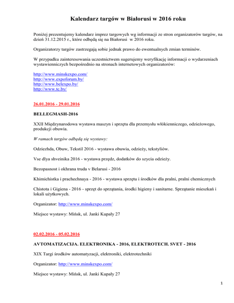 Kalendarz targów w Białorusi w 2016 roku Poniżej prezentujemy kalendarz imprez targowych wg informacji ze stron organizatorów targów, na dzień 31.12.2015 r., które odbędą się na Białorusi w 2016 roku. Organizatorzy targów zastrzegają sobie jednak prawo do ewentualnych zmian terminów. W przypadku zainteresowania uczestnictwem sugerujemy weryfikację informacji o wydarzeniach wystawienniczych bezpośrednio na stronach internetowych organizatorów: http://www.minskexpo.com/ http://www.expoforum.by/ http://www.belexpo.by/ http://www.tc.by/ 26.01.2016 - 29.01.2016 BELLEGMASH-2016 XXII Międzynarodowa wystawa maszyn i sprzętu dla przemysłu włókienniczego, odzieżowego, produkcji obuwia. W ramach targów odbędą się wystawy: Odziezhda, Obuw, Tekstil 2016 - wystawa obuwia, odzieży, tekstyliów. Vse dlya shveinika 2016 - wystawa przędz, dodatków do szycia odzieży. Bezopasnost i okhrana truda v Belarusi - 2016 Khimichistka i prachechnaya - 2016 - wystawa sprzętu i środków dla pralni, pralni chemicznych Chistota i Gigiena - 2016 - sprzęt do sprzątania, środki higieny i sanitarne. Sprzątanie mieszkań i lokali użytkowych. Organizator: http://www.minskexpo.com/ Miejsce wystawy: Mińsk, ul. Janki Kupały 27 02.02.2016 - 05.02.2016 AVTOMATIZACIJA. ELEKTRONIKA - 2016, ELEKTROTECH. SVET - 2016 XIX Targi środków automatyzacji, elektroniki, elektrotechniki Organizator: http://www.minskexpo.com/ Miejsce wystawy: Mińsk, ul. Janki Kupały 27 1 11.02.2016. - 13.02.2016 OBRAZOVANIYE I KARIERA XIV Wystawa specjalistyczna. Wyższe uczelnie, uzupełnianie wykształcenia, ośrodki szkoleniowe. Organizator: http://www.expoforum.by/ Miejsce wystawy: Pałac Sportu, Mińsk, pr. Pobediteley 4 19.02.2016 – 21.02.2016 SVADEBNYJ SALON XV Międzynarodowa wystawa specjalistyczna. Wszystko dla organizacji ceremonii ślubnych Organizator: http://www.belexpo.by/ Miejsce wystawy: Mińsk, ul. Janki Kupały 27 10.03.2016 – 13.03.2016 MIR DETSTVA - 2016 XII Międzynarodowa wystawa specjalistyczna. Towary i usługi dla dzieci i młodzieży. Organizator: http://www.belexpo.by/ Miejsce wystawy: Mińsk, ul. Janki Kupały 27 16.03.2016 – 19.03.2016 OKHOTA I RYBOLOVSTVO. VESNA Międzynarodowa wystawa specjalistyczna. Artykuły wędkarskie i myśliwskie. Organizator: http://www.belexpo.by/ Miejsce wystawy: Mińsk, ul. J. Kupały 27. 2 22.03.2016-25.03.2016 STROYEXPO XIX Specjalistyczna wystawa. Materiały budowlane, technologie i urządzenia dla branży budowlanej. Organizator: http://www.belexpo.by/ Miejsce wystawy: Mińsk, uL. Janki Kupały 27. 22.03.2016 - 25.03.2016 PISCHEVAYA INDUSTRIA -2016, PRODMASH. KHOLOD. UPAK - 2016 Międzynarodowa wystawa specjalistyczna Wyposażenie i składniki dla przemysłu spożywczego, artykuły spożywcze, urządzenia do pakowania i znakowania, projektowanie. Urządzenia do chłodzenia, wentylacji i klimatyzacji. Organizator: http://www.minskexpo.com/ Miejsce wystawy: Mińsk, pr. Pobeditelei 20/2 24.03.2016 - 27.03.2016 ZDRAVOOKHRANENIE BELARUSI 2016/BelarusMedica XXIII Targi międzynarodowe. Sprzęt medyczny i diagnostyczny, środki farmaceutyczne, wyposażenie stomatologiczne, produkty dietetyczne, zioła. Organizator: http://www.tc.by/ Miejsce wystawy: ul. Pr. Pobeditelei 20/2 29.03.2016 – 31.03.2016 BELTEXLEGPROM. VESNA XXXV Międzynarodowa wystawa hurtowej sprzedaży towarów przemysłu lekkiego. 3 Sprzęt, surowce i maszyny włókiennicze, dla przemysłu skórzanego i obuwniczego. Obuwie, tekstylia, odzież, skóra, futra, nakrycia głowy, dywany, firanki, zasłony, galanteria skórzana, nowe materiały i barwniki, dodatki, nietkane materiały, wyposażenie dla handlu. Organizator: http://www.belexpo.by/ Miejsce wystawy: Mińsk, ul. J. Kupały 27. 29.03.2016 - 01.04.2016 VODA I TEPLO XVII Wystawa międzynarodowa. Technologie, wyposażenie, materiały do pozyskiwania i uzdatniania wody, odprowadzania i oczyszczania ścieków, Pompy, rury, armatura. Systemy ogrzewania i oszczędności energii. W ramach targów salony: „Ogrzewanie", „Pompy i baseny", „Rury i armatura”, „Kondycjonowanie i wentylacja". Kongres „Woda 2016”. Organizator: http://www.expoforum.by/ Miejsce wystawy: Mińsk, pr. Pobeditelei 20/2. 06.04.2016 – 09.04.2016 OTDYKH XVI Międzynarodowa wystawa turystyczna. Wypoczynek, podróże (oferty wyjazdów letnich, biznesowych, wypoczynek dla dzieci, rejsy), programy wycieczkowe, usługi transportowe, artykuły sportowe, ubezpieczenia, usługi hotelowe. Organizator: http://www.belexpo.by/ Miejsce wystawy: Minsk, ul. J. Kupały 27 07.04.2016 - 10.04.2016 MASHINOSTROENIYE-2016, LITMETEXPO-2016. ZASCHITA OT KORROZII. POKRYTIYA-2016. SVARKA I REZKA-2016 Targi techniki obróbki metalu , tokarki, frezarki, zestawy do obróbki metalu, aparatura kontrolnopomiarowa, narzędzia. Spawanie i cięcie metalu. Organizator: http://www.minskexpo.com/ 4 Miejsce wystawy: Mińsk, Pr. Pobeditelei 20/2 12.04.2016 - 15.04.2016 BELORUSSKAIA STROITELNAYA NEDELYA-2016. BELKOMMUNTEKH-2016. TSVETY. SEMENA. SAD. OGOROD-2016. Międzynarodowe targi budowlane. Ubezpieczenia w budownictwie. Kwiaty, wyposażenie kwieciarni, maszyny ogrodnicze oraz szklarni, architektura krajobrazu. Organizator: http://www.minskexpo.com/. Miejsce wystawy: Minsk, pr. Pobeditelei 20/2 12.04.2016. - 14.04.2016 HoReCa & RetailTech XXV Międzynarodowa wystawa specjalistyczna „Bistro. Restoran. Magazin". Sprzęt i technologie dla zakładów szybkiego żywienia, barów, restauracji, handlu detalicznego. Artykuły spożywcze. Organizator: http://www.expoforum.by/ Miejsce wystawy: Minsk, pr. Pobetidelei 20/2 26.04.2016. - 29.04.2016 DIZAIN. MEBEL. INNOVATSII - 2016 XXII Międzynarodowa wystawa specjalistyczna mebli dla domu, biur, barów, kawiarń, restauracji, materiałów i akcesoriów meblowych. Dekoracyjne elementy i materiały do dekoracji wnętrz, oświetlenie wnętrz. Salony: W ramach wystawy: Salon „Mebel i interier" – meble, tekstylia obiciowe, oświetlenie wnętrz, wystrój i pr