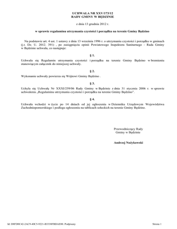 UCHWAŁA NR XXV/173/12 RADY GMINY W BĘDZINIE z dnia 13 grudnia 2012 r. w sprawie regulaminu utrzymania czystości i porządku na terenie Gminy Będzino Na podstawie art. 4 ust. 1 ustawy z dnia 13 września 1996 r. o utrzymaniu czystości i porządku w gminach (j.t. Dz. U. 2012. 391) , po zasięgnięciu opinii Powiatowego Inspektora Sanitarnego - Rada Gminy w Będzinie uchwala, co następuje: § 1. Uchwala się Regulamin utrzymania czystości i porządku na terenie Gminy Będzino w brzmieniu stanowiącym załącznik do niniejszej uchwały. § 2. Wykonanie uchwały powierza się Wójtowi Gminy Będzino . § 3. Uchyla się Uchwałę Nr XXXI/259/06 Rady Gminy w Będzinie z dnia 31 stycznia 2006 r. w sprawie uchwalenia „Regulaminu utrzymania czystości i porządku na terenie Gminy Będzino”. § 4. Uchwała wchodzi w życie po 14 dniach od jej ogłoszenia w Dzienniku Urzędowym Województwa Zachodniopomorskiego i podlega ogłoszeniu na tablicach sołeckich na terenie Gminy Będzino. Przewodniczący Rady Gminy w Będzinie Andrzej Nożykowski Id: D8FD0C42-2AC9-40C5-9221-B3338FBDAE80. Podpisany Strona 1 Załącznik Nr 1 do Uchwały Nr XXV/173/12 Rady Gminy w Będzinie z dnia 13 grudnia 2012 r. REGULAMIN UTRZYMANIA CZYSTOŚCI I PORZĄDKU NA TERENIE GMINY BĘDZINO Będzino 2012 1 Id: D8FD0C42-2AC9-40C5-9221-B3338FBDAE80. Podpisany Strona 2 SPIS TREŚCI: ROZDZIAŁ I Postanowienia ogólne………………………………………………………………………………………………..…………....str. 3 ROZDZIAŁ II Wymagania w zakresie utrzymania czystości i porządku na terenie nieruchomości……………………………………….str. 7 ROZDZIAŁ III Zasady ogólne w zakresie prowadzenia selektywnego zbierania i odbierania odpadów………………………………...str. 8 ROZDZIAŁ IV Rodzaje i minimalna pojemność pojemników przeznaczonych do zbierania odpadów komunalnych na terenie nieruchomości oraz na drogach publicznych. Warunki rozmieszczania tych pojemników i ich utrzymania w odpowiednim stanie sanitarnym, porządkowym i technicznym………………………………………………..…………………………….str. 10 ROZDZIAŁ V Częstotliwość pozbywania się odpadów komunalnych…………………………………………………………………….str. 13 ROZDZIAŁ VI Inne wymagania wynikające z Wojewódzkiego Planu Gospodarki Odpadami…………………………………………….str. 14 ROZDZIAŁ VII Obowiązki osób utrzymujących zwierzęta domowe, mających na celu ochronę przed zagrożeniem lub uciążliwością dla ludzi………………………………………………………………………………………………………………………………...str. 14 ROZDZIAŁ VIII Wymagania odnośnie utrzymywania zwierząt gospodarskich na terenach wyłączonych z produkcji rolniczej………………………………………………………………………………………………...………………………….str. 15 ROZDZIAŁ IX Obszary podlegające obowiązkowej deratyzacji oraz terminy jej przeprowadzania………………………………………str. 16 ROZDZIAŁ X Postanowienia końcowe…………………………………………………………………………………………………………str. 16 2 Id: D8FD0C42-2AC9-40C5-9221-B3338FBDAE80. Podpisany Strona 3 ROZDZIAŁ I POSTANOWIENIA OGÓLNE §1 Określa się szczegółowe zasady utrzymania czystości i porządku na terenie gminy Będzino, w szczególności dotyczące: 1) Wymagań w zakresie utrzymania czystości i porządku na terenie nieruchomości obejmujących: a) prowadzenie we wskazanym zakresie selektywnego zbierania i odbierania odpadów komunalnych, w tym powstających w gospodarstwach domowych przeterminowanych leków i chemikaliów, zużytych baterii i akumulatorów, zużytego sprzętu elektrycznego i elektronicznego, mebli i innych odpadów wielkogabarytowych, odpadów budowlanych i rozbiórkowych oraz zużytych opon, a także odpadów zielonych; b) prowadzenie selektywnego zbierania i odbierania odpadów komunalnych ulegających biodegradacji w tym odpadów opakowaniowych ulegających biodegradacji, a także odpadów zielonych z ogrodów i parków; c) uprzątanie błota, śniegu, lodu i innych zanieczyszczeń z części nieruchomości służących do użytku publicznego; d) mycie i naprawy pojazdów samochodowych poza myjniami i warsztatami naprawczymi; 2) Rodzaju i minimalnej pojemności pojemników przeznaczonych do zbierania odpadów komunalnych na terenie nieruchomości oraz na drogach publicznych, warunków rozmieszczania tych pojemników i ich utrzymania w odpowiednim stanie sanitarnym, porządkowym i technicznym, przy uwzględnieniu: a) średniej ilości odpadów komunalnych wytwarzanych w gospodarstwach domowych bądź w innych źródłach; b) liczby osób korzystających z tych pojemników; 3) Częstotliwości i sposobu pozbywania się odpadów komunalnych i nieczystości ciekłych z terenu nieruchomości oraz z terenów przeznaczonych do użytku publicznego; 4) Innych wymagań wynikających z wojewódzkiego planu gospodarki odpadami; 5) Obowiązków osób utrzymujących zwierzęta domowe, mających na celu ochronę przed zagrożeniem lub uciążliwością dla ludzi oraz przed zanieczyszczeniem terenów przeznaczonych do wspólnego użytku; 6) Wymagań utrzymywania zwierząt gospodarskich na terenach wyłączonych z produkcji rolniczej, w tym także zakazu ich utrzymywania na określonych obszarach lub w poszczególnych nieruchomościach; 7) Wyznaczania obszarów podlegających obowiązkowej deratyzacji i terminów jej przeprowadzania. §2 Ilekroć w regulaminie jest mowa o: 1) ustawie - należy przez to rozumieć ustawę z dnia 13 września 1996 roku o utrzymaniu czystości i porządku w gminach (Dz. U. z 2012 roku, poz. 391 ze zm.); 2) nieruchomości - należy przez to rozumieć, zgodnie z art. 46 § 1 ust