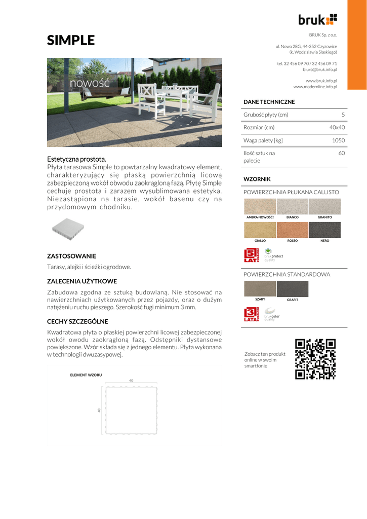 SIMPLE BRUK Sp. z o.o. ul. Nowa 28G, 44-352 Czyzowice (k. Wodzislawia Slaskiego) tel. 32 456 09 70 / 32 456 09 71 [email protected] www.bruk.info.pl www.modernline.info.pl DANE TECHNICZNE Grubość płyty (cm) 5 Rozmiar (cm) 40x40 1050 Waga palety [kg] Estetyczna prostota. Płyta tarasowa Simple to powtarzalny kwadratowy element, charakteryzujący się płaską powierzchnią licową zabezpieczoną wokół obwodu zaokrągloną fazą. Płytę Simple cechuje prostota i zarazem wysublimowana estetyka. Niezastąpiona na tarasie, wokół basenu czy na przydomowym chodniku. 60 Ilość sztuk na palecie WZORNIK POWIERZCHNIA PŁUKANA CALLISTO AMBRA NOWOŚĆ! BIANCO GRANITO GIALLO ROSSO NERO ZASTOSOWANIE Tarasy, alejki i ścieżki ogrodowe. ZALECENIA UŻYTKOWE Zabudowa zgodna ze sztuką budowlaną. Nie stosować na nawierzchniach użytkowanych przez pojazdy, oraz o dużym natężeniu ruchu pieszego. Szerokość fugi minimum 3 mm. POWIERZCHNIA STANDARDOWA SZARY CECHY SZCZEGÓLNE Kwadratowa płyta o płaskiej powierzchni licowej zabezpieczonej wokół owodu zaokrągloną fazą. Odstępniki dystansowe powiększone. Wzór składa się z jednego elementu. Płyta wykonana w technologii dwuzasypowej. Zobacz ten produkt online w swoim smartfonie GRAFIT