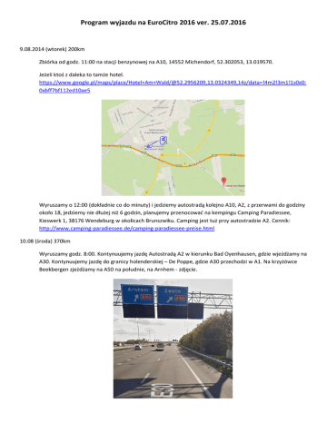 Program wyjazdu na EuroCitro 2016 ver. 25.07.2016 9.08.2014 (wtorek) 200km Zbiórka od godz. 11:00 na stacji benzynowej na A10, 14552 Michendorf, 52.302053, 13.019570. Jeżeli ktoś z daleka to tamże hotel. https://www.google.pl/maps/place/Hotel+Am+Wald/@52.2956209,13.0324349,14z/data=!4m2!3m1!1s0x0: 0xbff7bf112ed10ae5 Wyruszamy o 12:00 (dokładnie co do minuty) i jedziemy autostradą kolejno A10, A2, z przerwami do godziny około 18, jedziemy nie dłużej niż 6 godzin, planujemy przenocować na kempingu Camping Paradiessee, Kieswerk 1, 38176 Wendeburg w okolicach Brunszwiku. Camping jest tuż przy autostradzie A2. Cennik: http://www.camping-paradiessee.de/camping-paradiessee-preise.html 10.08 (środa) 370km Wyruszamy godz. 8:00. Kontynuujemy jazdę Autostradą A2 w kierunku Bad Oyenhausen, gdzie wjeżdżamy na A30. Kontynuujemy jazdę do granicy holenderskiej – De Poppe, gdzie A30 przechodzi w A1. Na krzyżówce Beekbergen zjeżdżamy na A50 na południe, na Arnhem - zdjęcie. Na krzyżówce Waterberg wjeżdżamy na A12 – zdjęcie. Na krzyżówce Velperbroek jedziemy na N325, A348 – zdjęcie Dojeżdżamy do ronda, gdzie zjeżdżamy na A348 – zdjęcie Jedziemy do zjazdu nr 3 De Steeg, gdzie kierujemy się na zamek Midachten wg. mapki poniżej. Powinniśmy tam dotrzeć w środę wieczorem. Ew. mamy w pobliżu camping gdyby nie dało się jeszcze zalogować, w co wątpię. Dwa campingi nad kompleksem jezior tuż przy zlocie: Camping Jachthaven De Mars oraz Camping De Veerstal – mapka. Powrót do uzgodnienia, możliwa trasa alternatywna. W co obowiązkowo trzeba się zaopatrzyć: 1. CB z homologacją na Europę, dla aut z instalacją 6V trzeba wziąć akumulator lub zaopatrzyć się w CB typu „walkie-talkie” 2. Namiot z wyposażeniem (śpiwory, karimaty itd.) Co jest zalecane: 1. Nawigacja 2. Ew kuchenki gazowe, fastfood w puszkach / słoikach do podgrzania 3. Naczynia turystyczne itd. Na razie obowiązuje wersja, że CP udostępni auto dostawcze z lawetą.