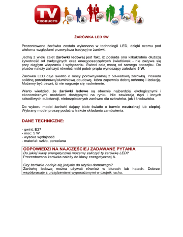 ŻARÓWKA LED 5W Prezentowana żarówka została wykonana w technologii LED, dzięki czemu pod wieloma względami przewyższa tradycyjne żarówki. Jedną z wielu zalet żarówki ledowej jest fakt, iż posiada ona kilkukrotnie dłuższą żywotność od tradycyjnych oraz energooszczędnych świetlówek - nie zużywa się przy ciągłym włączaniu i wyłączaniu. Świeci całą mocą od samego początku. Do plusów należy zaliczyć również niski pobór prądu wynoszący zaledwie 5 W. Żarówka LED daje światło o mocy porównywalnej z 50-watową żarówką. Posiada solidną porcelanową/aluminiową obudowę, która zapewnia dobrą ochronę i izolację. Możemy być pewni, iż nie nagrzeje się nadmiernie. Warto wiedzieć, że żarówki ledowe są obecnie najbardziej ekologicznymi i ekonomicznymi modelami dostępnymi na rynku. Nie zawierają rtęci i innych szkodliwych substancji, niebezpiecznych zarówno dla człowieka, jak i środowiska. Do wyboru model żarówki dający białe światło o barwie neutralnej lub ciepłej. Wybrany model proszę podać w trakcie składania zamówienia. DANE TECHNICZNE: - gwint: E27 - moc: 5 W - wysoka wydajność - materiał: szkło, porcelana ODPOWIEDZI NA NAJCZĘŚCIEJ ZADAWANE PYTANIA Do jakiej klasy energetycznej możemy zaliczyć tę żarówkę LED? Prezentowana żarówka należy do klasy energetycznej A. Czy żarówka nadaje się jedynie do użytku domowego? Żarówkę ledową można używać również w biurach lub halach. Dobrze współpracuje z urządzeniami wyposażonymi w czujnik ruchu.
