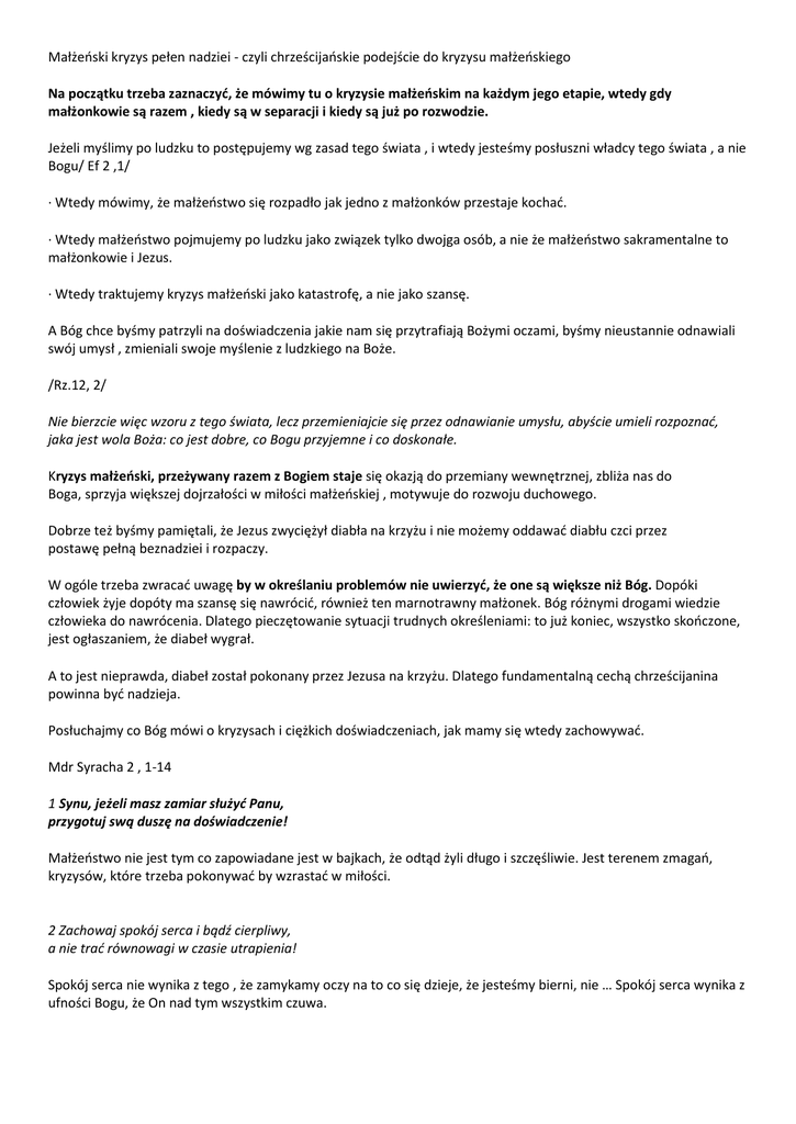 Małżeński kryzys pełen nadziei - czyli chrześcijańskie podejście do kryzysu małżeńskiego Na początku trzeba zaznaczyć, że mówimy tu o kryzysie małżeńskim na każdym jego etapie, wtedy gdy małżonkowie są razem , kiedy są w separacji i kiedy są już po rozwodzie. Jeżeli myślimy po ludzku to postępujemy wg zasad tego świata , i wtedy jesteśmy posłuszni władcy tego świata , a nie Bogu/ Ef 2 ,1/ · Wtedy mówimy, że małżeństwo się rozpadło jak jedno z małżonków przestaje kochać. · Wtedy małżeństwo pojmujemy po ludzku jako związek tylko dwojga osób, a nie że małżeństwo sakramentalne to małżonkowie i Jezus. · Wtedy traktujemy kryzys małżeński jako katastrofę, a nie jako szansę. A Bóg chce byśmy patrzyli na doświadczenia jakie nam się przytrafiają Bożymi oczami, byśmy nieustannie odnawiali swój umysł , zmieniali swoje myślenie z ludzkiego na Boże. /Rz.12, 2/ Nie bierzcie więc wzoru z tego świata, lecz przemieniajcie się przez odnawianie umysłu, abyście umieli rozpoznać, jaka jest wola Boża: co jest dobre, co Bogu przyjemne i co doskonałe. Kryzys małżeński, przeżywany razem z Bogiem staje się okazją do przemiany wewnętrznej, zbliża nas do Boga, sprzyja większej dojrzałości w miłości małżeńskiej , motywuje do rozwoju duchowego. Dobrze też byśmy pamiętali, że Jezus zwyciężył diabła na krzyżu i nie możemy oddawać diabłu czci przez postawę pełną beznadziei i rozpaczy. W ogóle trzeba zwracać uwagę by w określaniu problemów nie uwierzyć, że one są większe niż Bóg. Dopóki człowiek żyje dopóty ma szansę się nawrócić, również ten marnotrawny małżonek. Bóg różnymi drogami wiedzie człowieka do nawrócenia. Dlatego pieczętowanie sytuacji trudnych określeniami: to już koniec, wszystko skończone, jest ogłaszaniem, że diabeł wygrał. A to jest nieprawda, diabeł został pokonany przez Jezusa na krzyżu. Dlatego fundamentalną cechą chrześcijanina powinna być nadzieja. Posłuchajmy co Bóg mówi o kryzysach i ciężkich doświadczeniach, jak mamy się wtedy zachowywać. Mdr Syracha 2 , 1-14 1 Synu, jeżeli masz zamiar służyć Panu, przygotuj swą duszę na doświadczenie! Małżeństwo nie jest tym co zapowiadane jest w bajkach, że odtąd żyli długo i szczęśliwie. Jest terenem zmagań, kryzysów, które trzeba pokonywać by wzrastać w miłości. 2 Zachowaj spokój serca i bądź cierpliwy, a nie trać równowagi w czasie utrapienia! Spokój serca nie wynika z tego , że zamykamy oczy na to co się dzieje, że jesteśmy bierni, nie … Spokój serca wynika z ufności Bogu, że On nad tym wszystkim czuwa. 3 Przylgnij do Niego, a nie odstępuj, abyś był wywyższony w twoim dniu ostatnim. Bardzo ważna jest wtedy bliskość z Bogiem, by nie załatwiać niczego po ludzku, by dawać się Bogu prowadzić i przemieniać, a to się dzieje wtedy gdy karmimy się Słowem Bożym , karmimy się Jego ciałem, modlimy się. Jesteśmy po prostu w intymnej więzi z Nim. 4 Przyjmij wszystko, co przyjdzie na ciebie, a w zmiennych losach utrapienia bądź wytrzymały! Oj czasem trzeba dużo wytrzymałości by wytrwać w utrapieniu małżeńskim, ale nie da się tego zrobić bez bliskości z Bogiem, która daje wtedy siłę do wytrwania. 5 Bo w ogniu doświadcza się złoto, a ludzi miłych Bogu - w piecu utrapienia1. Jan Paweł 2 powiedział kiedyś że cierpienie to taki ogień który wypala przestrzeń dla miłości. 6 Bądź Mu wierny, a On zajmie się tobą, prostuj swe drogi i Jemu zaufaj! Wytrwanie przy Bożych przykazaniach i praca nad sobą i ufność że On z tego zła, które nas dotyka wyprowadzi dobro jest oddawaniem Bogu chwały i przyznawaniem Mu właściwej pozycji , że On jest zwycięzcą nad każdym dziełem diabła: /1J3,8/ Syn Boży objawił się po to, aby zniszczyć dzieła diabła. 7 Którzy boicie się Pana, oczekujcie Jego zmiłowania, nie zbaczajcie z drogi, abyście nie upadli. Jak wiele chcę dać duszy, która Mu ufa , tak mówił do św. Faustyny Jezus Gdy przestajemy ufać Bogu , zaczynamy działaś po swojemu , po ludzku i wtedy upadamy, bo nasze działania wynikają z lęku, wtedy wnosimy sprawy sadowe przeciw małżonkom, zaczyna walka w sądach. 8 Którzy boicie się Pana, zawierzcie Mu, a nie przepadnie wasza zapłata. Zawierzyć Bogu , to oczekiwać Jego działania, ufać , że nie jesteśmy sami i że Bóg będzie działał, bo bardziej niż my chce uzdrowić nasze małżeństwo. Bo bardziej niż my chce dla nas dobra. 9 Którzy boicie się Pana, spodziewajcie się dobra, wiecznego wesela i zmiłowania! Gdy jest ciężko trudno mieć nadzieję na to że będzie lepiej, ale ta nadzieja bierze się wtedy z jednego z wiary w miłość do nas Boga, który gotów jest zapłacić każda cenę za nasze szczęście. 10 Popatrzcie na dawne pokolenia i zobaczcie: któż zaufał Panu, a został zawstydzony? Albo któż trwał w bojaźni Pańskiej i był opuszczony? Albo któż wzywał Go, a On nim wzgardził? Warto czytać Biblię , historie ludzi, którymi Bóg się zaopiekował dlatego że Mu zaufali, i przez ich historie wzmacniać swoją ufność Bogu. 11 Dlatego że Pan jest litościwy i miłosierny, odpuszcza grzechy i zbawia w czasie utrapienia. Bóg jest tak potężny, że nawet czas utrapienia może przemienić w czas zbawienia 12 Biada sercom tchórzliwym, rękom opuszczonym i grzesznikowi chodzącemu dwiema ścieżkami. 13 Biada sercu zniechęconemu: ponieważ nie ma ufności, nie dozna opieki. 14 Biada wam, którzy straciliście cierpliwość: Nasza cierpliwość i ufność i życie nadzieją to nasze być albo nie być w czasie kryzysu. To nasza gwarancja doświadczenia opieki od Boga. Psalm 34 ,20 20 Wiele nieszczęść [spada na] sprawiedliwego; lecz ze wszystkich Pan go wybawia. Gdy jesteś blisko Boga nie masz lekko, ale ze wszystkiego wychodzisz obronną ręką Psalm 23, 4 4 Chociażbym chodził ciemną doliną, zła się nie ulęknę,