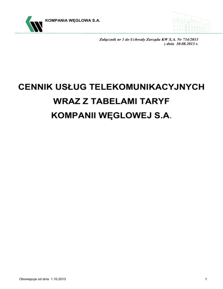 KOMPANIA WĘGLOWA S.A. Załącznik nr 1 do Uchwały Zarządu KW S.A. Nr 734/2013 z dnia 30.08.2013 r. CENNIK USŁUG TELEKOMUNIKACYJNYCH WRAZ Z TABELAMI TARYF KOMPANII WĘGLOWEJ S.A. Obowiązuje od dnia 1.10.2013 1 KOMPANIA WĘGLOWA S.A. SPIS TREŚCI. CZĘŚĆ I. CENNIK USŁUG TELEKOMUNIKACYJNYCH KOMPANII WĘGLOWEJ S.A. ....................................... 3 I. INFORMACJE OGÓLNE ...................................................................................................................................................... 4 II. USŁUGI TELEKOMUNIKACYJNE .................................................................................................................................... 5 2. Opłaty miesięczne: .................................................................................................................................................................. 6 2.1.Plany Taryfowe - obowiązujące ............................................................................................................................................ 6 2.2.Stare Plany Taryfowe ............................................................................................................................................................ 7 2.3.Pakiety minut - KRAJ ........................................................................................................................................................... 8 2.4.Pakiety minut - ZAGRANICA ............................................................................................................................................. 8 2.5.Pozostałe opłaty miesięczne .................................................................................................................................................. 8 III. USŁUGI TELETRANSMISYJNE ........................................................................................................................................ 9 1. Opłaty jednorazowe: ............................................................................................................................................................... 9 2. Opłaty miesięczne: ............................................................................................................................................................. 10 IV. DZIERŻAWA PODBUDOWY DLA SIECI KABLOWEJ ................................................................................................ 11 V. USŁUGI INTERNETOWE ................................................................................................................................................. 11 VI. USŁUGI POZOSTAŁE ..................................................................................................................................................... 12 CZĘŚĆ II. TABELE TARYF KOMPANII WĘGLOWEJ S.A. ......................................................................................... 13 I. TABELA TARYF ................................................................................................................................................................. 14 II. STARE TABELE TARYF .................................................................................................................................................. 15 1. TABELA TARYF STANDARD SEKUNDA (ROZLICZENIE SEKUNDOWE ZIT) ........................................................ 15 2. TABELA TARYF STANDARD IMPULS (ROZLICZENIE IMPULSOWE ZIT).............................................................. 17 3. TABELA TARYF - GODZINKA ......................................................................................................................................... 19 4. TABELA TARYF - VoIP Standard ...................................................................................................................................... 21 5. TABELA TARYF - VoIP Premium ...................................................................................................................................... 23 Obowiązuje od dnia 1.10.2013 2 KOMPANIA WĘGLOWA S.A. CZĘŚĆ I. CENNIK USŁUG TELEKOMUNIKACYJNYCH KOMPANII WĘGLOWEJ S.A. Obowiązuje od dnia 1.10.2013 3 KOMPANIA WĘGLOWA S.A. I. INFORMACJE OGÓLNE 1. Cennik usług telekomunikacyjnych KW SA został opracowany na podstawie: • Ustawy Prawo Telekomunikacyjne – (Dz. U. Nr 171, poz. 1800, z dnia 16 lipca 2004 r. z późn. zm.) • Zaświadczenia o wpisie do rejestru przedsiębiorców telekomunikacyjnych nr 141 Kompanii Węglowej SA w Katowicach, z dnia 23 listopada 2007 r. • Regulaminu świadczenia usług telekomunikacyjnych przez Kompanię Węglową S.A. 2. Usługi nie objęte niniejszym cennikiem rozliczane będą wg uzgodnionej z usługobiorcą kalkulacji kosztów. 3. Poszczególne pozycje, taryfy, pakiety i usługi wymienione w tym cenniku, mogą być stosowane i oferowane abonentom w zależności od możliwości i warunków technicznych danego Oddziału Operatora. 4. Cennik obowiązuje od dnia 1.10.2013 r. Obowiązuje od dnia 1.10.2013 4 KOMPANIA WĘGLOWA S.A. II. USŁUGI TELEKOMUNIKACYJNE 1. Opłaty jednorazowe: Nazwa Usługi Opłata [zł/netto] Opłata [zł/brutto] Przyznanie abonamentu telefonicznego stałego Przyznanie abonamentu telefonicznego okresowego: - do 14 dni 1,00 1,23 50,00 61,50 - powyżej 14 dni 30,00 36,90 1,00 1,23 100,00 123,00 50,00 61,50 Bez opłat Bez opłat 15,00 18,45 - w ramach jednej centrali telefonicznej 30,00 36,90 - w ramach sieci KW S.A 40,00 49,20 Przyznanie abonamentu VoIP (z zakresu numeracji Operatora KW S.A.) Przyznanie abonamentu aparatu ISDN Zmiana linii analogowej na ISDN Przeniesienie aparatu końcowego telefonii analogowej lub ISDN : - na terenie tego samego budynku - na terenie tej samej posesji Zmiana instalacji telefonicznej w mieszkaniu na życzenie abonenta Zmiana w uprawnieniu stacji Przekazanie abonamentu telefonicznego bez zmiany miejsca zainstalowania Opłata za przeniesienie przy