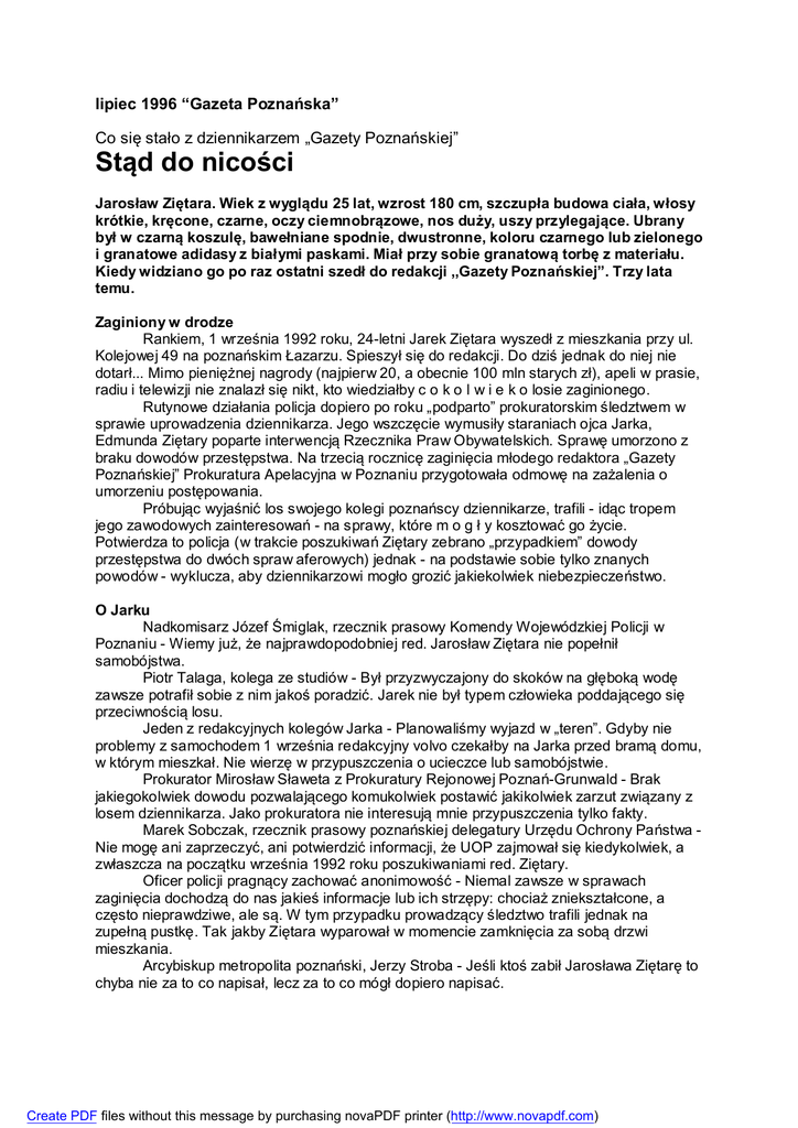 lipiec 1996 “Gazeta Poznańska” Co się stało z dziennikarzem „Gazety Poznańskiej” Stąd do nicości Jarosław Ziętara. Wiek z wyglądu 25 lat, wzrost 180 cm, szczupła budowa ciała, włosy krótkie, kręcone, czarne, oczy ciemnobrązowe, nos duży, uszy przylegające. Ubrany był w czarną koszulę, bawełniane spodnie, dwustronne, koloru czarnego lub zielonego i granatowe adidasy z białymi paskami. Miał przy sobie granatową torbę z materiału. Kiedy widziano go po raz ostatni szedł do redakcji ,,Gazety Poznańskiej”. Trzy lata temu. Zaginiony w drodze Rankiem, 1 września 1992 roku, 24-letni Jarek Ziętara wyszedł z mieszkania przy ul. Kolejowej 49 na poznańskim Łazarzu. Spieszył się do redakcji. Do dziś jednak do niej nie dotarł... Mimo pieniężnej nagrody (najpierw 20, a obecnie 100 mln starych zł), apeli w prasie, radiu i telewizji nie znalazł się nikt, kto wiedziałby c o k o l w i e k o losie zaginionego. Rutynowe działania policja dopiero po roku „podparto” prokuratorskim śledztwem w sprawie uprowadzenia dziennikarza. Jego wszczęcie wymusiły staraniach ojca Jarka, Edmunda Ziętary poparte interwencją Rzecznika Praw Obywatelskich. Sprawę umorzono z braku dowodów przestępstwa. Na trzecią rocznicę zaginięcia młodego redaktora „Gazety Poznańskiej” Prokuratura Apelacyjna w Poznaniu przygotowała odmowę na zażalenia o umorzeniu postępowania. Próbując wyjaśnić los swojego kolegi poznańscy dziennikarze, trafili - idąc tropem jego zawodowych zainteresowań - na sprawy, które m o g ł y kosztować go życie. Potwierdza to policja (w trakcie poszukiwań Ziętary zebrano „przypadkiem” dowody przestępstwa do dwóch spraw aferowych) jednak - na podstawie sobie tylko znanych powodów - wyklucza, aby dziennikarzowi mogło grozić jakiekolwiek niebezpieczeństwo. O Jarku Nadkomisarz Józef Śmiglak, rzecznik prasowy Komendy Wojewódzkiej Policji w Poznaniu - Wiemy już, że najprawdopodobniej red. Jarosław Ziętara nie popełnił samobójstwa. Piotr Talaga, kolega ze studiów - Był przyzwyczajony do skoków na głęboką wodę zawsze potrafił sobie z nim jakoś poradzić. Jarek nie był typem człowieka poddającego się przeciwnością losu. Jeden z redakcyjnych kolegów Jarka - Planowaliśmy wyjazd w „teren”. Gdyby nie problemy z samochodem 1 września redakcyjny volvo czekałby na Jarka przed bramą domu, w którym mieszkał. Nie wierzę w przypuszczenia o ucieczce lub samobójstwie. Prokurator Mirosław Sławeta z Prokuratury Rejonowej Poznań-Grunwald - Brak jakiegokolwiek dowodu pozwalającego komukolwiek postawić jakikolwiek zarzut związany z losem dziennikarza. Jako prokuratora nie interesują mnie przypuszczenia tylko fakty. Marek Sobczak, rzecznik prasowy poznańskiej delegatury Urzędu Ochrony Państwa Nie mogę ani zaprzeczyć, ani potwierdzić informacji, że UOP zajmował się kiedykolwiek, a zwłaszcza na początku września 1992 roku poszukiwaniami red. Ziętary. Oficer policji pragnący zachować anonimowość - Niemal zawsze w sprawach zaginięcia dochodzą do nas jakieś informacje lub ich strzępy: chociaż zniekształcone, a często nieprawdziwe, ale są. W tym przypadku prowadzący śledztwo trafili jednak na zupełną pustkę. Tak jakby Ziętara wyparował w momencie zamknięcia za sobą drzwi mieszkania. Arcybiskup metropolita poznański, Jerzy Stroba - Jeśli ktoś zabił Jarosława Ziętarę to chyba nie za to co napisał, lecz za to co mógł dopiero napisać. Create PDF files without this message by purchasing novaPDF printer (http://www.novapdf.com) Kwadratura zera 12 tomów akt operacyjnych. Ponad 300 przesłuchanych osób. Dziesiątki wyjazdów. Kilkanaście głównych wątków. Policjanci z grupy specjalnej powołanej po interwencji ojca zaginionego u ministra spraw wewnętrznych wykluczyli, jako nieprawdopodobne, wszystkie przedstawione przez media sugestie rozwiązania zagadki zniknięcia dziennikarza. Jak twierdzi komisarz Marek Młynarczak odpadły m. in. wątki aferowe (śremska baza TIR, powiązania polityków i biznesmenów), ucieczka w góry (Jarek był miłośnikiem gór) lub do sekty religijnej, wyjazdu za granicę (do znajomej w Londynie). Jego zwłok ani żadnego śladu po nich nie znaleziono w żadnym z kilkunastu miejsc wskazywanych przez różdżkarzy i jasnowidzów. Szef specjalnej grupy operacyjnej, nadkomisarz Roman Wechta nie ma wątpliwości, że jego ludzie robią wszystko co tylko jest możliwe. Czym szczególnym wyróżnia się według niego sprawa, którą prowadzi? - Ogromnym nakładem podjętych działań całkowicie niewspółmiernym do osiągniętego efektu, który równa się zeru. Zdaniem Wechty do wyjaśnienia pozostały jeszcze trzy wątki, o których nie może nic powiedzieć. Tak, może nie - Po raz ostatni widziałam go przez okno jak minął ulicę Calliera. Szedł prosto wspomina dziewczyna Jarka, Beata. Nie odwrócił się ani razu. Zostało mu jeszcze kilka minut. Mijał odświętnie ubrane dzieci spieszące, niektóre wraz z mamami, na rozpoczęcie roku szkolnego. Przeczuwał, że ten dzień również dla niego jest początkiem czegoś nowego. Może nawet wielkim początkiem. Bolało go bardziej niż zwykle. Próbował o tym nie myśleć, w końcu za zakrętem czekały go sprawy ważniejsze od głupiego kłucia w żołądku... Samochód już czekał. Stał po drugiej stronie ul. Gąsiorowskich. Przechodząc przez jezdnię zdziwił się, że w aucie siedziała nie jedna, lecz trzy osoby. Ktoś otworzył od wewnątrz tylne drzwi. Samochód ruszył jeszcze zanim zdążył je za sobą zatrzasnąć. Jechali prawie wcale nie rozmawiając. Nawet był z tego zadowolony. Miał jeszcze trochę czasu, żeby pomyśleć o rozmowie, do której od tak dawna się przygotowywał. Kiedy wyjechali z miasta samochód gwałtownie skręcił w prawo. Siła ciężkości popchnęła go na siedzącego obok niego mężczyznę. Mówiąc „przepraszam” odruchowo przechylił si