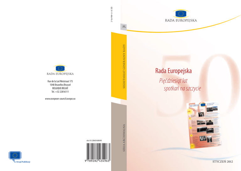 QC-31-11-406-PL-C RADA EUROPEJSKA SEKRETARIAT GENER ALNY R ADY PL RADA EUROPEJSKA Rue de la Loi/Wetstraat 175 1048 Bruxelles/Brussel BELGIQUE/BELGIË Tel. +32 22816111 Rada Europejska Pięćdziesiąt lat spotkań na szczycie www.european-council.europa.eu INST YTUCJA U STER UNII EUROPEJSKIEJ RADA EUROPEJSKA 50 lat spotkań na szcz krok po kroku 2011 ycie – U Lipsius” – obecna Budynek „Justus Europejskiej siedziba Rady Centrum prasowe podczas posiedzeniaj Rady Europejskie się Rada Europ ejska staje 1 grudnia 2009 r. traktat lizboński: . Wchodzi w życie staje się instytucją Rada Europejska przewodniczący Kierować nią będzie kadencji. o dwuipółletniej 0 009 00 2009 2200 20 Przewodniczący Merkel – z kanclerz Angelą 2010 r. grudnia Herman Van Rompuy , Bruksela, 16–17 Rada Europejska Rada Europ ejska w Trakt acie o Unii Europ a Bienert © Bundesregierung/Andre r. iej zostaje Funkcja Rady Europejsk o Unii Traktacie zdefiniowana w z Maastricht). Europejskiej (traktat Wspólne zdjęcie (Saloniki, 19–20 j po wejściu w życie Rady Europejskie r.) Pierwsze posiedzenie (Bruksela, 10–11 grudnia 1993 traktatu z Maastricht czerwca 2003 r.) 9933 9993 1999 1993 1199 Rada Europ ejska – zostaje ujęta Rada Europejska europejskim”. w „Jednolitym akcie Dublin, 10–11 marca j po wejściu w życie Rady Europejskie , 4–5 grudnia 1987 r.) Pierwsze posiedzenie (Kopenhaga europejskiego” „Jednolitego aktu 1975 r. ie Rady Europejsk iej. Wspólne zdjęcie (Dublin, 10–11 marca 1975 r.) Spotk ania na szczy 95 97 975 11975 19 Pierwsze posiedzen Paryż, grudnia 1973 r. Kopenhaga, 14–15 Haga, 1–2 grudnia 1969 r. polityczna o pierwszym Rzym, 29–30 maja 10-lecie traktatu 1961 Sesja robocza (Paryż, 1967 r. rzymskiego. r. Bonn, 18 lipca 1961 1961 r. Paryż, 10–11 lutego r.) wita Konrad Adenauer Kanclerz Niemiec Charles’a de Gaulle’a prezydenta Francji Bonn, 18 lipca 1961 r. na szczycie w 145 Bild-F011021-002, 9–10 grudnia 1974 r. Bonn, 18 lipca 1961 li: [...] rządów [...] postanowi „Szefowie państw i spotkania służące wymianie odbywać regularne ywaniu polityki i wypracow poglądów, zestrajaniu by promować polityczne tak wspólnych stanowisk, (komunikat ze szczytu) [...]”. Europy e jednoczeni ę 1961 r. jak zacieśnić współprac Paryż, 10–11 lutego poszukiwaniu sposobów, „[...] Spotkanie służyło t ze szczytu) polityczną [...]”. (komunika ouncil.europa ww w.europea n-c .eu L-P 2011 — QC-32-10-634-P Zapada decyzja rozszerzeniu. Egon Steiner nika 1972 r. Irlandii Przystąpienie Danii, Królestwa do i Zjednoczonego iej. Wspólnoty Europejsk © Bundesarchiv, Paryż, 19–20 paździer cie 1974 r. Paryż, 9–10 grudnia ”. żyje Rada Europejska d’Estaing „Szczyt umarł, niech a Valéry’ego Giscarda (wypowiedź prezydent na zakończenie szczytu) r. 9–10 grudnia 1974 Kryzys naftowy. pocz ątki do źródeł „[...] Trzeba było wrócić dokończyć władzy, żeby najpierw a następnie unię ekonomiczną [...], jaką postać żeby zastanowić się, jeszcze pełniejsza mogłaby mieć unia i głębsza [...]”. poświęcony Radzie Europejskiej „Wspomnień” rozdział i jest ostatn r. Jeana Monneta z 1976 1 lipca 1987 r. © Unia Europejska, doi:10.2860/68690 SERIA ARCHIWALNA ie Rady Ostatnie posiedzen sprawującym Europejskiej w kraju w Unii. przewodnictwo będzie się W przyszłości Rada spotykać w Brukseli. ejskiej Unii „Rada Europejska nadaje jej rozwoju impulsy niezbędne do ogólne i określa w tej mierze kierunki polityczne [...]”. ) (art. D traktatu z Maastricht określa „[...] Rada Europejska zasady i ogólne wytyczne ej wspólnej polityki zagraniczn i bezpieczeństwa [...]”. ) (art. J.8 traktatu z Maastricht Saloniki, r. 19–20 czerwca 2003 1 listopada 1993 insty tucją i określa ogólne kierunki niezbędne do jej rozwoju nadaje Unii impulsy „[...] Rada Europejska [...]. ich, jak również i priorytety polityczne lub rządów państw członkowsk j wchodzą szefowie państw (art. 15 Traktatu o Unii Europejskiej) [...]”. W skład Rady Europejskie przewodniczący Komisji jej przewodniczący oraz STYCZEŃ 2012 Uwaga JAK OTRZYMAĆ PUBLIKACJE UE Niniejsza broszura jest publikacją Sekretariatu Generalnego Rady i służy wyłącznie do celów informacyjnych. Informacje o Radzie Europejskiej i Radzie Unii Europejskiej można znaleźć na następujących stronach: www.european-council.europa.eu www.consilium.europa.eu Informacji udziela też Sekcja Informacji Publicznej przy Sekretariacie Generalnym Rady pod adresem: Rue de la Loi/Wetstraat 175 1048 Bruxelles/Brussel BELGIQUE/BELGIË Tel.: +32 22815650 Faks: +32 22814977 www.consilium.europa.eu/infopublic Wiele informacji o Unii Europejskiej można znaleźć w portalu Europa (http://europa.eu). Dane katalogowe znajdują się na końcu niniejszej publikacji. Luksemburg: Urząd Publikacji Unii Europejskiej, 2012 ISBN 978-92-824-3496-3 doi:10.2860/68690 © Unia Europejska, 2012 Powielanie materiałów dozwolone pod warunkiem podania źródła. Printed in Belgium Wydrukowano na papierze bielonym bez chloru pierwiastkowego (ECF) Publikacje bezpłatne: • w EU Bookshop (http://bookshop.europa.eu) • w przedstawicielstwach i delegaturach Unii Europejskiej (dane kontaktowe można uzyskać pod adresem http://ec.europa.eu lub wysyłając faks pod numer +352 292942758) Publikacje płatne: • w EU Bookshop (http://bookshop.europa.eu) Płatne subskrypcje (np. Dziennik Urzędowy Unii Europejskiej, zbiory orzeczeń Trybunału Sprawiedliwości Unii Europejskiej): • u dystrybutorów Urzędu Publikacji Unii Europejskiej (http://publications.europa.eu/others/agents/index_pl.htm) Rada Europejska Pięćdziesiąt lat spotkań na szczycie Spis treści Przedmowa . . . . . . . . . . . . . . . . . . . . . . . . . . . . . . . . . . . . . . . . . . . . . . . . . . . . . . . . . . . . . . . . . . . . . . . . . . . . . . . . . . . . . . . . . . . 4 Wstęp ............................................