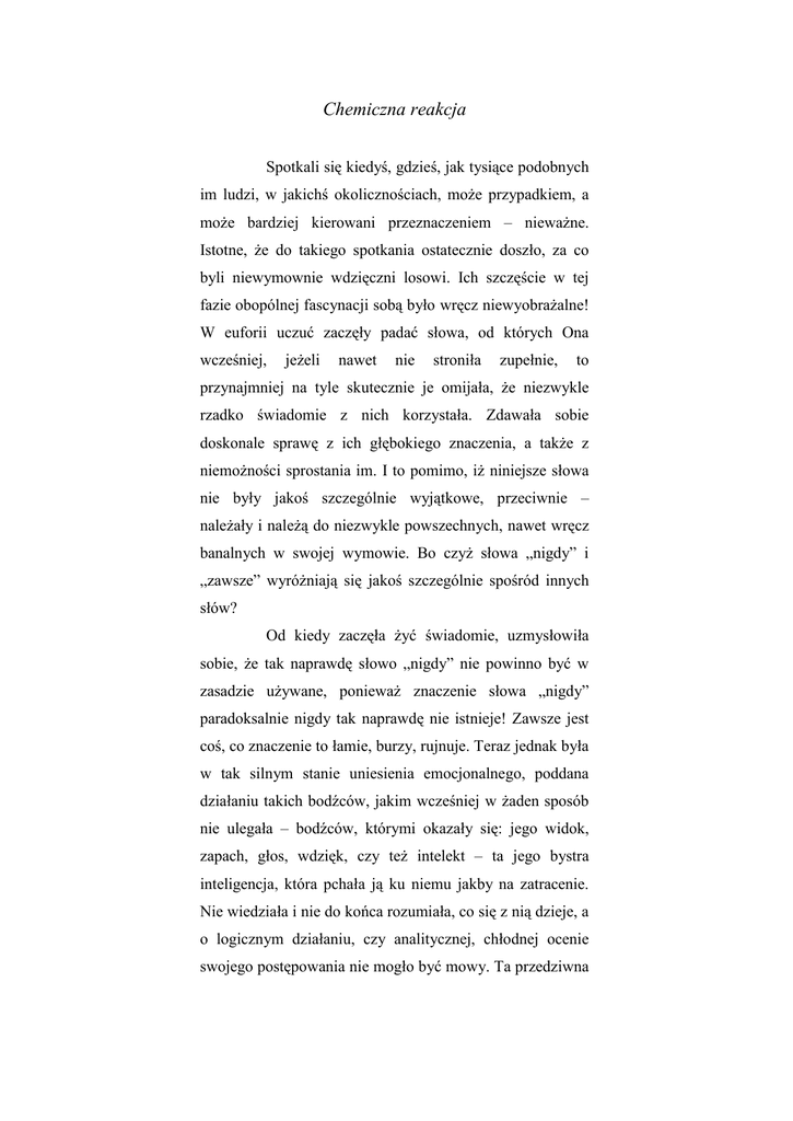 Chemiczna reakcja Spotkali się kiedyś, gdzieś, jak tysiące podobnych im ludzi, w jakichś okolicznościach, może przypadkiem, a może bardziej kierowani przeznaczeniem – nieważne. Istotne, że do takiego spotkania ostatecznie doszło, za co byli niewymownie wdzięczni losowi. Ich szczęście w tej fazie obopólnej fascynacji sobą było wręcz niewyobrażalne! W euforii uczuć zaczęły padać słowa, od których Ona wcześniej, jeżeli nawet nie stroniła zupełnie, to przynajmniej na tyle skutecznie je omijała, że niezwykle rzadko świadomie z nich korzystała. Zdawała sobie doskonale sprawę z ich głębokiego znaczenia, a także z niemożności sprostania im. I to pomimo, iż niniejsze słowa nie były jakoś szczególnie wyjątkowe, przeciwnie – należały i należą do niezwykle powszechnych, nawet wręcz banalnych w swojej wymowie. Bo czyż słowa „nigdy” i „zawsze” wyróżniają się jakoś szczególnie spośród innych słów? Od kiedy zaczęła żyć świadomie, uzmysłowiła sobie, że tak naprawdę słowo „nigdy” nie powinno być w zasadzie używane, ponieważ znaczenie słowa „nigdy” paradoksalnie nigdy tak naprawdę nie istnieje! Zawsze jest coś, co znaczenie to łamie, burzy, rujnuje. Teraz jednak była w tak silnym stanie uniesienia emocjonalnego, poddana działaniu takich bodźców, jakim wcześniej w żaden sposób nie ulegała – bodźców, którymi okazały się: jego widok, zapach, głos, wdzięk, czy też intelekt – ta jego bystra inteligencja, która pchała ją ku niemu jakby na zatracenie. Nie wiedziała i nie do końca rozumiała, co się z nią dzieje, a o logicznym działaniu, czy analitycznej, chłodnej ocenie swojego postępowania nie mogło być mowy. Ta przedziwna mieszanka chemicznych substancji związana z jego osobą, która zalała jej mózg, paraliżując wszystkie działania, były więcej niż obietnicą, którą wcześniej czy później można złamać – były wręcz deklaracją! Bo tak właśnie brzmiały słowa, które wypowiadała: Zawsze będę twoja – i tylko twoja!; albo: Zawsze będę cię kochać. Zawsze. I na zawsze! Czy też: Nigdy się nie rozstaniemy! Nigdy cię nie opuszczę. Będę twoja, a ty mój – do końca naszych nie! Takie właśnie deklaracje były konsekwencją szalonej działalności neurohormonów w jej mózgu, których powodem był nie kto inny, jak właśnie On! A On, cóż, on był bardziej powściągliwy. Chociaż skłamałbym, gdybym powiedział, że nie odczuwał czegoś podobnego. Jedyna różnica między nimi w tym względzie polegała tylko na mniejszym oszołomieniu jego umysłu tym uczuciem. Po prostu starał się, przy całej inwazji tego uczucia do niej, zachować rozsądek i logikę swojego postępowania. To wszystko. Dzisiaj, po siedmiu latach trwania ich związku można powiedzieć, że ta jego pewnego rodzaju wstrzemięźliwość nic mu nie dała, nie uratowała go. Stało się tak dlatego, ponieważ kiedy On z każdym dniem, miesiącem, rokiem pogrążał się w miłości do niej coraz bardziej, coraz intensywniej, Ona jakby z każdym dniem, miesiącem, rokiem wyzwalała się od wpływu tej fizjologicznej psychozy uzależniającej ją od niego. Dlatego dzisiaj była w zasadzie wolna – chemia przestała działać! Dzisiaj słowa „nigdy” i „zawsze” nabrały innego, zupełnie nowego znaczenia; dzisiaj te słowa chłostały niemiłosiernie, uderzały z całą bezwzględnością, wiały chłodem i obojętnością. Dlatego przyjmował je ciężko, nie mogąc się z nimi pogodzić i zaakceptować. No bo jak można było te same słowa, które kiedyś oznaczały jej bezgraniczne 2 oddanie i przywiązanie, przyjmować dzisiaj w diametralnie innym kontekście. Słowa „nigdy” i „zawsze” brzmiały dzisiaj brutalnie i gorzko. A to: Nigdy z nikim nie byłam chyba tak nieszczęśliwa, jak z tobą, słyszysz? Nigdy! Albo: Nikt nigdy mnie tak nie wykorzystał. Zmarnowałeś moje najlepsze lata! Czy wreszcie: Dobrze mnie matka ostrzegała przed takimi nieudacznikami jak ty. Ty nigdy się nie zmienisz, zawsze będziesz w stosunku do życia pasywny i byle jaki! Nie chcę się z tobą zestarzeć i zgnuśnieć. Nigdy z kimś takim jak ty już się nie zwiążę. Słyszysz? Nigdy! I… odeszła. Siedem lat, dla niego, mimo tego pechowego zakończenia, szczęśliwych lat, dobiegło końca. Cierpiał. Cicho, bezszelestnie i niezauważalnie dla świata i dla niej. Cierpiał bez związku, a może i z jakimś związkiem z tą chemią która ich połączyła, ale której działanie zakończyło się nagle, brutalnie, jak niespodziewanie przerwana chemiczna reakcja. 3