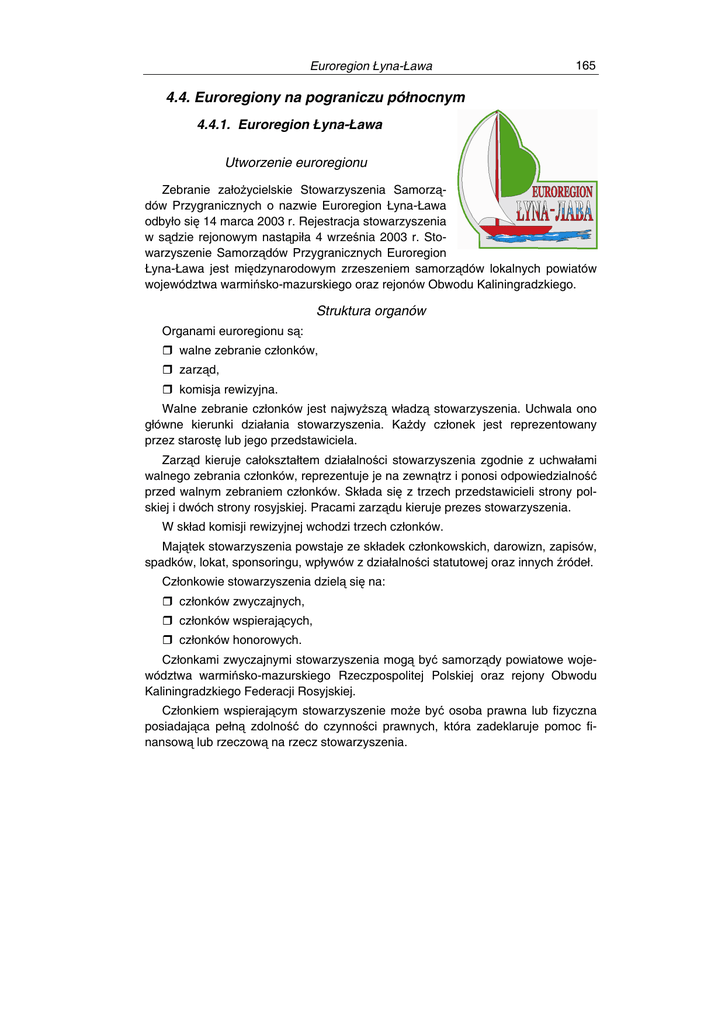 Euroregion Łyna-Ława 165 4.4. Euroregiony na pograniczu północnym 4.4.1. Euroregion Łyna-Ława Utworzenie euroregionu Zebranie założycielskie Stowarzyszenia Samorządów Przygranicznych o nazwie Euroregion Łyna-Ława odbyło się 14 marca 2003 r. Rejestracja stowarzyszenia w sądzie rejonowym nastąpiła 4 września 2003 r. Stowarzyszenie Samorządów Przygranicznych Euroregion Łyna-Ława jest międzynarodowym zrzeszeniem samorządów lokalnych powiatów województwa warmińsko-mazurskiego oraz rejonów Obwodu Kaliningradzkiego. Struktura organów Organami euroregionu są: walne zebranie członków, zarząd, komisja rewizyjna. Walne zebranie członków jest najwyższą władzą stowarzyszenia. Uchwala ono główne kierunki działania stowarzyszenia. Każdy członek jest reprezentowany przez starostę lub jego przedstawiciela. Zarząd kieruje całokształtem działalności stowarzyszenia zgodnie z uchwałami walnego zebrania członków, reprezentuje je na zewnątrz i ponosi odpowiedzialność przed walnym zebraniem członków. Składa się z trzech przedstawicieli strony polskiej i dwóch strony rosyjskiej. Pracami zarządu kieruje prezes stowarzyszenia. W skład komisji rewizyjnej wchodzi trzech członków. Majątek stowarzyszenia powstaje ze składek członkowskich, darowizn, zapisów, spadków, lokat, sponsoringu, wpływów z działalności statutowej oraz innych źródeł. Członkowie stowarzyszenia dzielą się na: członków zwyczajnych, członków wspierających, członków honorowych. Członkami zwyczajnymi stowarzyszenia mogą być samorządy powiatowe województwa warmińsko-mazurskiego Rzeczpospolitej Polskiej oraz rejony Obwodu Kaliningradzkiego Federacji Rosyjskiej. Członkiem wspierającym stowarzyszenie może być osoba prawna lub fizyczna posiadająca pełną zdolność do czynności prawnych, która zadeklaruje pomoc finansową lub rzeczową na rzecz stowarzyszenia. 166 Obszary współpracy euroregionalnej na granicach Polski Członkiem honorowym może być osoba, która wniosła wybitny wkład w rozwój idei stowarzyszenia lub w inny szczególny sposób zasłużyła się dla stowarzyszenia. Aktualnie członkami stowarzyszenia (euroregionu) ze strony polskiej jest 9 powiatów z województwa warmińsko-mazurskiego: bartoszycki, elbląski, giżycki, gołdapski, kętrzyński, lidzbarski, olsztyński i węgorzewski. Stronę rosyjską euroregionu tworzą 4 rejony obwodu kaliningradzkiego: Bagriatonowsk, Prawdinsk, Oziersk, Gusiew oraz miasto Mamonowo (por. mapa 18). Siedzibą stowarzyszenia jest miasto Bartoszyce. Cele euroregionu określone w statucie oraz wynikające z nich zadania przedstawiono w rozdziale drugim. Wśród najważniejszych inicjatyw podjętych dotychczas przez struktury euroregionu są: współorganizacja V, VI i VII Międzynarodowego Spływu Łyną „Stopki – Prawdinsk” – 23 czerwca 2005 r., 30 czerwca 2006 r. i 28 czerwca 2007 r., działania na rzecz uruchomienia międzynarodowego przejścia granicznego dla ruchu turystycznego na rzece Łynie, podjęcie działań mających na celu realizację projektów: „Organizacja biura Euroregionu Łyna-Ława” w ramach programu Interreg III A oraz „Opracowanie Strategii Rozwoju Euroregionu Łyna-Ława”, przystąpienie euroregionu do uczestnictwa w projekcie pn. „Budowa potencjału instytucjonalnego organizacji pozarządowych Obwodu Kaliningradzkiego do uczestnictwa w polsko-rosyjskiej współpracy transgranicznej” realizowanym przez ESWIP (Elbląskie Stowarzyszenie Wspierania Inicjatyw Pozarządowych), działania na rzecz aktywizacji połączenia kolejowego Bagrationowsk – Bartoszyce, prace nad projektem Planu Operacyjnego na lata 2007-2009 Euroregionu Łyna-Ława. Euroregion nie korzystał dotychczas z dofinansowania z funduszy unijnych w ramach realizowanych działań. U w a g a. Z powodu braku danych dla rosyjskiej części Euroregionu Łyna-Ława informacje statystyczne o części polskiej zamieszczono w tablicach w podrozdziale 4.5. Ważniejsze adresy Euroregion Łyna-Ława 11-200 Bartoszyce ul. Grota Roweckiego 1 tel. (89) 762 17 20, 762 97 05, 762 97 25 fax (89) 762 53 10 [email protected] Euroregion Łyna-Ława Strona polska Powiaty: 1. 2. 3. 4. 5. 6. 7. 8. Bartoszycki Elbląski Giżycki Gołdapski Kętrzyński Lidzbarski Olsztyński Węgorzewski Członek wspierający: 9. Sejmik Województwa Warmińsko-Mazurskiego Strona rosyjska Rejony: 1. 2. 3. 4. Bagrationowsk Gusiew Oziersk Prawdinsk Miasta: 5. Mamonowo Euroregion Bałtyk 167 4.4.2. Euroregion Bałtyk Utworzenie euroregionu Idea utworzenia euroregionu pojawiła się prawie równocześnie w kręgach politycznych i gospodarczych południowo-wschodniej Szwecji oraz północno-wschodniej Polski. Inicjatorem rozpoczęcia prac nad utworzeniem euroregionu były władze miasta Elbląga, które na przełomie lutego i marca 1997 roku zorganizowały konferencję w Malborku, poświęconą możliwościom utworzenia struktury transgranicznej w regionie południowo-wschodniego Bałtyku. Na tej konferencji powołano komitet organizacyjny. Po roku prac przedstawiciele 6 krajów15 podpisali 22 lutego 1998 roku Porozumienie o utworzeniu Euroregionu Bałtyk. Aktualnie Euroregion Bałtyk łączy w ramach współpracy transgranicznej obszary leżące na terytorium 5 krajów nadbałtyckich: Polski, Danii, Litwy, Rosji i Szwecji. W podpisanym porozumieniu przedstawiciele regionalnych i lokalnych władz przygranicznych regionów państw leżących nad Morzem Bałtyckim uznali za główny cel euroregionu przygotowanie i realizację wspólnych planów i projektów rozwoju przygranicznych terenów oraz likwidację barier we współpracy. Językami oficjalnymi w euroregionie są język angielski i rosyjski. Jeżeli obrady toczą się na terytorium jednego z państw-stron umowy, mogą być prowadzone w języku gospodarza, wówczas jednak gospodarze obrad są obowiązani zapewnić symultaniczne tłumaczenie na język angielski i rosyjski. Struktura organów 