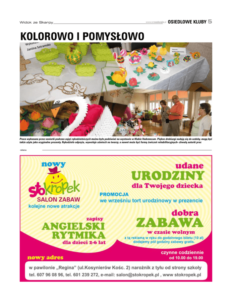 Widok ze Skarpy www.smnaskarpie.pl osiedlowe kluby 5 Kolorowo i pomysłowo Prace wykonane przez seniorki podczas zajęć rękodzielniczych można było podziwiać na wystawie w Klubie Vademecum. Piękne drobiazgi nadają się do ozdoby, mogą być także użyte jako oryginalne prezenty. Rękodzieło odpręża, wywołuje uśmiech na twarzy, a nawet może być formą ćwiczeń rehabilitacyjnych- chwalą autorki prac reklama