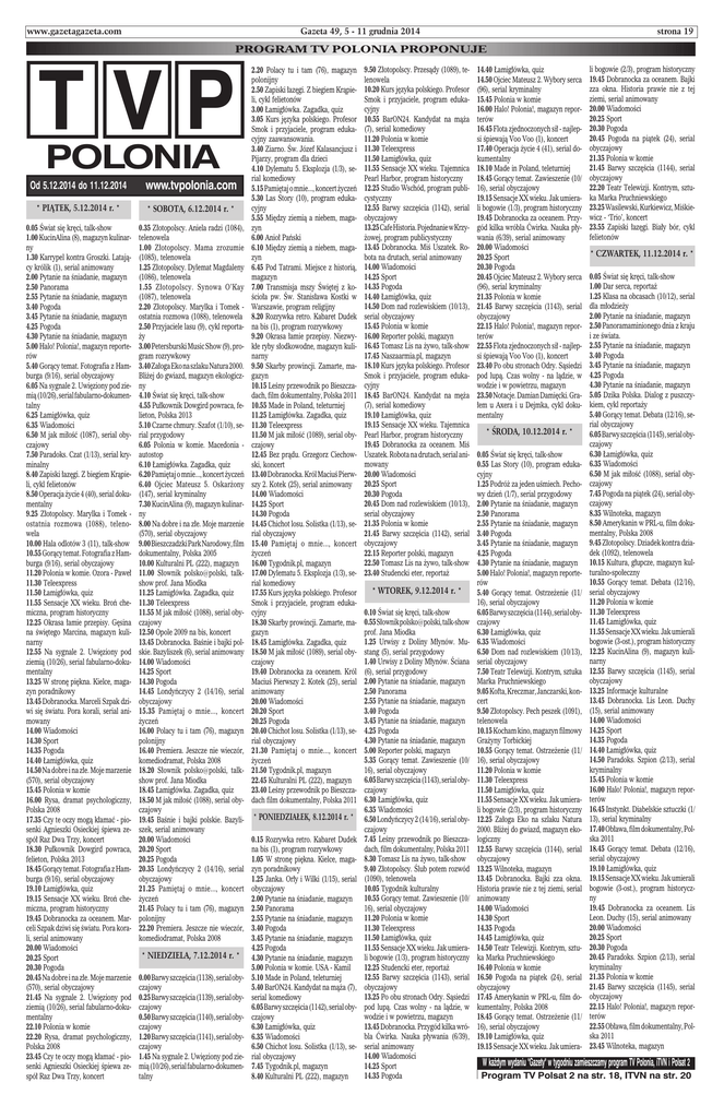 www.gazetagazeta.com Gazeta 49, 5 - 11 grudnia 2014 strona 19 PROGRAM TV POLONIA PROPONUJE TVP POLONIA Od 5.12.2014 do 11.12.2014 * PIĄTEK, 5.12.2014 r. * 0.05 Świat się kręci, talk-show 1.00 KucinAlina (8), magazyn kulinarny 1.30 Karrypel kontra Groszki. Latający królik (1), serial animowany 2.00 Pytanie na śniadanie, magazyn 2.50 Panorama 2.55 Pytanie na śniadanie, magazyn 3.40 Pogoda 3.45 Pytanie na śniadanie, magazyn 4.25 Pogoda 4.30 Pytanie na śniadanie, magazyn 5.00 Halo! Polonia!, magazyn reporterów 5.40 Gorący temat. Fotografia z Hamburga (9/16), serial obyczajowy 6.05 Na sygnale 2. Uwięziony pod ziemią (10/26), serial fabularno-dokumentalny 6.25 Łamigłówka, quiz 6.35 Wiadomości 6.50 M jak miłość (1087), serial obyczajowy 7.50 Paradoks. Czat (1/13), serial kryminalny 8.40 Zapiski łazęgi. Z biegiem Krąpieli, cykl felietonów 8.50 Operacja życie 4 (40), serial dokumentalny 9.25 Złotopolscy. Marylka i Tomek ostatnia rozmowa (1088), telenowela 10.00 Hala odlotów 3 (11), talk-show 10.55 Gorący temat. Fotografia z Hamburga (9/16), serial obyczajowy 11.20 Polonia w komie. Ozora - Paweł 11.30 Teleexpress 11.50 Łamigłówka, quiz 11.55 Sensacje XX wieku. Broń chemiczna, program historyczny 12.25 Okrasa łamie przepisy. Gęsina na świętego Marcina, magazyn kulinarny 12.55 Na sygnale 2. Uwięziony pod ziemią (10/26), serial fabularno-dokumentalny 13.25 W stronę piękna. Kielce, magazyn poradnikowy 13.45 Dobranocka. Marceli Szpak dziwi się światu. Pora korali, serial animowany 14.00 Wiadomości 14.30 Sport 14.35 Pogoda 14.40 Łamigłówka, quiz 14.50 Na dobre i na złe. Moje marzenie (570), serial obyczajowy 15.45 Polonia w komie 16.00 Rysa, dramat psychologiczny, Polska 2008 17.35 Czy te oczy mogą kłamać - piosenki Agnieszki Osieckiej śpiewa zespół Raz Dwa Trzy, koncert 18.30 Pułkownik Dowgird powraca, felieton, Polska 2013 18.45 Gorący temat. Fotografia z Hamburga (9/16), serial obyczajowy 19.10 Łamigłówka, quiz 19.15 Sensacje XX wieku. Broń chemiczna, program historyczny 19.45 Dobranocka za oceanem. Marceli Szpak dziwi się światu. Pora korali, serial animowany 20.00 Wiadomości 20.25 Sport 20.30 Pogoda 20.45 Na dobre i na złe. Moje marzenie (570), serial obyczajowy 21.45 Na sygnale 2. Uwięziony pod ziemią (10/26), serial fabularno-dokumentalny 22.10 Polonia w komie 22.20 Rysa, dramat psychologiczny, Polska 2008 23.45 Czy te oczy mogą kłamać - piosenki Agnieszki Osieckiej śpiewa zespół Raz Dwa Trzy, koncert www.tvpolonia.com * SOBOTA, 6.12.2014 r. * Sobota 0.12 0.35 Złotopolscy. Aniela radzi (1084), telenowela 1.00 Złotopolscy. Mama zrozumie (1085), telenowela 1.25 Złotopolscy. Dylemat Magdaleny (1086), telenowela 1.55 Złotopolscy. Synowa O’Kay (1087), telenowela 2.20 Złotopolscy. Marylka i Tomek ostatnia rozmowa (1088), telenowela 2.50 Przyjaciele lasu (9), cykl reportaży 3.00 Petersburski Music Show (9), program rozrywkowy 3.40 Załoga Eko na szlaku Natura 2000. Bliżej do gwiazd, magazyn ekologiczny 4.10 Świat się kręci, talk-show 4.55 Pułkownik Dowgird powraca, felieton, Polska 2013 5.10 Czarne chmury. Szafot (1/10), serial przygodowy 6.05 Polonia w komie. Macedonia autostop 6.10 Łamigłówka. Zagadka, quiz 6.20 Pamiętaj o mnie..., koncert życzeń 6.40 Ojciec Mateusz 5. Oskarżony (147), serial kryminalny 7.30 KucinAlina (9), magazyn kulinarny 8.00 Na dobre i na złe. Moje marzenie (570), serial obyczajowy 9.00 Bieszczadzki Park Narodowy, film dokumentalny, Polska 2005 10.00 Kulturalni PL (222), magazyn 11.00 Słownik polsko@polski, talkshow prof. Jana Miodka 11.25 Łamigłówka. Zagadka, quiz 11.30 Teleexpress 11.55 M jak miłość (1088), serial obyczajowy 12.50 Opole 2009 na bis, koncert 13.45 Dobranocka. Baśnie i bajki polskie. Bazyliszek (6), serial animowany 14.00 Wiadomości 14.25 Sport 14.30 Pogoda 14.45 Londyńczycy 2 (14/16), serial obyczajowy 15.35 Pamiętaj o mnie..., koncert życzeń 16.00 Polacy tu i tam (76), magazyn polonijny 16.40 Premiera. Jeszcze nie wieczór, komediodramat, Polska 2008 18.20 Słownik polsko@polski, talkshow prof. Jana Miodka 18.45 Łamigłówka. Zagadka, quiz 18.50 M jak miłość (1088), serial obyczajowy 19.45 Baśnie i bajki polskie. Bazyliszek, serial animowany 20.00 Wiadomości 20.20 Sport 20.25 Pogoda 20.35 Londyńczycy 2 (14/16), serial obyczajowy 21.25 Pamiętaj o mnie..., koncert życzeń 21.45 Polacy tu i tam (76), magazyn polonijny 22.20 Premiera. Jeszcze nie wieczór, komediodramat, Polska 2008 * NIEDZIELA, Niedziela 1.12 7.12.2014 r. * 0.00 Barwy szczęścia (1138), serial obyczajowy 0.25 Barwy szczęścia (1139), serial obyczajowy 0.50 Barwy szczęścia (1140), serial obyczajowy 1.20 Barwy szczęścia (1141), serial obyczajowy 1.45 Na sygnale 2. Uwięziony pod ziemią (10/26), serial fabularno-dokumentalny 2.20 Polacy tu i tam (76), magazyn polonijny 2.50 Zapiski łazęgi. Z biegiem Krąpieli, cykl felietonów 3.00 Łamigłówka. Zagadka, quiz 3.05 Kurs języka polskiego. Profesor Smok i przyjaciele, program edukacyjny zaawansowania. 3.40 Ziarno. Św. Józef Kalasancjusz i Pijarzy, program dla dzieci 4.10 Dylematu 5. Eksplozja (1/3), serial komediowy 5.15 Pamiętaj o mnie..., koncert życzeń 5.30 Las Story (10), program edukacyjny 5.55 Między ziemią a niebem, magazyn 6.00 Anioł Pański 6.10 Między ziemią a niebem, magazyn 6.45 Pod Tatrami. Miejsce z historią, magazyn 7.00 Transmisja mszy Świętej z kościoła pw. Św. Stanisława Kostki w Warszawie, program religijny 8.20 Rozrywka retro. Kabaret Dudek na bis (1), program rozrywkowy 9.20 Okrasa łamie przepisy. Niezwykłe ryby słodkowodne, magazyn kulinarny 9.50 Skarby prowincji. Zamarte, magazyn 10.15 Leśny przewodnik po Bieszczadach, film dokumentalny, Polska 2011 10.55 Made in Poland, teleturniej 11.25 Łamigłówka. Zagadka, quiz 11.30 Teleexpress 11.50 M jak miłość (1089), serial obyczajowy 12.45 Bez prądu. Grzegorz Ciechowski, koncert 13.40 Dobranocka. Król Maciuś Pierwszy 2. Kotek (25), se