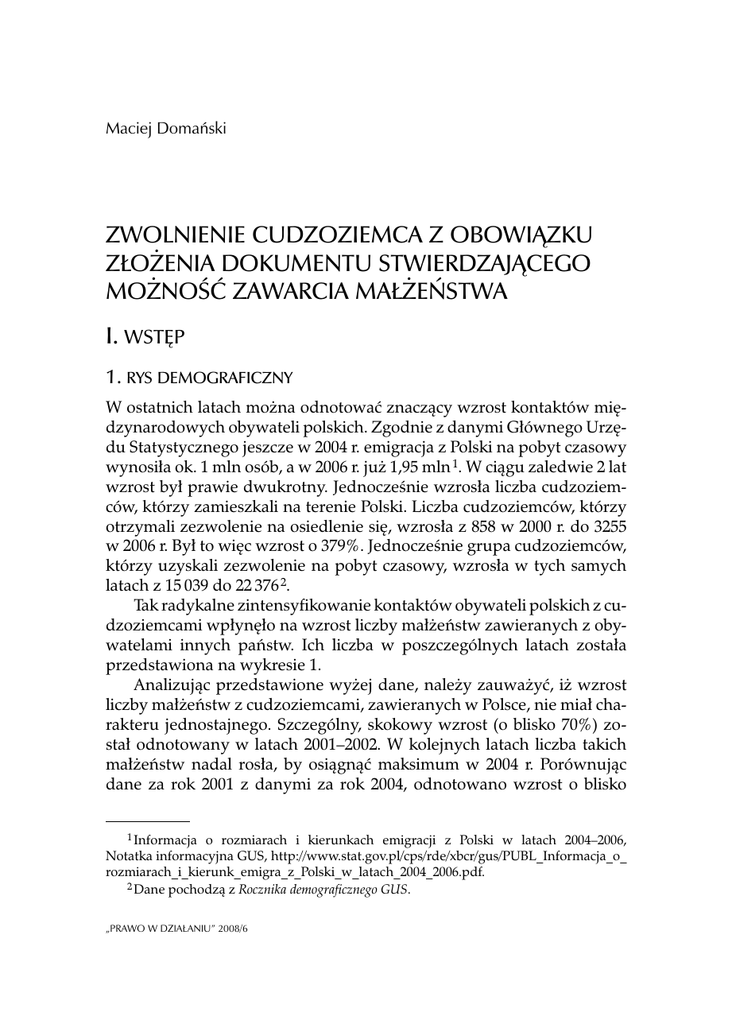 Maciej Domański ZWOLNIENIE CUDZOZIEMCA Z OBOWIĄZKU ZŁOŻENIA DOKUMENTU STWIERDZAJĄCEGO MOŻNOŚĆ ZAWARCIA MAŁŻEŃSTWA I. WSTĘP 1. RYS DEMOGRAFICZNY W ostatnich latach mo¿na odnotowaæ znacz¹cy wzrost kontaktów miêdzynarodowych obywateli polskich. Zgodnie z danymi G³ównego Urzêdu Statystycznego jeszcze w 2004 r. emigracja z Polski na pobyt czasowy wynosi³a ok. 1 mln osób, a w 2006 r. ju¿ 1,95 mln 1. W ci¹gu zaledwie 2 lat wzrost by³ prawie dwukrotny. Jednoczeœnie wzros³a liczba cudzoziemców, którzy zamieszkali na terenie Polski. Liczba cudzoziemców, którzy otrzymali zezwolenie na osiedlenie siê, wzros³a z 858 w 2000 r. do 3255 w 2006 r. By³ to wiêc wzrost o 379%. Jednoczeœnie grupa cudzoziemców, którzy uzyskali zezwolenie na pobyt czasowy, wzros³a w tych samych latach z 15 039 do 22 376 2. Tak radykalne zintensyfikowanie kontaktów obywateli polskich z cudzoziemcami wp³ynê³o na wzrost liczby ma³¿eñstw zawieranych z obywatelami innych pañstw. Ich liczba w poszczególnych latach zosta³a przedstawiona na wykresie 1. Analizuj¹c przedstawione wy¿ej dane, nale¿y zauwa¿yæ, i¿ wzrost liczby ma³¿eñstw z cudzoziemcami, zawieranych w Polsce, nie mia³ charakteru jednostajnego. Szczególny, skokowy wzrost (o blisko 70%) zosta³ odnotowany w latach 2001–2002. W kolejnych latach liczba takich ma³¿eñstw nadal ros³a, by osi¹gn¹æ maksimum w 2004 r. Porównuj¹c dane za rok 2001 z danymi za rok 2004, odnotowano wzrost o blisko 1 Informacja o rozmiarach i kierunkach emigracji z Polski w latach 2004–2006, Notatka informacyjna GUS, http://www.stat.gov.pl/cps/rde/xbcr/gus/PUBL_Informacja_o_ rozmiarach_i_kierunk_emigra_z_Polski_w_latach_2004_2006.pdf. 2 Dane pochodz¹ z Rocznika demograficznego GUS. „PRAWO W DZIAŁANIU” 2008/6 84 MACIEJ DOMAŃSKI Wykres 1. Małżeństwa cudzoziemców zawarte w Polsce 4500 3967 4000 3500 4080 3483 3552 3273 3055 3000 3547 3240 2531 2428 2292 2366 2500 2177 2206 2318 2178 2115 2000 1500 1000 2006 2005 2004 2003 2002 2001 2000 1999 1998 1997 1996 1995 1994 1993 1992 1991 0 1990 500 Źródło: Roczniki demograficzne GUS. 93%. W kolejnych latach zanotowany zosta³ spadek liczby ma³¿eñstw z cudzoziemcami, jednak ich liczba (oko³o 3500) i tak by³a wy¿sza ni¿ w drugiej po³owie lat dziewiêædziesi¹tych o oko³o 50% (wzrost o ponad 1000 zawartych ma³¿eñstw). Wzrost liczby ma³¿eñstw zawieranych z cudzoziemcami w Polsce, choæ znacz¹cy, nie by³ tak wysoki, jak mo¿na by³oby oczekiwaæ, analizuj¹c znaczne zintensyfikowanie kontaktów obywateli polskich z cudzoziemcami. Nale¿y za³o¿yæ, i¿ znaczna czêœæ ma³¿eñstw z obywatelami pañstw obcych by³a zawierana za granic¹. Przedstawione zmiany powinny by³y znaleŸæ odzwierciedlenie we wzroœcie liczby postêpowañ s¹dowych o zwolnienie cudzoziemca od obowi¹zku przedstawienia dokumentu stwierdzaj¹cego, ¿e mo¿e zawrzeæ ma³¿eñstwo. Ministerstwo Sprawiedliwoœci nie prowadzi, niestety, odrêbnych statystyk obejmuj¹cych wy³¹cznie postêpowania o zwolnienie cudzoziemca od przedstawienia dokumentu stwierdzaj¹cego mo¿noœæ zawarcia ma³¿eñstwa. Gromadzone dane statystyczne obejmuj¹ wszystkie postêpowania o zwolnienie od przedstawienia dokumentu potrzebnego do zawarcia ma³¿eñstwa 3. Dane dotycz¹ce wp³ywu spraw 3 Zale¿noœæ miêdzy liczb¹ postêpowañ o zwolnienie od przedstawienia jakiegokolwiek dokumentu a liczb¹ postêpowañ o zwolnienie cudzoziemca od obowi¹zku przedstawie- 85 ZWOLNIENIE CUDZOZIEMCA Z OBOWIĄZKU ZŁOŻENIA DOKUMENTU… Wykres 2. Wpływ spraw o zwolnienie od obowiązku przedstawienia dokumentu potrzebnego do zawarcia małżeństwa do sądów I instancji 531 484 500 400 300 310 315 330 1999 2000 2001 337 2002 367 394 200 100 0 2003 2004 2005 2006 Źródło: dane Ministerstwa Sprawiedliwości. o zwolnienie od przedstawienia dokumentu potrzebnego do zawarcia ma³¿eñstwa zosta³y przedstawione na wykresie 2. Analiza danych przedstawionych na wykresie 2 wskazuje na stopniowy i sta³y wzrost liczby tego typu spraw wp³ywaj¹cych do s¹dów. Odnotowane trendy okreœlaj¹ce liczbê zawieranych ma³¿eñstw i liczbê postêpowañ o zwolnienie od obowi¹zku przedstawienia dokumentu potrzebnego do zawarcia ma³¿eñstwa nie w pe³ni siê pokrywa³y. W latach 2001–2002, gdy mia³ miejsce wskazany ju¿ blisko 70-proc. wzrost liczby ma³¿eñstw zawartych w Polsce przez cudzoziemców, wzrost wp³ywu wniosków, w analizowanych postêpowaniach, wyniós³ jedynie nieca³e 5%. Z kolei w latach 2004–2006 liczba ma³¿eñstw spad³a o oko³o 13%, natomiast liczba wniosków wp³ywaj¹cych do s¹dów wzros³a o 31,9%. Przyczyna takich rozbie¿noœci pozostaje niewiadoma. Porównanie danych przedstawionych na obydwu wykresach zwraca uwagê szczególnie w jednym aspekcie. W ka¿dym roku liczba zawieranych ma³¿eñstw z cudzoziemcami by³a wielokrotnie wiêksza ni¿ liczba postêpowañ. Przyk³adowo w 2001 r. liczba takich postêpowañ by³a 6,7 razy mniejsza ni¿ zawartych ma³¿eñstw, w 2003 r. — a¿ 11,8 razy, nia dokumentu stwierdzaj¹cego mo¿noœæ zawarcia ma³¿eñstwa zostanie przedstawiona w dalszej czêœci opracowania. 86 MACIEJ DOMAŃSKI w 2006 r. — 7,3. Uwzglêdniaj¹c fakt, i¿ dane obejmuj¹ wp³yw wniosków o zwolnienie od wszystkich dokumentów, rzeczywista ró¿nica by³a jeszcze wiêksza. Pobie¿na analiza statystyczna wskazuje, i¿ postêpowania takie mia³y charakter wyj¹tkowy i poprzedza³y jedynie niewielki odsetek zawieranych ma³¿eñstw. Trudno uchwyciæ przyczyny takiej dysproporcji. Mo¿na jednak wskazaæ pewne hipotezy. Pierwsza zak³ada, i¿ cudzoziemcy w zdecydowanej wiêkszoœci pochodzili z krajów, które wystawia³y stosowne dokumenty (trudnoœci z ich otrzymaniem s¹ bowiem zdecydowanie sytuacj¹ wyj¹tkow¹). Druga zmusza³aby do za³o¿enia, i¿ nie we wszystkich Urzêdach Stanu Cywilnego wymagano przed zawarciem ma³¿eñstwa przedstawienia dokumentu stwierdzaj¹cego mo¿noœæ. 2. 