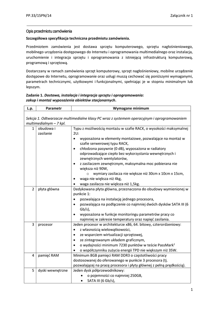 PP.33/15PN/14 Załącznik nr 1 Opis przedmiotu zamówienia Szczegółowa specyfikacja techniczna przedmiotu zamówienia. Przedmiotem zamówienia jest dostawa sprzętu komputerowego, sprzętu nagłośnieniowego, mobilnego urządzenia dostępowego do Internetu i oprogramowania multimedialnego oraz instalacja, uruchomienie i integracja sprzętu i oprogramowania z istniejącą infrastrukturą komputerową, programową i sprzętową. Dostarczany w ramach zamówienia sprzęt komputerowy, sprzęt nagłośnieniowy, mobilne urządzenie dostępowe do Internetu, oprogramowanie oraz usługi muszą cechować się poniższymi wymaganymi, parametrach technicznymi, użytkowymi i funkcjonalnymi, spełniając je w stopniu minimalnym lub lepszym. Zadanie 1. Dostawa, instalacja i integracja sprzętu i oprogramowania: zakup i montaż wyposażenia obiektów stacjonarnych. L.p. Parametr Wymagane minimum Sekcja 1. Odtwarzacze multimedialne klasy PC wraz z systemem operacyjnym i oprogramowaniem multimedialnym – 7 kpl. 1 obudowa i Typu z możliwością montażu w szafie RACK, o wysokości maksymalnej zasilanie 2U: wyposażona w elementy montażowe, pozwalające na montaż w szafie serwerowej typu RACK, chłodzona pasywnie (0 dB), wyposażona w radiatory odprowadzające ciepło bez wykorzystania wewnętrznych i zewnętrznych wentylatorów, z zasilaczem zewnętrznym, maksymalna moc pobierana nie większa niż 90W, o wymiary zasilacza nie większe niż 30cm x 10cm x 15cm, waga nie większa niż 4kg, waga zasilacza nie większa niż 1,5kg. 2 płyta główna Dedykowana płyta główna, przeznaczona do obudowy wymienionej w punkcie 1: pozwalająca na instalację jednego procesora, pozwalająca na podłączenie co najmniej dwóch dysków SATA III (6 Gb/s), wyposażona w funkcje monitoringu parametrów pracy co najmniej w zakresie temperatury oraz napięć zasilania. 3 procesor Jeden procesor w architekturze x86, 64. bitowy, czterordzeniowy: z własnością wielowątkowości, ze wsparciem wirtualizacji sprzętowej, ze zintegrowanym układem graficznym, o wydajności minimum 7230 punktów w teście PassMark1 o współczynniku zużycia energii TPD nie większym niż 35W. 4 pamięć RAM Minimum 8GB pamięci RAM DDR3 o częstotliwości pracy dostosowanej do oferowanego w punkcie 3 procesora (tj. pozwalającej na pracę procesora i płyty głównej z pełną prędkością). 5 dyski wewnętrzne Jeden dysk półprzewodnikowy: o pojemności co najmniej 250GB, SATA III (6 Gb/s), 1 PP.33/15PN/14 Załącznik nr 1 6 karta graficzna 7 koncentrator USB 8 komunikacja i złącza zewnętrzne 9 zewnętrzne karty dźwiękowe 10 gwarancja deklarowana prędkość odczytu sekwencyjnego co najmniej 500MB/s, deklarowana prędkość zapisu sekwencyjnego co najmniej 450MB/s oraz dodatkowo jeden dysk obrotowy: o pojemności co najmniej 1TB SATA III (6 Gb/s), prędkość obrotowa nie mniejsza niż 5400 obr/min. Zintegrowana, wykorzystująca pamięć RAM systemu dynamicznie przydzielaną na potrzeby grafiki w trybie UMA (Unified Memory Access), o następujących cechach (co najmniej): z możliwością dynamicznego przydzielenia co najmniej do 1,5 GB pamięci, zgodna ze standardem DX10.1 oraz DirectX* 11.1, zgodna ze standardem OpenGL 4.0, zgodna ze standardem Shader Model 5.0 . Zewnętrzny HUB/koncentrator USB co najmniej 2.0 z zasilaniem (aktywny), pozwalający na jednoczesne obsłużenie co najmniej 6 kart dźwiękowych USB wraz z niezbędnym zasilaczem i kablami przedłużającymi (USB). Odtwarzacz multimedialny musi posiadać wyprowadzone z tyłu co najmniej następujące złącza: co najmniej 4 porty USB 3.0 (kompatybilne z USB 2.0), co najmniej jeden port RS 232 (COM), co najmniej jeden interfejs sieciowy LAN RJ-45 10/100/1000 Mbps, co najmniej jedno złącze HDMI, co najmniej jedno złącze DisplayPort. Odtwarzacz multimedialny musi być wyposażony w co najmniej 6 niezależnych, zewnętrznych kart dźwiękowych podłączonych przez porty USB, widocznych w systemie jako standardowe urządzenia odtwarzające dźwięk (audio): rozdzielczość dźwięku odtwarzanego co najmniej 16 bitów, częstotliwość próbkowania dla odtwarzania co najmniej 48kHz, wyjściowy stosunek sygnału do szumu (mierzony metodą AWeighted) co najmniej 100 dB, wyjściowy poziom zniekształceń nie większy niż 0.005% (dB) mierzony dla 1kHz, wymiary zewnętrzne kart nie większe niż 10cm x 5cm x 5cm2, przedłużacze USB do kart3. Odtwarzacz multimedialny klasy PC musi posiadać pakiet gwarancyjny i serwisowy oferujący co najmniej następujące warunki: gwarancja co najmniej 24 miesiące na części i robociznę realizowana w miejscu eksploatacji sprzętu. dostępność części zapasowych co najmniej do 5 lat od zakupu komputera. komputer nie będzie posiadał plomb lub innych elementów ograniczających dostęp do wnętrza. udzielona gwarancja nie będzie ograniczała w rozbudowie lub rekonfiguracji komputera o ile będą one wykonywane zgodnie z 2 PP.33/15PN/14 11 zdalne zarządzanie 12 inne 13 system operacyjny 14 instalacja, konfiguracja i integracja Załącznik nr 1 wymogami technicznymi producenta. Dostarczony odtwarzacz musi zapewniać co najmniej następujące funkcje zdalnego zarządzania: zgodność z Intel vPro (wersja AMT co najmniej 9.0), możliwość zdalnego włączenia i wyłączenia oraz restartu odtwarzacza, możliwość zdalnej konfiguracji BIOS, instalacji systemu operacyjnego , zdalne wspomaganie diagnozowania uszkodzeń sprzętowych, przejęcie konsoli w trybie tekstowym i graficznym. W zestawie kabel zasilający oraz kabel sieciowy RJ-45 o długości dostosowanej do miejsca instalacji w szafie Rack. W zestawie niezbędne do instalacji kable audio. Microsoft Windows 8.1 Professional PL4 64. bitowy, zainstalowany system operacyjny niewymagający aktywacji za pomocą telefonu lub Internetu w firmie Microsoft, preinstalowany na dysku twardym w polskiej wersji językowej. Komputer dostarczony wraz z nośnikiem systemu w polskiej wersji językowej