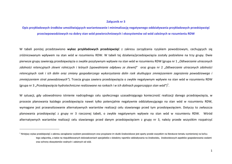 Załącznik nr 3 Opis przykładowych środków umożliwiających wariantowanie i minimalizację negatywnego oddziaływania przykładowych przedsięwzięć przeciwpowodziowych na dobry stan wód powierzchniowych i ekosystemów od wód zależnych w rozumieniu RDW W tabeli poniżej przedstawiono wykaz przykładowych przedsięwzięć z zakresu zarządzania ryzykiem powodziowym, cechujących się zróżnicowanym wpływem na stan wód w rozumieniu RDW. W tabeli tej działania/przedsięwzięcia zostały podzielone na trzy grupy. Dwie pierwsze grupy zawierają przedsięwzięcia o zwykle pozytywnym wpływie na stan wód w rozumieniu RDW (grupa nr 1 „Odtwarzanie utraconych zdolności retencyjnych zlewni rolniczych i leśnych (spowalnianie odpływu ze zlewni)” oraz grupa nr 2 „0dtwarzanie utraconych zdolności retencyjnych rzek i ich dolin oraz zmiany gospodarczego wykorzystania dolin rzek skutkujące zmniejszeniem zagrożenia powodziowego i zmniejszeniem strat powodziowych”). Trzecia grupa zawiera przedsięwzięcia o zwykle negatywnym wpływie na stan wód w rozumieniu RDW (grupa nr 3 „Przedsięwzięcia hydrotechniczne realizowane na rzekach i w ich dolinach pogarszające stan wód”)1. W sytuacji, gdy udowodniono istnienie nadrzędnego celu społecznego uzasadniającego konieczność realizacji danego przedsięwzięcia, w procesie planowania każdego przedsięwzięcia nawet tylko potencjalnie negatywnie oddziaływującego na stan wód w rozumieniu RDW, wymagane jest przeanalizowanie alternatywnych wariantów realizacji celu stawianego przed tym przedsięwzięciem. Dotyczy to zwłaszcza planowania przedsięwzięć z grupy nr 3 rzeczonej tabeli, o zwykle negatywnym wpływie na stan wód w rozumieniu RDW. Wśród alternatywnych wariantów realizacji celu stawianego przed danym przedsięwzięciem z grupy nr 3, należy przede wszystkim rozpatrzyć 1 Niniejszy wykaz przedsięwzięć z zakresu zarządzania ryzykiem powodziowym oraz przypisane im skutki środowiskowe jest oparty przede wszystkim na literaturze tematu wymienionej na końcu tego załącznika, a także na niepublikowanych doświadczeniach specjalistów z dziedziny raportów oddziaływania na środowisko, środowiskowych aspektów gospodarowania wodami oraz ochrony ekosystemów wodnych i zależnych od wód. 1 przedsięwzięcia pozytywnie wpływających na stan wód, należące do grupy nr 1 i 2 przedsięwzięć wymienionych w poniższej tabeli (np. zamiast realizacji przedsięwzięcia nr 3.5 należy rozważyć realizację przedsięwzięć nr 1.1, 1.2, 1.3 i 2.8). W drugiej kolejności należy rozpatrzyć alternatywne, mniej szkodliwe dla stanu wód warianty realizacji celu społeczno-gospodarczego stawianego przed danym przedsięwzięciem, wymienione w obrębie grupy przedsięwzięć nr 3 (np. zamiast realizacji przedsięwzięcia nr 3.5 rozważyć realizację przedsięwzięcia nr 3.1). W przypadku, gdy analiza wariantów realizacji nadrzędnego celu społecznego doprowadzi do przekonywująco uzasadnionego wyboru przedsięwzięcia o negatywnym wpływie na stan wód, konieczne jest zastosowanie wszystkich możliwych środków minimalizujących negatywne oddziaływanie tego przedsięwzięcia. W poniższej tabeli przedstawiono przykłady środków minimalizujących negatywne oddziaływanie przedsięwzięć na stan wód w rozumieniu RDW. Grupa 1 Rodzaj działania/ przedsięwzięcia 2 Wszystkie elementy jakości Krótka charakterystyka działania/ przedsięwzięcia Warunki progowe dopuszczenia działania/ przedsięwzięcia do realizacji; środki minimalizujące negatywne oddziaływanie przedsięwzięcia na dobry stan wód i ekosystemów od wód zależnych w rozumieniu Ramowej Dyrektywy Wodnej2 wybrane do oceny stanu wód (aspekty fizykochemiczne, hydromorfologiczne, biologiczne) wg. listy z zał. V Ramowej Dyrektywy Wodnej oraz rozporządzenia Ministerstwa Środowiska z dn. 22.07.2009. 2 1.1. Zwiększenie retencji glebowej użytków rolnych3 1.2. Ograniczenie i spowolnienie spływu wód z ciągów drenarskich oraz rowów melioracji podstawowej i szczegółowej 1.3. Renaturyzacja mokradeł 1.4. Gospodarka leśna zwiększająca zdolności lasów do retencjonowania wód opadowych i roztopowych Odpowiednie zabiegi agrotechniczne zwiększające właściwości retencyjne gleby: zwiększanie zwiększenie udziału próchnicy w glebie, nieużywanie sprzętu ubijającego warstwę gleby pod warstwą orną i rozluźnienie tej warstwy (np. okresowo wykonywana orka z zastosowaniem pogłębiacza, likwidująca tzw. podeszwę płużną), orka w poprzek stoku, tworzenie tarasów, stosowanie poplonów, odpowiedni dobór upraw Budowa mikrozbiorników gromadzących wodę z ciągów drenarskich; wyposażenie rowów melioracji wodnych szczegółowych i podstawowych w budowle piętrzące wodę; przerywanie zbędnych ciągów drenarskich i likwidacja lub pozostawianie do zarośnięcia zbędnych rowów odwadniających Odtwarzanie osuszonych torfowisk i innych mokradeł (likwidacja i blokowanie rowów odwadniających mokradła) Zwiększenie powierzchni zalesionych; przebudowa drzewostanów w kierunku większego udziału drzewostanów liściastych; zwiększenie udziału martwego drewna w drzewostanach gospodarczych; wyłączanie z użytkowania lasów na siedliskach bagiennych (olsy, bory i lasy bagienne); niestosowanie rębni zupełnej w lasach na siedliskach bagiennych (w tym w olsach) Środki minimalizujące negatywne oddziaływanie nie wymagane Środki minimalizujące negatywne oddziaływanie nie wymagane Środki minimalizujące negatywne oddziaływanie nie wymagane Zalesianie tylko po udowodnieniu braku negatywnych oddziaływań przyrodniczych; do pozostałych działań środki minimalizujące negatywne oddziaływanie zwykle nie wymagane Grupa 2 Rodzaj działania/ przedsięwzięcia 3 Krótka charakterystyka działania/ przedsięwzięcia Warunki progowe dopuszczenia działania/ przedsięwzięcia do realizacji; środki minimalizujące negatywne oddziaływanie pr