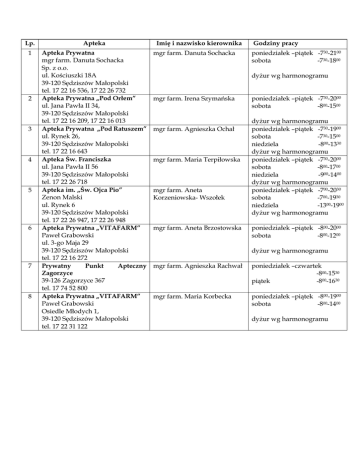 Lp. Apteka Imię i nazwisko kierownika Godziny pracy 1 Apteka