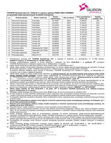 TAURON Dystrybucja S.A. Oddział w Legnicy ogłasza PRZETARG PISEMNY na sprzedaż niżej wymienionych środków transportu: Cena wywoławcza brutto [zł] 6 280,00 Stawka podatku VAT 23% 1 Samochód ciężarowy Fiat Doblo Numer rejestracyjny DL19421 2 Samochód ciężarowy Fiat Doblo DL47021 2007 9 230,00 23% 3 Samochód ciężarowy Fiat Doblo DL47026 2007 11 320,00 23% 4 Samochód ciężarowy Fiat Doblo DL55414 2008 9 470,00 23% 5 Samochód ciężarowy Ford Transit DL47091 2007 16 490,00 23% 6 Samochód ciężarowy Ford Transit DL47093 2007 15 870,00 23% 7 Samochód ciężarowy Ford Transit DL47094 2007 16 730,00 23% 8 Samochód ciężarowy Honker 2N DL28923 2005 6 150,00 23% L.p. Rodzaj pojazdu Marka, model typ Rok produkcji 2003 9 Samochód ciężarowy Honker 2N DL28925 2005 6 770,00 23% 10 Samochód ciężarowy Honker 2N DL66093 2006 6 770,00 23% 11 Samochód ciężarowy Honker 2N DL66094 2006 5 540,00 23% 12 Samochód ciężarowy Honker 2N DL66096 2006 7 010,00 23% 13 Przyczepa lekka Niewiadów BA 7520H DL0105P 2000 1 110,00 23% 14 Przyczepa lekka Niewiadów BA 7520H DL0115P 2000 1 110,00 23% 15 Przyczepa ciężarowa Wiola W2 DL2234P 2007 1 355,00 23% 16 Przyczepa lekka Elbud PL 07 LCP1757 1992 430,00 23% 1. 2. 3. 4. 5. 6. 7. 8. 9. 10. 11. 12. 13. 14. 15. 16. 17. 18. 19. 20. Prowadzącym przetarg jest TAURON Dystrybucja S.A. z siedzibą w Krakowie, ul. Jasnogórska 11, 31-358 Kraków, Oddział w Legnicy: ul. Partyzantów 21, 59-220 Legnica. Przetarg przeprowadzony zostanie w formie pisemnej i odbędzie się dnia 25.02.2016 r. o godzinie 900 w świetlicy TAURON Dystrybucja S.A. Oddział w Legnicy przy ul. Wałbrzyskiej 1 w Legnicy. Każdy oferent może złożyć tylko jedną ofertę na dany środek trwały, z zastrzeżeniem pkt.7. Ofertę należy składać na formularzu ofertowym zamieszczonym na stronie: w w w . t a u r o n - d y s t r y b u c j a . p l (odnośnik: Przetargi ►Pozostałe ogłoszenia, Spółka: TAURON Dystrybucja S.A. Oddział Legnica, Rodzaj postępowania, sprzedaż). Formularze ofertowe dostępne będą również w Kancelarii, TAURON Dystrybucja S.A. Oddział w Legnicy, ul. Partyzantów 21 w Legnicy oraz w miejscu oglądania pojazdów. Ofertę należy składać na każdy środek trwały oddzielnie, w osobnej kopercie, tzn. że każda koperta może zawierać jedną ofertę zakupu jednego środka trwałego. Kopertę należy zaadresować na: T A U R O N D y s t r y b u c j a S . A . O d d z i a ł w L e g n i c y , u l . P a r t y z a n t ó w 2 1 , 5 9 – 2 2 0 L e g n i c a , podać nazwę i adres oferenta oraz oznaczyć: „Przetarg pisemny na środek trwały nr …… → (oznaczenie nr pozycji z tabeli ogłoszenia). Nie otwierać przed 25.02.2016 r. godz. 900” W przypadku nieprawidłowego zaadresowania lub zamknięcia koperty prowadzący przetarg nie bierze odpowiedzialności za złe skierowanie przesyłki i jej przedterminowe otwarcie. Oferty złożone po terminie zostaną zwrócone oferentom bez otwierania. Oferent może wprowadzić zmiany w złożonej ofercie lub ją wycofać, pod warunkiem, że uczyni to przed terminem składania ofert. Zarówno zmiana jak i wycofanie oferty wymagają zachowania formy pisemnej. Powiadomienie o wprowadzeniu zmian lub wycofaniu powinno być opakowane i zaadresowane w ten sam sposób co oferta i opatrzone napisem „ZMIANA” lub „WYCOFANIE”. Oferty należy składać do dnia 24.02.2016 r. do godz. 1500 w Kancelarii TAURON Dystrybucja S.A. Oddział w Legnicy przy ul. Partyzantów 21 w Legnicy. Składający ofertę pozostaje nią związany przez okres 30 dni licząc od dnia wyznaczonego do składania ofert. W razie ustalenia, że kilku oferentów zaoferowało tę samą, najwyższą cenę, prowadzący przetarg informuje tych oferentów o terminie i miejscu kontynuacji przetargu w formie aukcji. Wysokość postąpienia zostanie podana przed rozpoczęciem aukcji. W przypadku obecności wszystkich oferentów, którzy zaoferowali tę samą, najwyższą cenę, prowadzący przetarg kontynuuje przetarg w formie aukcji. Nabywca jest zobowiązany zapłacić cenę nabycia w terminie wyznaczonym przez prowadzącego przetarg, nie dłuższym niż 7 dni od daty zakończenia przetargu. Nabywca jest zobowiązany odebrać nabyty środek transportu w terminie wyznaczonym przez prowadzącego przetarg, nie później niż do dnia 18.03.2016 r. Wszystkie koszty i opłaty związane z zawarciem umowy sprzedaży pokrywa Nabywca w całości. Nabywca, który w wyznaczonym terminie, nie uiści ceny nabycia, lub pisemnie zrezygnuje z nabycia, traci prawa wynikające z wyboru oferty. W tym określonym przypadku prowadzący przetarg powiadamia o możliwości nabycia następnego nabywcę, który zaoferował kolejną najwyższą cenę. Wyniki przetargu ogłoszone będą po rozstrzygnięciu przetargu na stronie internetowej: w w w . t a u r o n - d y s t r y b u c j a . p l (odnośnik: Przetargi ►Pozostałe ogłoszenia, Spółka: TAURON Dystrybucja S.A. Oddział Legnica, Rodzaj postępowania, sprzedaż). TAURON Dystrybucja S.A. Oddział w Legnicy zastrzega sobie prawo do wycofania środka trwałego lub unieważnienia przetargu na każdym jego etapie bez podania przyczyn oraz nie odpowiada za wady fizyczne i braki w wyposażeniu oferowanych środków trwałych. Przystąpienie do przetargu przez oferenta oznacza akceptację warunków sprzedaży środków trwałych zawartych w niniejszym ogłoszeniu. Środki transportu będące przedmiotem przetargu można oglądać w d n i a c h o d 1 5 . 0 2 . 2 0 1 6 r . d o 2 4 . 0 2 . 2 0 1 6 r . w godzinach od 900 do 1200 w Dziale Transportu TAURON Dystrybucja S.A. przy ul. Wałbrzyskiej 1 w Legnicy. Bliższych informacji o przetargu udziela w dni robocze od godziny 900 do 1200: Dział Transportu, tel. 76/88 98 643 oraz 76/88 98 706.