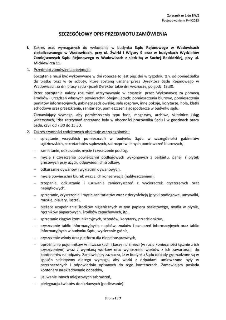 Załącznik nr 1 do SIWZ Postępowanie nr P-4/2013 SZCZEGÓŁOWY OPIS PRZEDMIOTU ZAMÓWIENIA I. Zakres prac wymaganych do wykonania w budynku Sądu Rejonowego w Wadowicach zlokalizowanego w Wadowicach, przy ul. Żwirki i Wigury 9 oraz w budynkach Wydziałów Zamiejscowych Sądu Rejonowego w Wadowicach z siedzibą w Suchej Beskidzkiej, przy ul. Mickiewicza 11. 1. Przedmiot zamówienia obejmuje: Sprzątanie musi byd wykonywane w dni robocze to jest pięd dni w tygodniu tzn. od poniedziałku do piątku oraz w te soboty, które zostaną uznane przez Dyrektora Sądu Rejonowego w Wadowicach za dni pracy Sądu - jeżeli Dyrektor takie dni wyznaczy, po godz. 13:30. Przez sprzątanie należy rozumied utrzymywanie w czystości przez Wykonawcę za pomocą środków i urządzeo własnych powierzchni obejmujących: pomieszczenia biurowe, pomieszczenia punktów informacyjnych, gabinety sędziowskie, sale rozpraw, inne pokoje, korytarze, hole, klatki schodowe oraz przeszklenia, sanitariaty, pomieszczenia gospodarcze w budynku sądu. Zamawiający wymaga, aby pomieszczenia typu kasa, magazyny, archiwa, składnice ksiąg wieczystych, izba zatrzymao sprzątane były w obecności pracownika Sądu i w godzinach pracy Sądu, czyli od 7:30 do 15:30. 2. Zakres czynności codziennych obejmuje w szczególności: sprzątanie wszystkich pomieszczeo w budynku Sądu w szczególności gabinetów sędziowskich, sekretariatów sądowych, sal rozpraw, innych pomieszczeo biurowych, zamiatanie, odkurzanie, mycie i czyszczenie podłóg, mycie i czyszczenie powierzchni podłogowych wykonanych z parkietu, paneli i płytek gresowych przy użyciu odpowiednich środków, odkurzanie dywanów i wykładzin dywanowych, mycie powierzchni biurek wraz z ich konserwacją (nabłyszczaniem), trzepanie, odkurzanie i usuwanie zanieczyszczeo z wycieraczek czyszczących oraz napiętkowych, sprzątanie, czyszczenie i mycie sanitariatów wraz z dezynfekcją (płytki podłogowe, umywalki, muszle, pisuary, lustra), bieżące uzupełnianie środków higienicznych w tym papieru toaletowego, mydła w płynie, ręczników papierowych, środków zapachowych, itp., sprzątanie ciągów komunikacyjnych, schodów, korytarzy, przedsionków, czyszczenie tablic informacyjnych, napisów, znaków i oznaczeo informacyjnych oraz tablic informacyjnych w budynku Sądu, wycieranie gaśnic, czyszczenie windy oraz platform dla niepełnosprawnych, opróżnianie pojemników w niszczarkach i koszy na śmieci (w razie konieczności łącznie z ich czyszczeniem) wraz z wymianą worków oraz wynoszenie worków z ich zawartością do kontenerów na odpady. Zamawiający zaznacza, iż w budynku Sądu odpady gromadzone są w sposób selektywny dlatego wymaga, aby worki z odpadami umieszczane były w przeznaczonych i odpowiednio opisanych do tego kontenerach. Zamawiający posiada kontenery na składowanie odpadów, usuwanie innych miejscowych zabrudzeo, pielęgnacja kwiatów doniczkowych (podlewanie). Strona 1 z 7 Załącznik nr 1 do SIWZ Postępowanie nr P-4/2013 3. Zakres czynności cotygodniowych obejmuje w szczególności: mycie powierzchni drzwi wejściowych/wyjściowych i wewnętrznych, futryn, framug, listew odbojowych, parapetów wewnętrznych, kaloryferów, poręczy i balustrad oraz wszelkich przeszkleo wewnętrznych w korytarzach oraz na klatkach schodowych. W przypadku widocznych zabrudzeo czynnośd tą należy wykonywad w miarę potrzeby. odkurzanie obrazów i sprzętu na terenie budynku, mycie powierzchni glazury, ścianek, kafelek i stolarki drzwiowej w sanitariatach, mycie mebli biurowych oraz ich konserwacja środkami do konserwacji, czyszczenie komputerów, sprzętu biurowego i telefonów (pianką do czyszczenia obudów i powierzchni laminowanych) czyszczenie monitorów oraz wyświetlaczy LCD zainstalowanych przed salami rozpraw (ewokand) pianką do czyszczenia matryc LCD/TFT antystatyczną i bakteriobójczą, przetarcie kontaktów, wyłączników elektrycznych, kompleksowa konserwacja wszystkich rodzajów podłóg, mechaniczne i ręczne odkurzanie regałów i ksiąg w archiwach sądowych, powierzchniowe czyszczenie urządzeo mechanicznych w piwnicach Sądu, czyszczenie ścian pokrytych farbą zmywalną oraz krat wentylacyjnych. 4. Zakres czynności comiesięcznych obejmuje w szczególności: odmrażanie i mycie lodówek, mycie kaloryferów i paneli grzewczych 5. Zakres czynności co kwartalnych obejmuje w szczególności: czyszczenie maszynowe powierzchni korytarzy, klatek schodowych i innych ciągów komunikacyjnych, mycie opraw oświetleniowych – czynnośd ta wymaga demontażu opraw. Wykonawca w ramach świadczonej usługi musi we własnym zakresie zapewnid sobie ewentualną pomoc elektryka, czyszczenie wykładzin dywanowych w ilości 44 szt. i łącznym metrażu ok. 550 m2 oraz dywanów w ilości 32 szt. i łącznym metrażu ok. 173 m2. odkurzanie ścian, sufitów i kątów oraz kratek wentylacyjnych, pranie firan z Oddziału Administracyjnego Sądu Rejonowego w Wadowicach, ul. Żwirki i Wigury 9 w ilości 10 szt. o łącznej powierzchni ok. 100 m2, Pranie firan i zasłon w pomieszczeniach biurowych Wydziałów Zamiejscowych Sądu Rejonowego w Wadowicach z siedzibą w Suchej Beskidzkiej co najmniej trzy razy w roku. czyszczenie tapicerek (krzesła, fotele). 6. Zakres czynności co półrocznych obejmuje w szczególności: całościowe dwustronne mycie stolarki okiennej wraz z szybami. 7. Inne: sprzątanie dodatkowe po ewentualnych remontach i innych tego typu pracach wraz z czyszczeniem wyposażenia o ile zajdzie taka potrzeba. Strona 2 z 7 Załącznik nr 1 do SIWZ Postępowanie nr P-4/2013 ewentualne awaryjne sprzątanie w pomieszczeniach Sądu Rejonowego w tym rozlana woda, opady deszczu, roztopy, itp. 8. Czynności związane z utrzymywaniem w czystości i pielęgnacją terenów zielonych na obszarze działek przyległych do budynków Zamawiającego: regularne koszenie trawnika – dwa razy w miesiącu – oraz wywiezienie trawy po koszeniu; regularne 