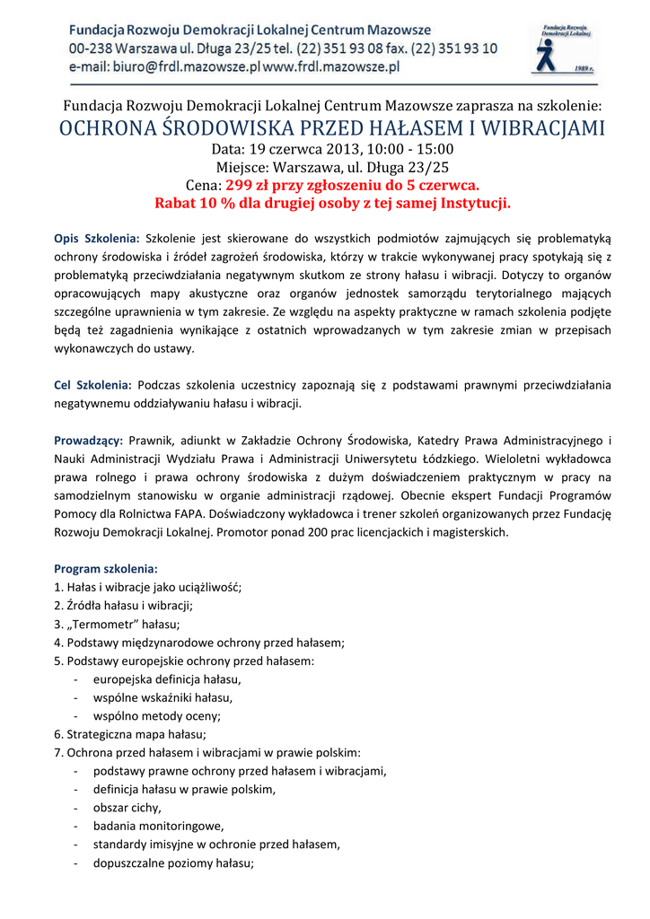 Fundacja Rozwoju Demokracji Lokalnej Centrum Mazowsze zaprasza na szkolenie: OCHRONA ŚRODOWISKA PRZED HAŁASEM I WIBRACJAMI Data: 19 czerwca 2013, 10:00 - 15:00 Miejsce: Warszawa, ul. Długa 23/25 Cena: 299 zł przy zgłoszeniu do 5 czerwca. Rabat 10 % dla drugiej osoby z tej samej Instytucji. Opis Szkolenia: Szkolenie jest skierowane do wszystkich podmiotów zajmujących się problematyką ochrony środowiska i źródeł zagrożeń środowiska, którzy w trakcie wykonywanej pracy spotykają się z problematyką przeciwdziałania negatywnym skutkom ze strony hałasu i wibracji. Dotyczy to organów opracowujących mapy akustyczne oraz organów jednostek samorządu terytorialnego mających szczególne uprawnienia w tym zakresie. Ze względu na aspekty praktyczne w ramach szkolenia podjęte będą też zagadnienia wynikające z ostatnich wprowadzanych w tym zakresie zmian w przepisach wykonawczych do ustawy. Cel Szkolenia: Podczas szkolenia uczestnicy zapoznają się z podstawami prawnymi przeciwdziałania negatywnemu oddziaływaniu hałasu i wibracji. Prowadzący: Prawnik, adiunkt w Zakładzie Ochrony Środowiska, Katedry Prawa Administracyjnego i Nauki Administracji Wydziału Prawa i Administracji Uniwersytetu Łódzkiego. Wieloletni wykładowca prawa rolnego i prawa ochrony środowiska z dużym doświadczeniem praktycznym w pracy na samodzielnym stanowisku w organie administracji rządowej. Obecnie ekspert Fundacji Programów Pomocy dla Rolnictwa FAPA. Doświadczony wykładowca i trener szkoleń organizowanych przez Fundację Rozwoju Demokracji Lokalnej. Promotor ponad 200 prac licencjackich i magisterskich. Program szkolenia: 1. Hałas i wibracje jako uciążliwość; 2. Źródła hałasu i wibracji; 3. „Termometr” hałasu; 4. Podstawy międzynarodowe ochrony przed hałasem; 5. Podstawy europejskie ochrony przed hałasem: - europejska definicja hałasu, - wspólne wskaźniki hałasu, - wspólno metody oceny; 6. Strategiczna mapa hałasu; 7. Ochrona przed hałasem i wibracjami w prawie polskim: - podstawy prawne ochrony przed hałasem i wibracjami, - definicja hałasu w prawie polskim, - obszar cichy, - badania monitoringowe, - standardy imisyjne w ochronie przed hałasem, - dopuszczalne poziomy hałasu; 8. Hałas a planowanie i zagospodarowanie przestrzenne: - hałas a stadium uwarunkowań i kierunków zagospodarowania gminy, - hałas a miejscowy plan zagospodarowania przestrzennego, - obszary ciche w aglomeracji, - obszary ciche wokół zbiorników wodnych; 9. Badanie przestrzegania wymagań imisyjnych: - ocena stanu akustycznego środowiska, - mapy akustyczne, - program ochrony środowiska przed hałasem; 10.Ustalenie dopuszczalnej emisji hałasu i pomiary hałasu w drodze decyzji. ZGŁOSZENIE OCHRONA ŚRODOWISKA PRZED HAŁASEM I WIBRACJAMI Data: 19 czerwca 2013, 10:00 - 15:00 Miejsce: Warszawa, ul. Długa 23/25 Cena: 299 zł przy zgłoszeniu do 5 czerwca. Rabat 10 % dla drugiej osoby z tej samej Instytucji Instytucja: ............................................................................................................................. Adres: ................................................................................................................................... NIP: ...................................................................................................................................... L.p. Imię i nazwisko Wydział tel. e-mail 1. .......................................................................................................................................... 2. .......................................................................................................................................... 3. .......................................................................................................................................... ........................................................... podpis i pieczątka osoby delegującej Zgłoszenie na szkolenie Zgłoszenia prosimy przesyłać do 12 czerwca 2013 r. fax: (22) 351 93 10, e-mail: [email protected] lub wybrać opcje zapisu przez stronę www.frdl.mazowsze.pl Przy zgłoszeniu w ramach Forów prosimy o wpisanie w uwagach: „Zgłoszenie w ramach Forum (nazwa odpowiedniego Forum)”. Ewentualną rezygnację ze szkolenia można zgłosić najpóźniej na dwa dni przed szkoleniem. W przypadku niewykorzystania zgłoszonego uczestnictwa - Urząd będzie zobowiązany do sfinansowania 60% odpłatności za uczestnictwo i materiały. FRDL zastrzega sobie prawo odwołania szkolenia. Miejsce szkolenia: Warszawa, ul. Długa 23/25, Sala Konferencyjna FRDL, III piętro. Dojazd: Metrem do stacji Ratusz Arsenał lub autobusami 116, 178, 180, 222, 503 do przystanku Plac Krasińskich. Cena: 299 zł netto przy zgłoszeniu do 5 czerwca. Cena po 5 czerwca to 350 zł. Rabat 10 % dla drugiej osoby z tej samej Instytucji. Zwolnienie z VAT w przypadku finansowania ze środków publicznych. W cenie materiały szkoleniowe, zaświadczenie, lunch oraz przerwy kawowe. Płatność przelewem, na podstawie faktury wystawionej w dniu szkolenia.