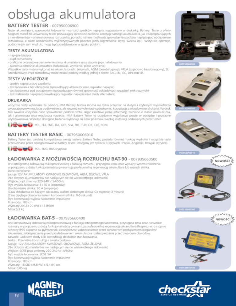 obsługa akumulatora BATTERY TESTER - 007950006900 Tester akumulatora, sprawności ładowania i wartości spadków napięcia, wyposażony w drukarkę. Battery Tester z oferty Magneti Marelli to uniwersalny tester pozwalający sprawdzić zarówno kondycję samego akumulatora, jak i współpracujących z nim elementów – alternatora oraz rozrusznika, ponadto istnieje możliwość sprawdzenia spadków napięcia pod obciążeniem rozrusznika, a także odbiorników wykorzystywanych podczas jazdy (ogrzewanie szyby, światła itp.). Wszystkie operacje, podobnie jak sam wydruk, mogą być przedstawione w języku polskim. TESTY AKUMULATORA - napięcie bieżące - prąd rozruchowy - graficzne procentowe zestawienie stanu akumulatora oraz stopnia jego naładowania. - zalecenia odnośnie akumulatora (naładować, wymienić, pilnie wymienić) Wszystkie testy można wykonać na akumulatorach: żelowych, AGM (bezobsługowy), VRLA (częściowo bezobsługowy), SLI (standardowy). Prąd rozruchowy może zostać podany według jednej z norm: SAE, EN, IEC, DIN oraz JIS. 007950006900 TESTY W POJEŹDZIE - spadek napięcia przy zapalaniu - test ładowania bez obciążenia (sprawdzający alternator oraz regulator napięcia) - test ładowania pod obciążeniem (sprawdzający również sprawność pokładowych urządzeń elektrycznych) - test stabilności napięcia (sprawdzający regulator napięcia oraz diody alternatora) DRUKARKA wszystkie testy wykonane za pomocą MM Battery Testera można nie tylko przejrzeć na dużym i czytelnym wyświetlaczu wyposażonym w regulację podświetlenia, ale również natychmiast wydrukować, korzystając z wbudowanej drukarki. Wydruk taki zawiera wszystkie dane sprawdzone podczas testu, dając klientowi pełną informację zarówno o stanie akumulatora, jak i alternatora oraz regulatora napięcia. MM Battery Tester to urządzenie wyjątkowo proste w obsłudze i przyjazne użytkownikowi. Wszelkie dostępne badania wykonuje się krok po kroku, według instrukcji podawanych przez tester. 007950006900 POL, HU, ENG, ITA, GER, SPA, FRE, TUR, CR, CZE, ROM BATTERY TESTER BASIC - 007950006910 Battery Tester jest bardziej kompaktową wersją testera Battery Tester, posiada również funkcję wydruku i wszystkie testy przewidziane przez oprogramowanie Battery Tester. Dostępny jest tylko w 3 Językach : Polski, Angielski, Rosyjski (cyrylica). POL, ENG, RUS (cyrylica) 007950006910 ŁADOWARKA Z MOŻLIWOŚCIĄ ROZRUCHU BAT-90 - 007935660500 Jest inteligentną ładowarką mikroprocesorową z funkcją rozruchu, przystępna cena oraz wydajny system chłodzenia w połączeniu z dużą funkcjonalnością gwarantują profesjonalną regenerację akumultora lub rozruch silnika. Dane techniczne: Ładuje:12V AKUMULATORY KWASOWE OŁOWIOWE, AGM, ŻELOWE, VRLA (Nie dotyczy akumulatorów nie nadających się do wielokrotnego ładowania) Wejście:prąd zmienny 220-240 V 5A/50Hz Tryb wyjścia ładowania: 5 i 30 A (amperów) Uruchamianie silnika: 90 A (amperów) (Czas chłodzenia po każdym obracaniu wałem korbowym silnika: Co najmniej 3 minuty) (Czas ciągłego obracaniu wałem korbowym silnika: 0-5 sekund) Tryb konserwacji wyjścia: ładowanie impulsowe Przewody: 183 cm Wymiary:20(L) x 20 (W) x 13 (H)cm Masa:6,3 kg NOWOŚĆ! 007935660500 ŁADOWARKA BAT-5 - 007935660400 Jest kompaktową ładowarką mikroprocesorową z funkcja inteligentnego ładowania, przystępna cena oraz niewielkie rozmiary w połączeniu z dużą funkcjonalnością gwarantują profesjonalną regenerację akumultora Bezpieczne: o stopniu ochrony IP65 odporne na pył/rozpryski cieczy/deszcz; zabezpieczenie przed odwrotnym podłączeniem biegunów/ iskrzeniem; zabezpieczenie przed przeładowaniem akumulatora i zabezpieczenie przed zwarciem obwodów. Łatwość: Jaskrawe diody LED identyfikują dokładnie stan ładowania. Lekka : Przenośna konstrukcja i zwarta budowa. Ładuje: 12V AKUMULATORY KWASOWE, OŁOWIOWE, AGM, ŻELOWE (Nie dotyczy akumulatorów nie nadających się do wielokrotnego ładowania) Wejście: SC5E prąd zmienny 220-240 V/1A/50Hz Tryb wyjścia ładowania: SC5E 5A Tryb konserwacji wyjścia: ładowanie impulsowe Przewody: 183 cm Wymiary: 16,0(L) x 9,6 (W) x 5,4 (H) cm Masa: 0,85 kg 18 NOWOŚĆ! 007935660400