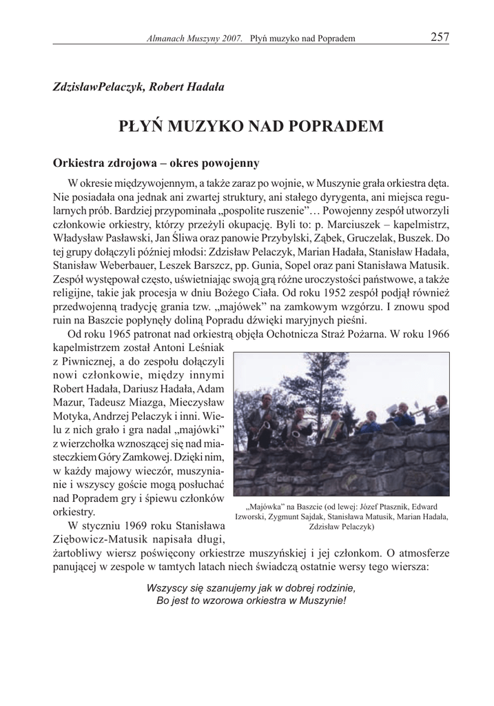 Almanach Muszyny 2007. Płyń muzyko nad Popradem 257 ZdzisławPelaczyk, Robert Hadała PŁYŃ MUZYKO NAD POPRADEM Orkiestra zdrojowa – okres powojenny W okresie międzywojennym, a także zaraz po wojnie, w Muszynie grała orkiestra dęta. Nie posiadała ona jednak ani zwartej struktury, ani stałego dyrygenta, ani miejsca regularnych prób. Bardziej przypominała „pospolite ruszenie”… Powojenny zespół utworzyli członkowie orkiestry, którzy przeżyli okupację. Byli to: p. Marciuszek – kapelmistrz, Władysław Pasławski, Jan Śliwa oraz panowie Przybylski, Ząbek, Gruczelak, Buszek. Do tej grupy dołączyli później młodsi: Zdzisław Pelaczyk, Marian Hadała, Stanisław Hadała, Stanisław Weberbauer, Leszek Barszcz, pp. Gunia, Sopel oraz pani Stanisława Matusik. Zespół występował często, uświetniając swoją grą różne uroczystości państwowe, a także religijne, takie jak procesja w dniu Bożego Ciała. Od roku 1952 zespół podjął również przedwojenną tradycję grania tzw. „majówek” na zamkowym wzgórzu. I znowu spod ruin na Baszcie popłynęły doliną Popradu dźwięki maryjnych pieśni. Od roku 1965 patronat nad orkiestrą objęła Ochotnicza Straż Pożarna. W roku 1966 kapelmistrzem został Antoni Leśniak z Piwnicznej, a do zespołu dołączyli nowi członkowie, między innymi Robert Hadała, Dariusz Hadała, Adam Mazur, Tadeusz Miazga, Mieczysław Motyka, Andrzej Pelaczyk i inni. Wielu z nich grało i gra nadal „majówki” z wierzchołka wznoszącej się nad miasteczkiem Góry Zamkowej. Dzięki nim, w każdy majowy wieczór, muszynianie i wszyscy goście mogą posłuchać nad Popradem gry i śpiewu członków „Majówka” na Baszcie (od lewej: Józef Ptasznik, Edward orkiestry. Izworski, Zygmunt Sajdak, Stanisława Matusik, Marian Hadała, W styczniu 1969 roku Stanisława Zdzisław Pelaczyk) Ziębowicz-Matusik napisała długi, żartobliwy wiersz poświęcony orkiestrze muszyńskiej i jej członkom. O atmosferze panującej w zespole w tamtych latach niech świadczą ostatnie wersy tego wiersza: Wszyscy się szanujemy jak w dobrej rodzinie, Bo jest to wzorowa orkiestra w Muszynie! 258 Zdzisław Pelaczyk, Robert Hadała Początek lat 50. - dyryguje p. Marciuszek Nad Popradem w 1955 r., drugi z lewej Z. Pelaczyk Oktawa Bożego Ciała, koniec lat 50. Boże Ciało 1966 r. Zdjęcie zrobione przez milicyjnego fotografa do akt MO. Od prawej: J. Hojniak, Z. Pelaczyk, M. Hadała, J. Łomnicki (dyr. szkoły), S. Miazga, Z. Skotnicki i inni Połączone orkiestry z Muszyny i Piwnicznej - lata 60. Jedna z wielu uroczystości państwowych (1969 r.) Orkiestra z komendantem OSP Ferdynandem Palejem (pierwszy z lewej w I rzędzie) Na boisku sportowym na Mikowej w 1971 r. Od lewej: kapelmistrz A. Leśniak i M. Hadała Almanach Muszyny 2007. Płyń muzyko nad Popradem Zawody strażackie (Mistrzostwa Polski) w 1972 r. w Nowej Hucie - reprezentacja Muszyny i Piwnicznej 259 I w słońcu, i w deszczu ... lata 70. Trąbki na Baszcie: w latach 50. - 60. (J. Przybylski, M. Hadała, W. Pasławski) oraz współcześnie (J. Ptasznik, E.Izworski, M. Hadała, Z. Pelaczyk, Z. Bajorek) „Tercdecyma” „Tercdecyma” jest zespołem instrumentalno-wokalnym, który został utworzony w 1990 roku. W skład zespołu weszli Joanna Adamczyk (skrzypce), Marta Adamczyk (skrzypce, gitara), Teresa Adamczyk (wokal, konferansjerka), Marian Adamczyk (wokal, akordeon), Zbigniew Bajorek (gitara basowa), Łukasz Bajorek (klarnet), Maria Burghardt (wokal), Agnieszka Gościńska (gitara), Marian Hadała (trąbka), Artur Hadała (klarnet), Dariusz Hadała (trąbka), Elżbieta Hnatkiewicz (skrzypce, wokal), Artur Hajdasz (perkusja), Jacek Hojniak (perkusja), Jan Lulek (klarnet), Stanisława Matusik (saksofon), Mieczysław Motyka (trąbka, perkusja), Zdzisław Pelaczyk (trąbka). Aranżacją utworów i prowadzeniem zespołu zajął się Robert Hadała – co czyni do tej pory. Zespół w swoim repertuarze posiada utwory instrumentalne i wokalne, piosenki stare i nowe – taneczne, ludowe, żołnierskie, okolicznościowe. Uczestniczył w wielu występach w Muszynie i na terenie gminy, a także w Krynicy, Piwnicznej, Nowym Sączu i na Słowacji. 260 Zdzisław Pelaczyk, Robert Hadała Rok kalendarzowy „Tercdecyma” zaczyna od kolędowania w kościele św. Józefa oraz bł. Marii Teresy Ledóchowskiej, a także często w Krynicy. Okres karnawału to spotkania opłatkowe dla kombatantów, osób samotnych i różnych grup społecznych. Czas wiosny, lata i jesieni – to cykl wielu występów dla wczasowiczów, kuracjuszy, a także udział w bieżących wydarzeniach w naszej gminie, począwszy od świąt narodowych (3 maja, 11 listopada), kościelnych (Boże Ciało, prymicje, majówki, wizytacje władz kościelnych), po wszelkiego rodzaju festyny, pikniki rodzinne, ogniska i biesiady. Koniec roku przy dźwiękach kolęd wieńczy zazwyczaj wspólna wigilia dla samotnych. Do osiągnięć „Tercdecymy” należy zajęcie w 1992 roku I miejsca w Wojewódzkim Przeglądzie Orkiestr Dętych i Rozrywkowych w Nowym Sączu. Obecnie skład osobowy jest mniej liczny, zespół przechodzi małą „przebudowę”. Należy podkreślić, że nasi seniorzy, choć przekroczyli siedemdziesiątkę, nadal spełniają się artystycznie. Kolejnym pozytywnym akcentem – w czasach trudnych dla działalności społecznej – jest pojawienie się nowych instrumentalistów. Oby było to zapowiedzią dalszych artystycznych sukcesów naszego zespołu. Śpiewać i grać można wszędzie ... ... na tarasie kawiarni „Szarotka”, przed pawilonem handlowym „Poprad”... oraz gościnnie u sąsiadów
