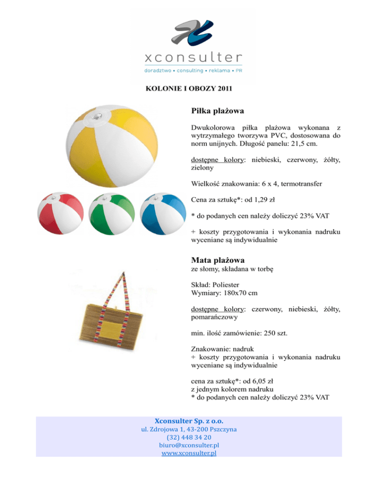 KOLONIE I OBOZY 2011 Piłka plażowa Dwukolorowa piłka plażowa wykonana z wytrzymałego tworzywa PVC, dostosowana do norm unijnych. Długość panelu: 21,5 cm. dostępne kolory: niebieski, czerwony, żółty, zielony Wielkość znakowania: 6 x 4, termotransfer Cena za sztukę*: od 1,29 zł * do podanych cen należy doliczyć 23% VAT + koszty przygotowania i wykonania nadruku wyceniane są indywidualnie Mata plażowa ze słomy, składana w torbę Skład: Poliester Wymiary: 180x70 cm dostępne kolory: czerwony, niebieski, żółty, pomarańczowy min. ilość zamówienie: 250 szt. Znakowanie: nadruk + koszty przygotowania i wykonania nadruku wyceniane są indywidualnie cena za sztukę*: od 6,05 zł z jednym kolorem nadruku * do podanych cen należy doliczyć 23% VAT Xconsulter Sp. z o.o. ul. Zdrojowa 1, 43-200 Pszczyna (32) 448 34 20 [email protected] www.xconsulter.pl Torba Uniwersalna torba z poliestru, doskonała we wszystkich wakacyjnych sceneriach. Możesz ją zabrać na zakupy, basen lub nad jezioro czy plażę. dostępne kolory: czerwony, żółty, granatowy, zielony, pomarańcz Rozmiar 47 x 34,5 x 10 Wielkość znakowania 20 x 15 / Termotransfer + koszty przygotowania i wykonania nadruku wyceniane są indywidualnie Cena za sztukę*: od 9,22 zł * do podanych cen należy doliczyć 23% VAT Pojemnik plażowy na dokumenty Wodoodporne etui na klucze, pieniądze lub dokumenty. Idealne kiedy chcesz popływać. z nadrukiem + koszty przygotowania i wykonania nadruku wyceniane są indywidualnie Cena za sztukę* : od 0,82 zł * do podanych cen należy doliczyć 23% VAT Xconsulter Sp. z o.o. ul. Zdrojowa 1, 43-200 Pszczyna (32) 448 34 20 [email protected] www.xconsulter.pl Frisbee latające dyski (talerze) używane w sporcie i rekreacji Dostępne w szerokiej gamie kolorystycznej, nadruk. Cena za sztukę* : od 1,79 zł * do podanych cen należy doliczyć 23% VAT + koszty przygotowania i wykonania nadruku wyceniane są indywidualnie Oferta ważna do 30.06.2011 Po tym terminie prosimy o wysyłanie zapytań celem potwierdzenia ceny. Z poważaniem, Dział Sprzedaży (32) 448 34 20 [email protected] Xconsulter Xconsulter Sp. z o.o. ul. Zdrojowa 1, 43-200 Pszczyna (32) 448 34 20 [email protected] www.xconsulter.pl