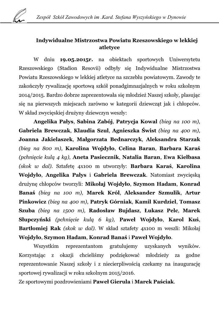 Zespół Szkół Zawodowych im .Kard. Stefana Wyszyńskiego w Dynowie Indywidualne Mistrzostwa Powiatu Rzeszowskiego w lekkiej atletyce W dniu 19.05.2015r. na obiektach sportowych Uniwersytetu Rzeszowskiego (Stadion Resovii) odbyły się Indywidualne Mistrzostwa Powiatu Rzeszowskiego w lekkiej atletyce na szczeblu powiatowym. Zawody te zakończyły rywalizację sportową szkół ponadgimnazjalnych w roku szkolnym 2014/2015. Bardzo dobrze zaprezentowała się młodzież Naszej szkoły, plasując się na pierwszych miejscach zarówno w kategorii dziewcząt jak i chłopców. W skład zwycięskiej drużyny dziewczyn weszły: Angelika Pałys, Sabina Zabój, Patrycja Kowal (bieg na 100 m), Gabriela Brewczak, Klaudia Szul, Agnieszka Świst (bieg na 400 m), Joanna Jakielaszek, Małgorzata Bednarczyk, Aleksandra Starzak (bieg na 800 m), Karolina Wojdyło, Celina Baran, Barbara Karaś (pchnięcie kulą 4 kg), Aneta Pasiecznik, Natalia Baran, Ewa Kiełbasa (skok w dal). Sztafetę 4x100 m utworzyły: Barbara Karaś, Karolina Wojdyło, Angelika Pałys i Gabriela Brewczak. Natomiast zwycięską drużynę chłopców tworzyli: Mikołaj Wojdyło, Szymon Hadam, Konrad Banaś (bieg na 100 m), Marek Król, Aleksander Szmulik, Artur Pinkowicz (bieg na 400 m), Patryk Górniak, Kamil Kurdziel, Tomasz Szuba (bieg na 1500 m), Radosław Bujdasz, Łukasz Pelc, Marek Słupczyński (pchnięcie kulą 6 kg), Paweł Wojdyło, Karol Kuś, Bartłomiej Rak (skok w dal). W skład sztafety 4x100 m weszli: Mikołaj Wojdyło, Szymon Hadam, Konrad Banaś i Paweł Wojdyło. Wszystkim Korzystając z reprezentantom okazji chcieliśmy gratulujemy uzyskanych podziękować młodzieży wyników. za godne reprezentowanie Naszej szkoły i z niecierpliwością czekamy na inaugurację sportowej rywalizacji w roku szkolnym 2015/2016. Ze sportowymi pozdrowieniami Paweł Gierula i Marek Paściak. Zespół Szkół Zawodowych im .Kard. Stefana Wyszyńskiego w Dynowie