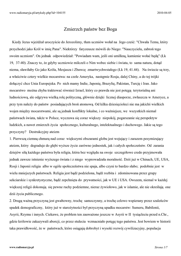 www.radiomaryja.pl/artykuly.php?id=104155 2010-04-05 Zmierzch państw bez Boga Kiedy Jezus wjeżdżał uroczyście do Jerozolimy, tłum uczniów wołał na Jego cześć: "Chwała Temu, który przychodzi jako Król w imię Pana". Niektórzy faryzeusze mówili do Niego: "Nauczycielu, zabroń tego swoim uczniom". On jednak odpowiedział: "Powiadam wam, jeśli oni umilkną, kamienie wołać będą" (Łk 19, 37-40). Znaczy to, że gdyby uczniowie milczeli o Nim wobec siebie i świata, to sama natura, dotąd niema, sławiłaby Go jako Króla, Mesjasza i Zbawcę zmartwychwstałego (Łk 19, 41.44). Na świecie są trzy, a właściwie cztery wielkie mocarstwa: na czele Ameryka, następnie Rosja, dalej Chiny, a do tej trójki dołączyć chce Unia Europejska. Po nich mamy Indie, Japonię, Brazylię, Pakistan, Turcję i Iran. Jako mocarstwo można chyba traktować również Izrael, który co prawda nie jest potęgą terytorialną ani ludnościową, ale odgrywa wielką rolę polityczną, głównie dzięki licznej diasporze, zwłaszcza w Ameryce, a przy tym należy do państw posiadających broń atomową. Od kilku dziesięcioleci nie ma jakichś wielkich wojen między mocarstwami, ale są jednak konflikty lokalne, i co ważniejsze, we wszystkich niemal państwach świata, także w Polsce, wyczuwa się coraz większy niepokój, pogarszanie się perspektyw ludzkich, a nawet zmierzch życia społecznego, kulturalnego, intelektualnego i duchowego. Jakie są tego przyczyny? Destrukcyjny ateizm 1. Pierwszą ciemną chmurą nad coraz większymi obszarami globu jest wojujący i zarazem pesymizujący ateizm, który degraduje do głębi wyższe życie zarówno jednostek, jak i całych społeczeństw. Od zarania dziejów siłą każdego państwa była religia, która bez względu na swoje szczegółowe credo przyjmowała jednak zawsze istnienie wyższego świata i z niego wyprowadzała moralność. Dziś już w Chinach, UE, USA, Rosji i Japonii religia albo w ogóle społeczeństwa nie spaja, albo czyni to bardzo słabo; podobnie jest w wielu mniejszych państwach. Religia jest bądź podzielona, bądź rozbita i zdominowana przez grupy sekciarskie i synkretystyczne, bądź zepchnięta do prywatności, jak w UE i USA. Owszem, niemal w każdej większej religii dokonują się pewne ruchy podziemne, nieraz żywiołowo, jak w islamie, ale nie określają one dziś życia publicznego. 2. Drugą ważną przyczyną jest gwałtowny, trochę samoczynny, a trochę celowo wspierany przez szaleńców spadek demograficzny, który już w starożytności był przyczyną upadku mocarstw: Sumeru, Babilonii, Asyrii, Rzymu i innych. Ciekawe, że problem ten zauważono jeszcze w Asyrii w II tysiącleciu przed n.Chr., gdzie królowie zakazywali aborcji, co przez stulecia wzmacniało potęgę tego państwa. Jest bowiem w historii taka prawidłowość, że w państwach, które osiągają dobrobyt i wysoki rozwój cywilizacyjny, populacja www.radiomaryja.pl Strona 1/7 szybko się zmniejsza, ludzie nie chcą mieć dzieci, bo to naraża na trudy, słabną więzi małżeńskie i rodzinne, hołduje się życiu przyjemnościowemu, bez wysiłku, pozbawionemu dyscypliny zarówno społecznej, jak i moralnej. Wówczas takie państwa stopniowo poddają się penetracji ludów o niższej cywilizacji, ale większej dyscyplinie. I tak dzieje się też na naszych oczach. UE zalewana jest falą ludności z Afryki, Bliskiego Wschodu i Małej Azji. W USA tłoczno jest od Latynosów i Azjatów. W Rosji coraz bardziej zauważalna jest obecność ludów kaukaskich oraz Chińczyków. Paradoksalnie niebezpieczeństwo to rozumiał Stalin i na pewien czas zakazał w Rosji aborcji; zakaz ten zniesiono dopiero po jego śmierci. Na przykład w Niemczech mieszka już blisko 13 mln muzułmanów i wznosi się około tysiąca meczetów. W tej sytuacji jest więc zrozumiałe, dlaczego Niemcy chcą tak zdecydowanie germanizować wszelkie dzieci nieniemieckie. Francja liczy ok. 10 mln muzułmanów oraz innych emigrantów z Afryki i Azji. W Wielkiej Brytanii sytuacja jest chyba jeszcze gorsza. Państwa te przygotowują ustawy zdecydowanie ograniczające imigrację, zwłaszcza spoza Europy, chociaż Niemcy już nawet polskich robotników nie chcą przyjmować. Okazuje się - choć się tego nie nagłaśnia - że w Polsce też już powstają meczety, np. w Warszawie budowa meczetu jest sponsorowana przez Arabię Saudyjską, w której za posiadanie chrześcijańskiej Biblii grozi śmierć. 3. Do absurdu doprowadzona została także - znana już w zaczątkowej formie od II tysiąclecia przed n.Chr. w Mezopotamii - ekonomia pieniądza. Dzisiejszy system finansowy świata oderwany jest od rzeczywistości, ma charakter raczej tylko wirtualny, bez realnych wartości finansowych (W. Bojarski), odgrywa rolę polityczną i ideologiczną i może rujnować całe państwa. Skutkiem takiej sytuacji jest m.in. fakt, że USA zadłużone są na ok. 10 bilionów dolarów (za 10 lat będzie to prawdopodobnie 20 bilionów), w tym głównie w Chinach. I w ten oto sposób niezadługo Państwo Środka będzie mogło sterować gospodarką amerykańską. Druga potęga finansowa - Niemcy - są zadłużone na ponad 1,5 biliona euro. Choć niektórzy niemieccy oligarchowie są na tyle majętni, że mogą sobie pozwolić na kupno wysp greckich, bo Grecja bankrutuje m.in. z powodu wejścia do UE. W Polsce dług publiczny sięga niemal 700 mld złotych. W systemie finansowym często brakuje podstawowej logiki. Oto np. Oslo przyznało prezydentowi Barackowi Obamie Pokojową Nagrodę Nobla w wysokości 1,5 mln dolarów, a na organizację jego wizyty przeznaczono ponad 6 mln dolarów. Albo taki krezus meksykański Carlos Slim Helu, według miesięcznika "Forbes", ma fortunę wynoszącą ponad 50 mld dolarów i może sobie kupić całe jakieś państwo. 4. Dochodzą też do głosu dawne utopijne dążenia do osłabienia instytucji państwa, które przecież było budowane z ogromnym trudem od tysięcy l