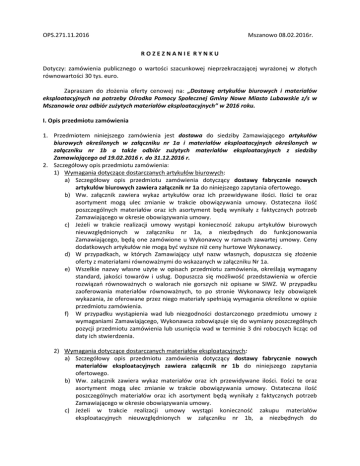 OPS.271.11.2016 Mszanowo 08.02.2016r. ROZEZNANIE RYNKU Dotyczy: zamówienia publicznego o wartości szacunkowej nieprzekraczającej wyrażonej w złotych równowartości 30 tys. euro. Zapraszam do złożenia oferty cenowej na: „Dostawę artykułów biurowych i materiałów eksploatacyjnych na potrzeby Ośrodka Pomocy Społecznej Gminy Nowe Miasto Lubawskie z/s w Mszanowie oraz odbiór zużytych materiałów eksploatacyjnych” w 2016 roku. I. Opis przedmiotu zamówienia 1. Przedmiotem niniejszego zamówienia jest dostawa do siedziby Zamawiającego artykułów biurowych określonych w załączniku nr 1a i materiałów eksploatacyjnych określonych w załączniku nr 1b a także odbiór zużytych materiałów eksploatacyjnych z siedziby Zamawiającego od 19.02.2016 r. do 31.12.2016 r. 2. Szczegółowy opis przedmiotu zamówienia: 1) Wymagania dotyczące dostarczanych artykułów biurowych: a) Szczegółowy opis przedmiotu zamówienia dotyczący dostawy fabrycznie nowych artykułów biurowych zawiera załącznik nr 1a do niniejszego zapytania ofertowego. b) Ww. załącznik zawiera wykaz artykułów oraz ich przewidywane ilości. Ilości te oraz asortyment mogą ulec zmianie w trakcie obowiązywania umowy. Ostateczna ilość poszczególnych materiałów oraz ich asortyment będą wynikały z faktycznych potrzeb Zamawiającego w okresie obowiązywania umowy. c) Jeżeli w trakcie realizacji umowy wystąpi konieczność zakupu artykułów biurowych nieuwzględnionych w załączniku nr 1a, a niezbędnych do funkcjonowania Zamawiającego, będą one zamówione u Wykonawcy w ramach zawartej umowy. Ceny dodatkowych artykułów nie mogą być wyższe niż ceny hurtowe Wykonawcy. d) W przypadkach, w których Zamawiający użył nazw własnych, dopuszcza się złożenie oferty z materiałami równoważnymi do wskazanych w załączniku Nr 1a. e) Wszelkie nazwy własne użyte w opisach przedmiotu zamówienia, określają wymagany standard, jakości towarów i usług. Dopuszcza się możliwość przedstawienia w ofercie rozwiązań równoważnych o walorach nie gorszych niż opisane w SIWZ. W przypadku zaoferowania materiałów równoważnych, to po stronie Wykonawcy leży obowiązek wykazania, że oferowane przez niego materiały spełniają wymagania określone w opisie przedmiotu zamówienia. f) W przypadku wystąpienia wad lub niezgodności dostarczonego przedmiotu umowy z wymaganiami Zamawiającego, Wykonawca zobowiązuje się do wymiany poszczególnych pozycji przedmiotu zamówienia lub usunięcia wad w terminie 3 dni roboczych licząc od daty ich stwierdzenia. 2) Wymagania dotyczące dostarczanych materiałów eksploatacyjnych: a) Szczegółowy opis przedmiotu zamówienia dotyczący dostawy fabrycznie nowych materiałów eksploatacyjnych zawiera załącznik nr 1b do niniejszego zapytania ofertowego. b) Ww. załącznik zawiera wykaz materiałów oraz ich przewidywane ilości. Ilości te oraz asortyment mogą ulec zmianie w trakcie obowiązywania umowy. Ostateczna ilość poszczególnych materiałów oraz ich asortyment będą wynikały z faktycznych potrzeb Zamawiającego w okresie obowiązywania umowy. c) Jeżeli w trakcie realizacji umowy wystąpi konieczność zakupu materiałów eksploatacyjnych nieuwzględnionych w załączniku nr 1b, a niezbędnych do d) e) f) g) h) i) j) k) l) m) funkcjonowania Zamawiającego, będą one zamówione u Wykonawcy w ramach zawartej umowy. Zamawiający dopuszcza składanie ofert równoważnych w stosunku do oryginalnych materiałów produkowanych przez producentów urządzeń. Zamawiający pod pojęciem „produkt równoważny” rozumie produkt o parametrach takich samych bądź lepszych (pojemność tuszu, tonera, wydajność i jakość wydruku), kompatybilny ze sprzętem, do którego jest zamawiany, wyjątek stanowią materiały eksploatacyjne do drukarki HP Office Jet Pro 8100 (HP 950 Czarny, HP 950XL Czarny, HP 951XL C / M / Y) – w tym przypadku Zamawiający nie dopuszcza zastosowania produktów równoważnych, czyli tuszów zamiennych – pod uwagę będą brane jedynie oferty zawierające cenę oryginalnych materiałów eksploatacyjnych (tuszów) firmy HP. Zamawiający wymaga, aby oferowane materiały eksploatacyjne (również równoważne) nie były produktem regenerowanym i poddanym procesowi ponownego napełniania. Wszystkie elementy wchodzące w skład oferowanych materiałów muszą być fabrycznie nowe, nieregenerowane, niefabrykowane, niewchodzące wcześniej (pierwotnie), w całości ani też w części w skład innych materiałów. Wykonawca składając ofertę na produkty równoważne musi dołączyć stosowne certyfikaty/dokumenty potwierdzające równoważność oferowanych materiałów eksploatacyjnych potwierdzenie zgodności parametrów technicznych (raport z testów wydajności), w tym wydajności określonych na podstawie norm ISO/IEC 19752 dla tonerów monochromatycznych, ISO/IEC 24711 dla wkładów atramentowych, ISO/IEC 19798 dla kaset do kolorowych drukarek laserowych lub norm równoważnych). Wykonawca gwarantuje, że dostarczone materiały eksploatacyjne będą wysokiej jakości, zapewnia kompatybilność pracy z urządzeniem zamawiającego, i bezpieczeństwo oraz posiadają właściwe opakowanie i oznakowanie. Wykonawca gwarantuje, że zamontowanie i użytkowanie dostarczonych przez niego materiałów eksploatacyjnych nie spowoduje utraty praw gwarancji producenta urządzenia, do którego są przeznaczone. Jeżeli w trakcie realizacji umowy zamawiający stwierdzi, iż wydajność, jakość lub niezawodność dostarczonych produktów niekorzystnie odbiega od wymagań producenta drukarek, kserokopiarek, faxów wykonawca zobowiązuje się do gwarancyjnej wymiany produktu na nowy w terminie 48 godzin (w dni robocze) od momentu zgłoszenia przez Zamawiającego o wadliwym produkcie (e-mail lub faxem). Wymiana nastąpi w siedzibie Zamawiającego na koszt i ryzyko Wykonawcy. Wykonawca zobowiązuje się do pokrycia kosztów naprawy drukar