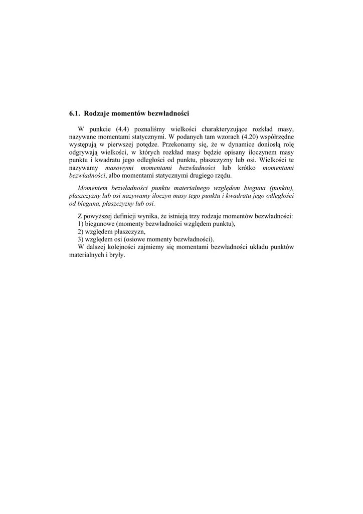 6.1. Rodzaje momentów bezwładności W punkcie (4.4) poznaliśmy wielkości charakteryzujące rozkład masy, nazywane momentami statycznymi. W podanych tam wzorach (4.20) współrzędne występują w pierwszej potędze. Przekonamy się, że w dynamice doniosłą rolę odgrywają wielkości, w których rozkład masy będzie opisany iloczynem masy punktu i kwadratu jego odległości od punktu, płaszczyzny lub osi. Wielkości te nazywamy masowymi momentami bezwładności lub krótko momentami bezwładności, albo momentami statycznymi drugiego rzędu. Momentem bezwładności punktu materialnego względem bieguna (punktu), płaszczyzny lub osi nazywamy iloczyn masy tego punktu i kwadratu jego odległości od bieguna, płaszczyzny lub osi. Z powyższej definicji wynika, że istnieją trzy rodzaje momentów bezwładności: 1) biegunowe (momenty bezwładności względem punktu), 2) względem płaszczyzn, 3) względem osi (osiowe momenty bezwładności). W dalszej kolejności zajmiemy się momentami bezwładności układu punktów materialnych i bryły. 6.2. Momenty bezwładności układu punktów materialnych Załóżmy, że mamy układ materialny złożony z n punktów materialnych o masach mk znajdujących się w punktach Ak opisanych wektorami wodzącymi rk (rys. 6.1). rk = x k i + y k j + z k . z h kz xk mk yk Ak h ky rk zk h kx O Biegunowym momentem bezwładności IO układu punktów materialnych względem punktu O nazywamy sumę iloczynów mas mk i kwadratów ich odległości rk2 od punktu 0, czyli y x Rys. 6.1. Opis położenia punktu materialnego IO = n ∑ m r = ∑ m (x 2 k k k k =1 2 k ) + y 2k + z 2k . (6.1) Momentami bezwładności Ixy, Iyz, Izx względem płaszczyzn xy, yz, zx układu punktów materialnych nazywamy sumy iloczynów mas mk przez kwadraty ich odległości od tych płaszczyzn. Zatem mamy: I xy = n ∑ k =1 m k z 2k , I yz = n ∑ m k x 2k , I zx = k =1 n ∑m y k 2 k . (6.2) k =1 Momentami bezwładności Ix, Iy, Iz względem osi x, y, z układu punktów materialnych nazywamy sumy iloczynów mas mk oraz kwadratów ich odległości od tych osi: ( ) ( ) ( ) n n ⎫ I x = ∑ m k h 2kx = ∑ m k y 2k + z 2k ,⎪ k =1 k =1 ⎪ n n 2 2 ⎪ 2 I y = ∑ m k h ky = ∑ m k z k + x k , ⎬ k =1 k =1 ⎪ n n 2 2 2 ⎪ I z = ∑ m k h kz = ∑ m k x k + y k . ⎪ k =1 k =1 ⎭ (6.3) Oprócz zdefiniowanych wyżej momentów bezwładności względem punktu, płaszczyzn i osi w dynamice ważną rolę odgrywają wielkości, które nazywamy momentami dewiacyjnymi (albo momentami mieszanymi lub odśrodkowymi). Momentami dewiacyjnymi Dxy, Dyz, Dzx układu punktów materialnych nazywamy sumę iloczynów mas mk przez iloczyn ich odległości od dwóch prostopadłych płaszczyzn yz i zx, zy i xy, xy i yz. Momenty te wyrażają wzory: n ⎫ D xy = D yx = ∑ m k x k y k ,⎪ k =1 ⎪ n ⎪ D yz = D zy = ∑ m k y k z k , ⎬ k =1 ⎪ n D zx = D xz = ∑ m k z k x k . ⎪⎪ k =1 ⎭ (6.4) Momenty dewiacyjne mogą przyjmować wartości zarówno dodatnie, jak i ujemne, ponieważ w powyższych wzorach − w przeciwieństwie do momentów bezwładności − występują iloczyny, a nie kwadraty współrzędnych. Ponadto wykażemy, że jeżeli jedna z dwóch płaszczyzn, względem których obliczamy momenty dewiacyjne, jest płaszczyzną symetrii rozpatrywanego układu materialnego (bryły), to odpowiednie momenty dewiacyjne są równe zeru. Załóżmy, że płaszczyzną symetrii jest płaszczyzna xy. W tym przypadku każdemu punktowi Ak o współrzędnych xk, yk, zk i masie mk odpowiada − na zasadzie symetrii − inny punkt A k ′ o współrzędnych xk, yk, –zk i takiej samej masie mk. Momenty dewiacyjne tych dwóch punktów będą równe zeru: m k x k z k + m k x k (− z k ) = m k x k (z k − z k ) = 0, m k y k z k + m k y k (− z k ) = m k y k (z k − z k ) = 0, czyli dwa z trzech momentów dewiacyjnych będą równe zeru: Dzx = Dyz = 0. Łatwo się przekonać, że jeżeli układ materialny ma dwie płaszczyzny symetrii, to wszystkie momenty dewiacyjne będą równe zeru. Powyższa własność momentów dewiacyjnych ma duże znaczenie w obliczeniach praktycznych. 6.3. Momenty bezwładności bryły Jeżeli bryłę o masie m podzielimy myślowo na n małych elementów o masach ∆mk (rys. 6.2), to przybliżone z wartości momentów bezwładności ∆mk tych elementów, traktowanych jako rk punkty materialne, możemy obliczyć ze wzorów (6.1)–(6.4) na momenty bezwładności układu punktów O materialnych. Dokładne wartości momentów y bezwładności otrzymamy, biorąc x granicę sum przy liczbie elementów n dążących do nieskończoności. Rys. 6.2. Opis położenia dowolnego elementu Wtedy zamiast sum otrzymamy całki bryły sztywnej rozciągnięte na całą masę m. Biegunowy moment bezwładności I O = lim n→∞ n ∑ ∆m r = ∫ r dm = ∫ (x 2 k k 2 k =1 m 2 ) + y 2 + z 2 dm Z rachunku całkowego m wiadomo, że całka sumy funkcji jest równa sumie całek poszczególnych funkcji: IO = ∫ (x m 2 ) + y 2 + z 2 dm = ∫ x 2 dm + ∫ y 2 dm + ∫ z 2 dm . m m (6.5) m Występujące w powyższym wzorze całki są momentami bezwładności względem płaszczyzn: I yz = x 2 dm,I zx = y 2 dm,I xy = z 2 dm . (6.6) ∫ m ∫ m ∫ m Ze wzoru (6.5) wynika następujące twierdzenie: Biegunowy moment bezwładności jest równy sumie momentów bezwładności względem trzech prostopadłych płaszczyzn przechodzących przez ten biegun: I O = I yz + I zx + I xy . Zależności na momenty bezwładności względem osi mają postać: (6.7) ∫ (y = ∫ (z = ∫ (x Ix = m Iy m Iz m ⎫ + z 2 dm = ∫ y 2 dm + ∫ z 2 dm, ⎪ m m ⎪⎪ 2 + x 2 dm = ∫ z 2 dm + ∫ x 2 dm, ⎬ m m ⎪ 2 + y 2 dm = ∫ x 2 dm + ∫ y 2 dm.⎪ m m ⎭⎪ 2 ) ) ) (6.8) W powyższych wzorach łatwo można zauważyć, że związki między momentami bezwładności względem osi i względem płaszczyzn są następujące: I x = I zx + I xy ,I y = I xy + I yz ,I z = I yz + I zx . (6.9) Z pierwszego wzoru (6.9) wynika, 