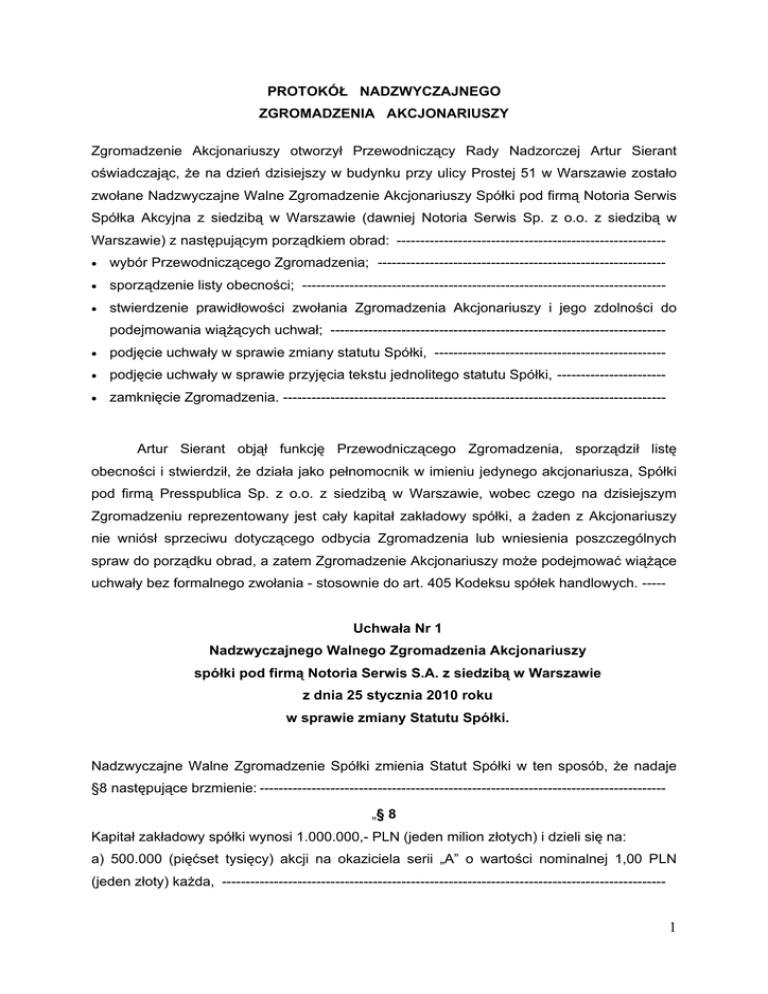PROTOKÓŁ NADZWYCZAJNEGO ZGROMADZENIA AKCJONARIUSZY Zgromadzenie Akcjonariuszy otworzył Przewodniczący Rady Nadzorczej Artur Sierant oświadczając, że na dzień dzisiejszy w budynku przy ulicy Prostej 51 w Warszawie zostało zwołane Nadzwyczajne Walne Zgromadzenie Akcjonariuszy Spółki pod firmą Notoria Serwis Spółka Akcyjna z siedzibą w Warszawie (dawniej Notoria Serwis Sp. z o.o. z siedzibą w Warszawie) z następującym porządkiem obrad: --------------------------------------------------------• wybór Przewodniczącego Zgromadzenia; ------------------------------------------------------------- • sporządzenie listy obecności; ----------------------------------------------------------------------------- • stwierdzenie prawidłowości zwołania Zgromadzenia Akcjonariuszy i jego zdolności do podejmowania wiążących uchwał; ----------------------------------------------------------------------- • podjęcie uchwały w sprawie zmiany statutu Spółki, ------------------------------------------------- • podjęcie uchwały w sprawie przyjęcia tekstu jednolitego statutu Spółki, ----------------------- • zamknięcie Zgromadzenia. --------------------------------------------------------------------------------- Artur Sierant objął funkcję Przewodniczącego Zgromadzenia, sporządził listę obecności i stwierdził, że działa jako pełnomocnik w imieniu jedynego akcjonariusza, Spółki pod firmą Presspublica Sp. z o.o. z siedzibą w Warszawie, wobec czego na dzisiejszym Zgromadzeniu reprezentowany jest cały kapitał zakładowy spółki, a żaden z Akcjonariuszy nie wniósł sprzeciwu dotyczącego odbycia Zgromadzenia lub wniesienia poszczególnych spraw do porządku obrad, a zatem Zgromadzenie Akcjonariuszy może podejmować wiążące uchwały bez formalnego zwołania - stosownie do art. 405 Kodeksu spółek handlowych. ----Uchwała Nr 1 Nadzwyczajnego Walnego Zgromadzenia Akcjonariuszy spółki pod firmą Notoria Serwis S.A. z siedzibą w Warszawie z dnia 25 stycznia 2010 roku w sprawie zmiany Statutu Spółki. Nadzwyczajne Walne Zgromadzenie Spółki zmienia Statut Spółki w ten sposób, że nadaje §8 następujące brzmienie: -------------------------------------------------------------------------------------„§ 8 Kapitał zakładowy spółki wynosi 1.000.000,- PLN (jeden milion złotych) i dzieli się na: a) 500.000 (pięćset tysięcy) akcji na okaziciela serii „A” o wartości nominalnej 1,00 PLN (jeden złoty) każda, ---------------------------------------------------------------------------------------------- 1 b) 1 (jedna) akcja na okaziciela serii „B” o wartości nominalnej 1,00 PLN (jeden złoty) każda, ---c) 499.999 (czterysta dziewięćdziesiąt tysięcy dziewięćset dziewięćdziesiąt dziewięć) akcji na okaziciela serii „C” o wartości nominalnej 1,00 PLN (jeden złoty) każda.” --------------------Przewodniczący Nadzwyczajnego Walnego Zgromadzenia Akcjonariuszy stwierdził, że uchwała została podjęta jednogłośnie, przy 500.000 (pięciuset tysiącach) głosów ważnych i oddanych „za”, przy braku głosów „przeciw” i „wstrzymujących się”, przy czym liczba akcji z których oddano ważne głosy wyniosła 500.000, co stanowi 100% (sto procent) kapitału zakładowego.------------------------------------------------------------------------------------------------------- Uchwała Nr 2 Nadzwyczajnego Walnego Zgromadzenia Akcjonariuszy spółki pod firmą Notoria Serwis S.A. z siedzibą w Warszawie z dnia 25 stycznia 2010 roku w sprawie przyjęcia tekstu jednolitego statutu Spółki. Nadzwyczajne Walne Zgromadzenie Spółki przyjmuje tekst jednolity statutu Spółki: ----------„STATUT SPÓŁKI AKCYJNEJ NOTORIA SERWIS S.A. I Postanowienia ogólne §1 Spółka powstała w wyniku przekształcenia Notoria Serwis spółka z ograniczoną odpowiedzialnością w spółkę akcyjną. Założycielem Spółki jest Presspublica Spółka z ograniczoną odpowiedzialnością z siedzibą w Warszawie – jedyny wspólnik Notoria Serwis spółka z ograniczoną odpowiedzialnością. ---------------------------------------------------------------§2 1. Firma Spółki brzmi: Notoria Serwis Spółka Akcyjna. --------------------------------------- 2. Spółka może używać w obrocie skrótu firmy: Notoria Serwis S.A. i wyróżniającego ją znaku graficznego. ----------------------------------------------------------------------------------------§3 Siedzibą Spółki jest miasto stołeczne Warszawa. ------------------------------------------------------§4 Spółka działa na obszarze Rzeczypospolitej Polskiej i za granicą. ---------------------------------- 2 §5 Czas trwania Spółki jest nieoznaczony. -------------------------------------------------------------------II Przedmiot działalności Spółki §6 1. Przedmiotem działalności Spółki jest: ----------------------------------------------------------------- 1) przetwarzanie danych; zarządzanie stronami internetowymi (hosting) i podobna działalność; działalność portali internetowych (PKD 63.1), -------------------------------------- 2) drukowanie i działalność usługowa związana z poligrafią (PKD 18.1), ----------------------- 3) reprodukcja zapisanych nośników informacji (PKD 18.2), -------------------------------------- - 4) produkcja komputerów i urządzeń peryferyjnych (PKD 26.20.Z), ------------------------------ 5) produkcja sprzętu telekomunikacyjnego (PKD 26.30.Z), ----------------------------------------- 6) produkcja magnetycznych i optycznych niezapisanych nośników informacji (PKD 26.80.Z), ------------------------------------------------------------------------------------------------------ 7) sprzedaż hurtowa realizowana na zlecenie (PKD 46.1), ----------------------------------------- 8) sprzedaż hurtowa narzędzi technologii informacyjnej i komunikacyjnej (PKD 46.5), ----- 9) sprzedaż detaliczna narzędzi technologii informacyjn