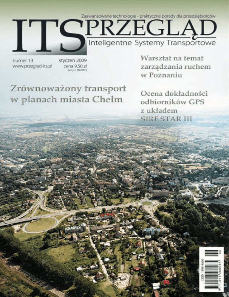 W ojsko we C entr um No rma lizacji, Jakości i Kodyfika cji OD REDAKTORA NACZELNEGO SZANOWNI Wydawca: OpenSky Systems and Services Sp. z o.o ul. Trębacka 4, 00-074 Warszawa tel. (022) 630 99 07; faks (022) 630 99 12 Redakcja: ul. Trębacka 4, 00-074 Warszawa tel. (022) 630 99 07; faks (022) 630 99 12 www.przeglad-its.pl email: [email protected] Redaktor naczelny: Jacek Doliński [email protected] Redakcja: Iwona Barbara Litwin (sekretarz redakcji) [email protected] Krzysztof Jamrozik (ITS dla BRD) Marek Tadeusz Krawczyk Piotr Krukowski Marek Litwin Jakub Młyńczak (Telematyka) Krzysztof Modelewski Rada Programowa Przeglądu ITS: prof. dr inż. Wojciech Suchorzewski (przewodniczący) dr inż. Mariusz Kaczmarek prof. dr hab. Jerzy Mikulski prof. dr hab. Roman Nagórski dr inż. Jacek Oskarbski dr inż. Andrzej Urbanik prof. nzw. dr inż. Kornel B. Wydro prof. dr Kazimierz Zaraś (Université du Québec) Dział reklamy i marketingu: email: [email protected] Prenumerata: warunki - patrz strona wewnątrz numeru Prenumerata w internecie: www.przeglad-its.pl DTP: Druk: Maria (Maryla) Dolińska Z.U.P. HARO Nakład: 2000 egzemplarzy Copyright © PRZEGLĄD ITS 2009 Przedruk, kopiowanie lub powielanie w jakiejkolwiek formie w części lub całości bez pisemnej zgody wydawcy jest zabronione. Redakcja nie odpowiada za treść reklam, ogłoszeń i artykułów sponsorowanych. Redakcja zastrzega sobie prawo do skrótów oraz do niepublikowania tekstów niezgodnych z charakterem pisma i interesem wydawcy. CZYTELNICY! W styczniowym numerze „Przeglądu ITS” zaczynamy nowy cykl artykułów, w których chcemy zaprezentować osiągnięcia i plany samorządów lokalnych w dziedzinie poprawy transportu i modernizacji infrastruktury transportowej, ze szczególnym uwzględnieniem planowanych zastosowań ITS. Na inaugurację cyklu wybraliśmy Chełm – urocze miasto położone na jedynych w swoim rodzaju w Europie Środkowej głębokich warstwach kredy, o bogatej historii i ciekawych zabytkach, a jednocześnie drugie pod względem wielkości miasto województwa lubelskiego i ważny węzeł komunikacyjny położony niedaleko granicy z Ukrainą. Przedstawiamy również sprawozdania z dwóch seminariów poświęconych bezpieczeństwu ruchu drogowego oraz wnioski z warsztatów na temat zarządzania ruchem w Poznaniu – wszystkie te wydarzenia miały miejsce w grudniu ub. r. Mam nadzieję, że pozostałe artykuły też wzbudzą Państwa zainteresowanie. Życzę jak zwykle miłej i ciekawej lektury. Jacek Doliński, PMP Redaktor naczelny DEAR READERS, We have started a new series of articles, presenting the achievements and plans of local governments and municipalities in the area of transport improvement and infrastructure modernization, with a special focus on ITS. Chełm – a charming historical town, but also an important road junction located in the southwestern Poland, near to the Ukrainian border – inaugurates the series. We also bring the reports from two seminars devoted to the transport safety and the final conclusions from a workshop in Poznań on the traffic management in the city. Sincerely Jacek Doliński, PMP Editor-in-chief Majowy numer Przeglądu ITS poświęcony będzie Drugiemu Polskiemu Kongresowi ITS Tematyka Kongresu: · ITS w polityce transportowej Państwa · Architektura i standardy ITS · Rola ITS w poprawie bezpieczeństwa transportu · Rola ITS w ochronie środowiska · ITS w zarządzaniu ruchem i transportem publicznym · Elektroniczny pobór opłat na drogach publicznych · Elektroniczny pobór opłat w miastach i transporcie publicznym · Rola ITS w logistyce i transporcie multimodalnym · ITS dla przejść granicznych · Problemy wdrożeniowe i finansowanie ITS w Polsce Ilość miejsca w numerze, które będziemy mogli przeznaczyć na reklamy, jest ograniczona. Zapraszamy do rezerwacji powierzchni reklamowej. [email protected] www.przeglad-its.pl tel. (022) 630-9907 faks (022) 630-9912 3 PRZEGLĄD ITS STYCZEŃ 2009 W NUMERZE STYCZEŃ2009 5 Idea zrównoważonego transportu w planach miasta Chełm The Strategic Plan of Sustained Transport Development in the Town of Chełm 8 Seminarium „Systemy informatyczne dla bezpieczeństwa ruchu drogowego” 7 Miniwywiad z Agatą Fisz, prezydentem miasta Chełm The “Information Systems for Road Traffic Safety” Seminar 11 Ocena dokładności odbiorników GPS z układem SIRF STAR III The Assessment of the Precision of the GPS Receivers with the SIRF STAR III Chipset 20 Interview with Agata Fisz, the Mayor of Chełm 19 Drogowa infrastruktura telekomunikacyjna (cz. 1) Road Telecommunications Infrastructure (part 1) 25 Bezpieczny system transportowy Warsztat na temat zarządzania ruchem w Poznaniu The Traffic Management in Poznań Safe Transport System Workshop 28 Prawo do prywatności a rozwój usług ITS w Polsce A Right to Maintain Privacy vs. 18 35 Wydarzenia Bezpieczniej na drogach 21 33 Wiadomości z branży the Expansion of ITS Services in Poland 31 Safer Roads Events OKŁADKA Industry News 34 Inteligentne technologie chronią przed kradzieżami paliwa 38 Intelligent Technologies Prevent Fuel Theft 36 Zatwierdzenie projektu Project Approval Zaprenumeruj Przegląd ITS Subscribe to Przegląd ITS Chełm z lotu ptaka (fot. dzięki uprzejmości UM Chełm) Projekt okładki: Maria Dolińska PRZEGLĄD ITS STYCZEŃ 2009 4 SAMORZĄDY IDEA ZRÓWNOWAŻONEGO ROZWOJU TRANSPORTU W PLANACH MIASTA CHEŁM Chełm liczy 67 tys. mieszkańców i stanowi ważny węzeł drogowy o znaczeniu regionalnym i ponadregionalnym, który tworzą drogi krajowe i wojewódzkie. Jest pierwszym miastem leżącym na drodze od polsko-ukraińskiego przejścia granicznego w Dorohusku. Dużym atutem Chełma jest jego położenie na wschodniej granicy Unii Europejskiej, na najkrótszym szlaku tranzytowym Paryż – Berlin – Warszawa – Kijów. Zasada zrównoważonego rozwoju znalazła swoje odzwierciedlenie w Strategii Rozwoju Miasta Chełm, a jej szczegółowe rozwinięcie