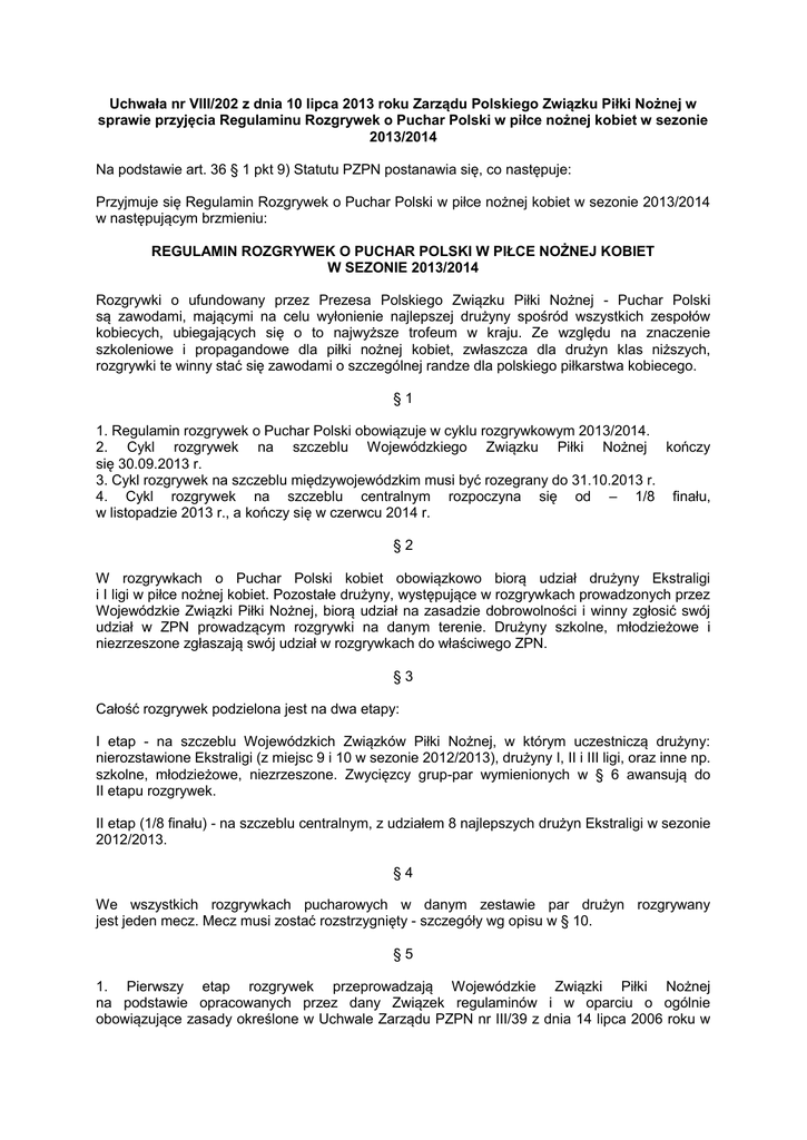 Uchwała nr VIII/202 z dnia 10 lipca 2013 roku Zarządu Polskiego Związku Piłki Nożnej w sprawie przyjęcia Regulaminu Rozgrywek o Puchar Polski w piłce nożnej kobiet w sezonie 2013/2014 Na podstawie art. 36 § 1 pkt 9) Statutu PZPN postanawia się, co następuje: Przyjmuje się Regulamin Rozgrywek o Puchar Polski w piłce nożnej kobiet w sezonie 2013/2014 w następującym brzmieniu: REGULAMIN ROZGRYWEK O PUCHAR POLSKI W PIŁCE NOŻNEJ KOBIET W SEZONIE 2013/2014 Rozgrywki o ufundowany przez Prezesa Polskiego Związku Piłki Nożnej - Puchar Polski są zawodami, mającymi na celu wyłonienie najlepszej drużyny spośród wszystkich zespołów kobiecych, ubiegających się o to najwyższe trofeum w kraju. Ze względu na znaczenie szkoleniowe i propagandowe dla piłki nożnej kobiet, zwłaszcza dla drużyn klas niższych, rozgrywki te winny stać się zawodami o szczególnej randze dla polskiego piłkarstwa kobiecego. §1 1. Regulamin rozgrywek o Puchar Polski obowiązuje w cyklu rozgrywkowym 2013/2014. 2. Cykl rozgrywek na szczeblu Wojewódzkiego Związku Piłki Nożnej kończy się 30.09.2013 r. 3. Cykl rozgrywek na szczeblu międzywojewódzkim musi być rozegrany do 31.10.2013 r. 4. Cykl rozgrywek na szczeblu centralnym rozpoczyna się od – 1/8 finału, w listopadzie 2013 r., a kończy się w czerwcu 2014 r. §2 W rozgrywkach o Puchar Polski kobiet obowiązkowo biorą udział drużyny Ekstraligi i I ligi w piłce nożnej kobiet. Pozostałe drużyny, występujące w rozgrywkach prowadzonych przez Wojewódzkie Związki Piłki Nożnej, biorą udział na zasadzie dobrowolności i winny zgłosić swój udział w ZPN prowadzącym rozgrywki na danym terenie. Drużyny szkolne, młodzieżowe i niezrzeszone zgłaszają swój udział w rozgrywkach do właściwego ZPN. §3 Całość rozgrywek podzielona jest na dwa etapy: I etap - na szczeblu Wojewódzkich Związków Piłki Nożnej, w którym uczestniczą drużyny: nierozstawione Ekstraligi (z miejsc 9 i 10 w sezonie 2012/2013), drużyny I, II i III ligi, oraz inne np. szkolne, młodzieżowe, niezrzeszone. Zwycięzcy grup-par wymienionych w § 6 awansują do II etapu rozgrywek. II etap (1/8 finału) - na szczeblu centralnym, z udziałem 8 najlepszych drużyn Ekstraligi w sezonie 2012/2013. §4 We wszystkich rozgrywkach pucharowych w danym zestawie par drużyn rozgrywany jest jeden mecz. Mecz musi zostać rozstrzygnięty - szczegóły wg opisu w § 10. §5 1. Pierwszy etap rozgrywek przeprowadzają Wojewódzkie Związki Piłki Nożnej na podstawie opracowanych przez dany Związek regulaminów i w oparciu o ogólnie obowiązujące zasady określone w Uchwale Zarządu PZPN nr III/39 z dnia 14 lipca 2006 roku w sprawie statusu zawodników, występujących w polskich klubach piłkarskich oraz zasad zmian przynależności klubowej oraz innych Uchwałach Zarządu PZPN. 2. Orzecznictwo dyscyplinarne zawodniczek, działaczy i klubów w odniesieniu do wszystkich drużyn biorących udział w rozgrywkach pucharowych I etapu na szczeblu Wojewódzkiego Związku Piłki Nożnej należy do ich właściwości. Każdorazowo ZPN przesyłają informację do Komisji ds. Piłkarstwa Kobiecego PZPN o nałożonych karach. §6 1. Rozgrywki pierwszego etapu zostaną przeprowadzone w 16 Wojewódzkich Związkach Piłki Nożnej, które niezwłocznie po zakończeniu eliminacji obowiązane są do przesłania do KPK PZPN informacji o zwycięskich drużynach. Należy również zgłosić informacje o udzielonych karach za żółte i czerwone kartki wraz z wykazami uprawnionych do gry zawodniczek. 2. Następnie zwycięzcy na szczeblu danego ZPN zagrają w grupach-parach o awans do 1/8 finału jak następuje: Grupa 1 – Mazowiecki ZPN – Podlaski ZPN Grupa 2 – Wielkopolski ZPN – Lubuski ZPN Grupa 3 – Kujawsko-Pomorski ZPN – Warmińsko-Mazurski ZPN Grupa 4 – Zachodniopomorski ZPN – Pomorski ZPN Grupa 5 – Lubelski ZPN – Podkarpacki ZPN Grupa 6 – Małopolski ZPN – Świętokrzyski ZPN Grupa 7 – Opolski ZPN – Dolnośląski ZPN Grupa 8 – Śląski ZPN – Łódzki ZPN 3. Gospodarzem zawodów będzie zespół występujący w niższej klasie rozgrywkowej. Wszelkie koszty związane z organizacją meczu ponosi gospodarz zawodów. §7 Wystawienie przez klub do rozgrywek więcej niż jednej drużyny, zobowiązuje do stosowania następujących zasad: 1. Zawodniczki, które brały udział w jednej rozgrywce/terminie, nie mogą brać udziału w rozgrywkach w innej drużynie tego samego klubu w następnym terminie, jeżeli obie drużyny awansują dalej. Jeżeli jedna z tych drużyn została wyeliminowana z rozgrywek, wtedy najwyżej 4 zawodniczki drużyny wyeliminowanej mogą grać w tej drużynie swego klubu, szkoły, zakładu pracy, itp., która zakwalifikowała się do dalszych rozgrywek. 2. Drużyny tego samego klubu, winny być rozlosowane możliwie do różnych grup rozgrywkowych. 3. Oznaczenie drużyn tego samego klubu ustala się na podstawie klas rozgrywkowych, w których one aktualnie występują – I drużynę reprezentuje zespół złożony z zawodniczek występujący w najwyższej klasie rozgrywkowej (spośród zawodniczek zgłoszonych do rozgrywek ligowych I drużyny) wg zasad jak poniżej w punktach a, b, c. Kolejną II i III drużynę klubową reprezentują zawodniczki występujące w drużynie (-ach) innych, niższych klas rozgrywkowych. a) niedopuszczalny jest wariant oznaczający drużyny III, II z zawodniczkami w składzie, które zostały zgłoszone do I drużyny i wystąpiły w zawodach mistrzowskich, ligowych sezonu 2013/2014 do dnia/terminu meczu w P.P. na poziomie ZPN, b) przy zgłoszeniu/udziale kolejnych drużyn danego klubu, rozgrywki pucharowe na poziomie ZPN rozpoczynają drużyny oznaczone odpowiednio np. III, II w składzie, których może znajdować się maksymalnie po 4 zawodniczki z I drużyny klubowej, które wystąpiły w zawodach mistrzowskich, ligowych sezonu 2013/2014 do terminu rozpoczęcia rozgrywek P.P. na poziomie ZPN, c) 