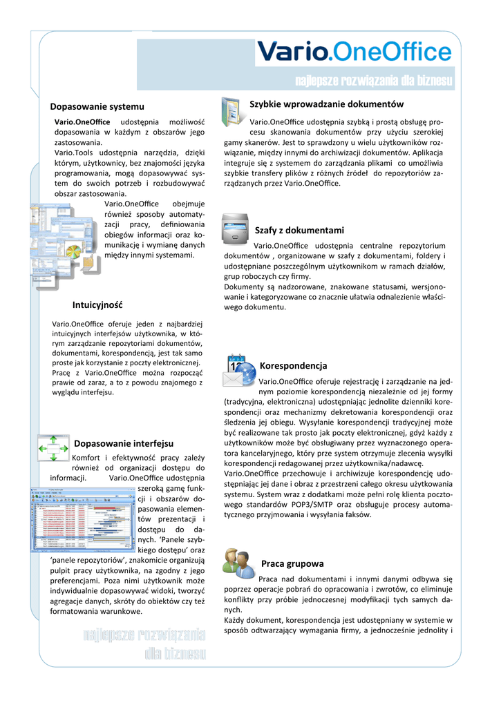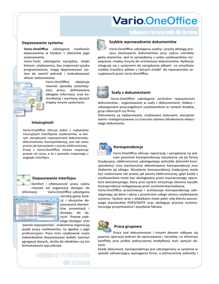 najlepsze rozwiązania dla biznesu Dopasowanie systemu Vario.OneOffice udostępnia możliwość dopasowania w każdym z obszarów jego zastosowania. Vario.Tools udostępnia narzędzia, dzięki którym, użytkownicy, bez znajomości języka programowania, mogą dopasowywać system do swoich potrzeb i rozbudowywać obszar zastosowania. Vario.OneOffice obejmuje również sposoby automatyzacji pracy, definiowania obiegów informacji oraz komunikację i wymianę danych między innymi systemami. Intuicyjność Vario.OneOffice oferuje jeden z najbardziej intuicyjnych interfejsów użytkownika, w którym zarządzanie repozytoriami dokumentów, dokumentami, korespondencją, jest tak samo proste jak korzystanie z poczty elektronicznej. Pracę z Vario.OneOffice można rozpocząć prawie od zaraz, a to z powodu znajomego z wyglądu interfejsu. Dopasowanie interfejsu Komfort i efektywność pracy zależy również od organizacji dostępu do informacji. Vario.OneOffice udostępnia szeroką gamę funkcji i obszarów dopasowania elementów prezentacji i dostępu do danych. ‘Panele szybkiego dostępu’ oraz ‘panele repozytoriów’, znakomicie organizują pulpit pracy użytkownika, na zgodny z jego preferencjami. Poza nimi użytkownik może indywidualnie dopasowywać widoki, tworzyć agregacje danych, skróty do obiektów czy też formatowania warunkowe. Szybkie wprowadzanie dokumentów Vario.OneOffice udostępnia szybką i prostą obsługę procesu skanowania dokumentów przy użyciu szerokiej gamy skanerów. Jest to sprawdzony u wielu użytkowników rozwiązanie, między innymi do archiwizacji dokumentów. Aplikacja integruje się z systemem do zarządzania plikami co umożliwia szybkie transfery plików z różnych źródeł do repozytoriów zarządzanych przez Vario.OneOffice. Szafy z dokumentami Vario.OneOffice udostępnia centralne repozytorium dokumentów , organizowane w szafy z dokumentami, foldery i udostępniane poszczególnym użytkownikom w ramach działów, grup roboczych czy firmy. Dokumenty są nadzorowane, znakowane statusami, wersjonowanie i kategoryzowane co znacznie ułatwia odnalezienie właściwego dokumentu. Korespondencja Vario.OneOffice oferuje rejestrację i zarządzanie na jednym poziomie korespondencją niezależnie od jej formy (tradycyjna, elektroniczna) udostępniając jednolite dzienniki korespondencji oraz mechanizmy dekretowania korespondencji oraz śledzenia jej obiegu. Wysyłanie korespondencji tradycyjnej może być realizowane tak prosto jak poczty elektronicznej, gdyż każdy z użytkowników może być obsługiwany przez wyznaczonego operatora kancelaryjnego, który prze system otrzymuje zlecenia wysyłki korespondencji redagowanej przez użytkownika/nadawcę. Vario.OneOffice przechowuje i archiwizuje korespondencję udostępniając jej dane i obraz z przestrzeni całego okresu użytkowania systemu. System wraz z dodatkami może pełni rolę klienta pocztowego standardów POP3/SMTP oraz obsługuje procesy automatycznego przyjmowania i wysyłania faksów. Praca grupowa Praca nad dokumentami i innymi danymi odbywa się poprzez operacje pobrań do opracowania i zwrotów, co eliminuje konflikty przy próbie jednoczesnej modyfikacji tych samych danych. Każdy dokument, korespondencja jest udostępniany w systemie w sposób odtwarzający wymagania firmy, a jednocześnie jednolity i najlepsze rozwiązania dla biznesu Wymiana informacji wewnątrz systemu, pomiędzy użytkownikami może odbywać się zarówno poprzez pocztę udostępnianą przez system, jak i zadań które mogą być przez nich planowane i przydzielane do realizacji. Zarządzanie zadaniami Przekaz poleceń, planowanie pracy oraz inne działania nazwane znajdują swoje odzwierciedlenie w formie zadań. Vario.OneOffice udostępnia ten obszar w przejrzystym obszarze zarządzania zadaniami, które dają możliwość zarządzania pracą własną jak i zlecania jej realizacji innym użytkownikom systemu. Każde z zadań może być dzielone na zadania składowe, których planowanie i znakowanie realizacji agreguje swoje wartości na zadania nadrzędne. Tym sposobem nawet skomplikowane działania mogą być w sposób efektywny planowane i nadzorowane. Dodatkowo Vario.OneOffice udostępnia ich prezentacje wykresami Gantt’a, co znakomicie obrazuje działania. Obsługa terminarzy Vario.OneOffice udostępnia terminarze które mogą być tworzone w wielu miejscach systemu odzwierciedlając zarówno plan czasu pracy użytkowników jak i zasoby w postaci sal, samochodów czy urządzeń. Widoki dzienne, tygodniowe, miesięczne i roczne oraz wspólnie prezentujące plan czasu pracy wybranych zasobów w sposób przejrzysty i przystępny umożliwiają organizacje i zarządzanie czasem pracy. Kontakty Vario.OneOffice oferuje szeroki zakres zarządzania kontaktami, obejmujący zarządzanie indeksami adresowymi oraz wszelkimi działaniami, które są podejmowane przez użytkowników w ramach kontaktów począwszy na wytwarzaniu informacji dla kontaktu, poprzez planowanie i rejestracje działań, a na komunikacji z użyciem poczty elektronicznej listów, Bezpieczeństwo Vario.OneOffice realizuje cel który prowadzi do bezpiecznego wytwarzania, rejestracji i udostępniania informacji będących w posiadaniu firmy i jej pracowników. Przestrzeń wielu lat pracy firmy prowadzi do ich rejestracji i powstawania w zmieniających się warunkach przez wielu pracowników. Vario.OneOffice gromadzi te informacje udostępniając użytkownikom sprawne mechanizmy ich wyszukiwania oraz mechanizmy przeglądu działań i związków przyczynowoskutkowych. Oprócz warstwy użytkowej Vario.OneOffice stosuje wysokie standardy bezpieczeństwa poprzez ochronę zgromadzonych informacji. Współpraca z aplikacjami Oprócz porządkowania pracy oraz informacji Vario.OneOffice ułatwia pracę z innymi aplikacjami udostępniając wzorce zarówno dokumentów jak i całych zestawów obiektów, umożliwiając tworzenie wzorców całych struktur informacj