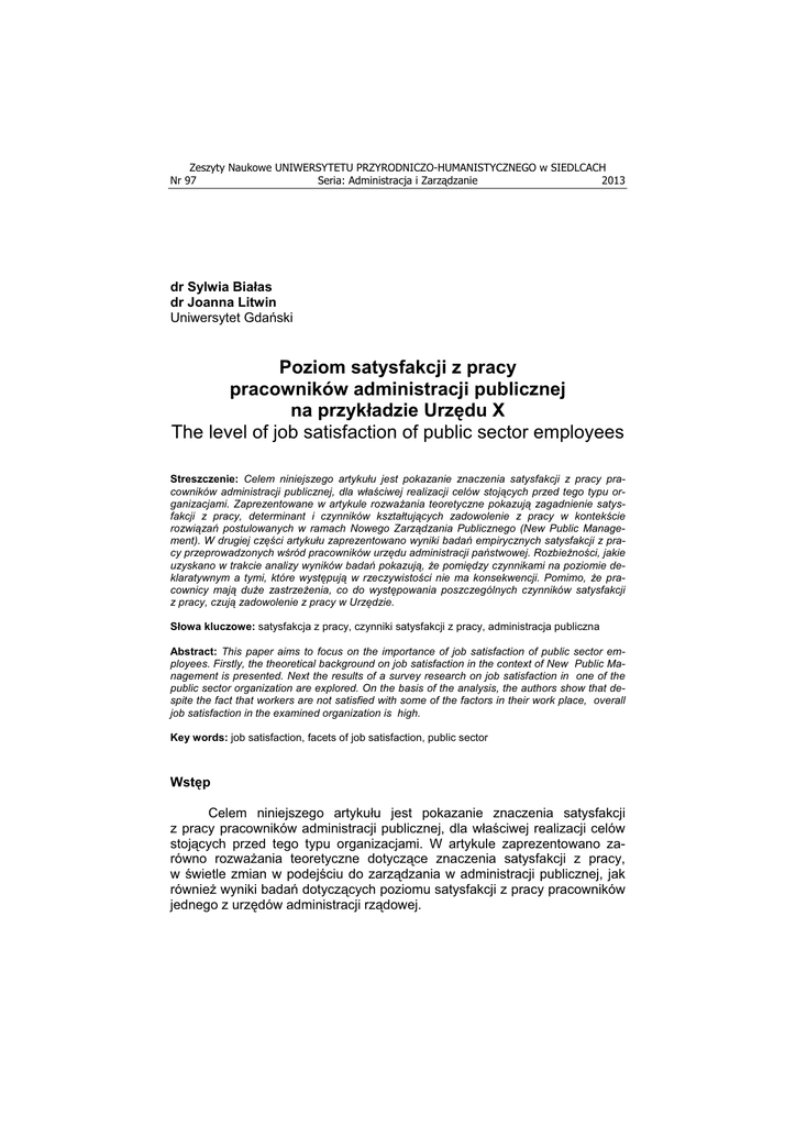 Zeszyty Naukowe UNIWERSYTETU PRZYRODNICZO-HUMANISTYCZNEGO w SIEDLCACH Nr 97 Seria: Administracja i Zarz dzanie 2013 dr Sylwia Bia as dr Joanna Litwin Uniwersytet Gda ski Poziom satysfakcji z pracy pracowników administracji publicznej na przyk adzie Urz!du X The level of job satisfaction of public sector employees Streszczenie: Celem niniejszego artyku u jest pokazanie znaczenia satysfakcji z pracy pracowników administracji publicznej, dla w a!ciwej realizacji celów stoj"cych przed tego typu organizacjami. Zaprezentowane w artykule rozwa#ania teoretyczne pokazuj" zagadnienie satysfakcji z pracy, determinant i czynników kszta tuj"cych zadowolenie z pracy w kontek!cie rozwi"za$ postulowanych w ramach Nowego Zarz"dzania Publicznego (New Public Management). W drugiej cz%!ci artyku u zaprezentowano wyniki bada$ empirycznych satysfakcji z pracy przeprowadzonych w!ród pracowników urz%du administracji pa$stwowej. Rozbie#no!ci, jakie uzyskano w trakcie analizy wyników bada$ pokazuj", #e pomi%dzy czynnikami na poziomie deklaratywnym a tymi, które wyst%puj" w rzeczywisto!ci nie ma konsekwencji. Pomimo, #e pracownicy maj" du#e zastrze#enia, co do wyst%powania poszczególnych czynników satysfakcji z pracy, czuj" zadowolenie z pracy w Urz%dzie. S owa kluczowe: satysfakcja z pracy, czynniki satysfakcji z pracy, administracja publiczna Abstract: This paper aims to focus on the importance of job satisfaction of public sector employees. Firstly, the theoretical background on job satisfaction in the context of New Public Management is presented. Next the results of a survey research on job satisfaction in one of the public sector organization are explored. On the basis of the analysis, the authors show that despite the fact that workers are not satisfied with some of the factors in their work place, overall job satisfaction in the examined organization is high. Key words: job satisfaction, facets of job satisfaction, public sector Wst!p Celem niniejszego artyku!u jest pokazanie znaczenia satysfakcji z pracy pracowników administracji publicznej, dla w!a"ciwej realizacji celów stoj#cych przed tego typu organizacjami. W artykule zaprezentowano zarówno rozwa$ania teoretyczne dotycz#ce znaczenia satysfakcji z pracy, w "wietle zmian w podej"ciu do zarz#dzania w administracji publicznej, jak równie$ wyniki bada dotycz#cych poziomu satysfakcji z pracy pracowników jednego z urz%dów administracji rz#dowej. 306 S. Bia!as, J. Litwin Satysfakcja z pracy i jej znaczenie Satysfakcja z pracy w literaturze przedmiotu definiowana jest jako oceniana ró$nica pomi%dzy tym, czego cz!owiek oczekuje, a tym, co otrzymuje w miejscu pracy (wed!ug swojej subiektywnej oceny)1. Poziom satysfakcji z pracy b%dzie odzwierciedla! wi%c stopie , w którym pracownik czuje si% spe!niony w swojej pracy i b%dzie zale$a! od wielu czynników zarówno zwi#zanych z samym pracownikiem, jego cechami i wcze"niejszymi do"wiadczeniami, organizacj# w której jest zatrudniony oraz z otoczeniem zewn%trznym. Nies!abn#ce zainteresowanie satysfakcj# z pracy2 zwi#zane jest z jej znaczeniem dla w!a"ciwego realizowania zada stawianych przed pracownikiem i efektywnego funkcjonowania organizacji. Pomimo, i$ nie wskazuje si% na bezpo"redni zwi#zek pomi%dzy poziomem satysfakcji a wydajno"ci# indywidualnego pracownika3, mo$na wskaza& zale$no"& wydajno"ci ca!ej organizacji od poziomu satysfakcji jej pracowników4. Jest to zwi#zane z wp!ywem satysfakcji z pracy na poziom fluktuacji pracowników5 i ich absencji6, a nawet korelacj# pomi%dzy brakiem satysfakcji, a wyst%powaniem problemów z kondycj# psychiczn# pracowników7. Ponadto satysfakcja z pracy postrzegana jest jako jeden z elementów wspomagaj#cych dzia!anie systemu motywacji, pozwalaj#cym na jego wzmocnienie8. Wskazuje si%, i$ zwi%kszenie satysfakcji z pracy pozwala na zmian% zachowa , gdy$ bardziej zadowoleni z pracy pracownicy przede wszystkim9: – w wi%kszym stopniu identyfikuj# si% z celami przedsi%biorstwa (gdy$ pracownik dostrzega w ich realizacji mo$liwo"& zrealizowania celów w!asnych), – wykazuj# wi%ksz# trosk% o jako"& pracy, – s# bardziej lojalni i zaanga$owani w prac%, – stawiaj# mniejszy opór wobec zmian, – w wi%kszym stopniu wykazuj# ch%& do wspó!pracy z innymi. Konsekwencj# niskiej satysfakcji w pracy lub jej braku mo$e by& ca!a gama zachowa kontrproduktywnych wp!ywaj#cych negatywnie na realiza1 P.J.D.D Drenth, H. Thierry, Ch.J. de Wolff (ed.), Organizational psychology, Psychology Press, Sussex 1998, s. 278. 2 Szacuje si%, $e do ko ca dwudziestego wieku, liczba publikacji dotycz#cych tego zagadnienia przekroczy!a 8 tys. (Schriensen Ch.A., Neider L.L., Equivalence in management, Tom 1, Information Age Publition, US 2001, s. 131-132). 3 P. Hellriegel, J.W. Slocum, Organizational behavior, Thomson, Mason 2007, s. 57. 4 M. Armstrong, Zarz"dzanie zasobami ludzkimi, Dom Wydawniczy ABC, Kraków 2000, s. 72. 5 Szerzej: A.E. Clark, What really matters in a job? Hedonic measurement using quit data, Labour Economics 8/2001. 6 Szezrzej: R.B. Freeman, Job satisfaction as an economic variable, American Economic Review, Vol. 68, 2/1978. 7 Szerzej: E.B. Faragher, M. Cass, C.L. Cooper , The relationship between job satisfaction and health: a meta-analysis, Occupational and Environmental Medicine, 62(2)/ 2005. 8 M.W. Koperty ska, Motywowanie pracowników. Teoria i praktyka, Placet, Warszawa 2008, s. 247. 9 M.W. Koperty ska, Motywowanie pracowników. Teoria i praktyka, Placet, Warszawa 2008, s. 247; J. Mrzyg!ód, Badanie postaw i satysfakcji pracowników, Personel nr 22, 2003, s. 2. Seria: Administracja i Zarz dzanie (24)2013 ZN nr 97 Poziom satysfakcji z pracy pracowników administracji publicznej na przyk!adzie Urz"du X 307 cj% celów organizacji, naruszaj#cych normy organizacyjne lub wp!ywaj#cych na spadek produktywno"ci10. Szkodliwo"& zachowa kontrproduktywnych polega na dobrowolnym, "wiadomym podejmowaniu takich dzia!a przez pracowników, pomimo, $e wiedz# oni, $e wykrycie takiego post
