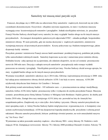 www.radiomaryja.pl/artykuly.php?id=104489 2010-04-23 Samoloty też muszą mieć paryski szyk Francuzi, decydując się w 2008 roku na odnowienie floty samolotów rządowych, kierowali się nie tylko czynnikami ekonomicznymi. Oczywiście oficjalnie używano argumentu, że stare i wysłużone maszyny wymagają coraz kosztowniejszych remontów i przeglądów. Jednak nieoficjalnie mówiono, że prezydent Francji Nicolas Sarkozy chciał kupić nowy samolot, bo stary wyglądał bardzo ubogo na tle innych maszyn prezydenckich. Za transport dostojników państwowych odpowiada ETEC - eskadra podległa bezpośrednio ministrowi obrony. W razie potrzeby, gdy nie można skorzystać z rządowych samolotów, ministrowie wynajmują maszyny od prywatnych przewoźników. Koszty pokrywane są z budżetu transportowego, jakim dysponuje każdy minister. Prezydent, premier i ministrowie Francji zawsze latali samolotami produkcji krajowej, podobnie jak jeżdżą tylko samochodami rodzimych marek. Samoloty kupowane są na raty i zamawiane przez ministra obrony. Dokładne koszty całej operacji nie są ujawniane, ale zdaniem ekspertów, na ten cel zostanie przeznaczone nawet do 300 mln euro. Decyzję o zakupie nowych samolotów przyspieszyły stale rosnące wydatki ponoszone na remonty i przeglądy. Nieoficjalnie powód jest inny. Nicolas Sarkozy chciał nowego sprzętu, bo stary wyglądał bardzo ubogo na tle innych maszyn prezydenckich. Wymiana wszystkich samolotów zakończy się w 2014 roku. Główną i najważniejszą inwestycją w 2008 roku był zakup przez ministerstwo obrony dwóch airbusów A330. I nie były to nowe maszyny. A330-200 użytkowały dotychczas linie lotnicze Air Caraibes i Swissair. Rok później został zatwierdzony budżet - 185 milionów euro - z przeznaczeniem na zakup i modyfikację samolotu Airbus A330, który będzie przeznaczony tylko i wyłącznie do użytku prezydenta Francji. Maszyna zostanie przerobiona przez firmę Sabena Technics w Mérignac koło Bordeaux i będzie gotowa do służby pod koniec 2010 roku. Zastąpi dwa razy mniejszego A319, który nie pozwalał na loty do Ameryki bez uzupełniania paliwa. Znajdowały się w nim tylko dwie kabiny i prysznic. Obecny samolot prezydencki ma mieć specjalną część, w której Nicolas Sarkozy będzie mógł pracować, wyposażoną m.in. w komputery oraz system szyfrowanej komunikacji. A330 ma dysponować kapsułą ratunkową dla prezydenta i ochroną przed rakietami. Obecnie samolot prezydencki, którym podróżuje również premier, na wzór amerykański nazywa się "Air Force One". Wymieniane są także pozostałe samoloty rządowe - dwa falcony 900 i cztery falcony 50. Niektóre z nich mają po 30 lat. Zastępują je nowoczesne falcony 7X i falcony 2000 produkcji Dassault Aviation. Falcony 7X www.radiomaryja.pl Strona 1/2 to trzysilnikowe odrzutowce. W sprzedaży pojawiły się w 2007 roku. Jeden egzemplarz kosztuje 40 mln euro. Z dwóch, które już weszły do floty rządowej, jeden został nazwany na cześć żony prezydenta "Carla One". Falcon 7X może pokonać trasę 11 tys. km i zabrać na pokład od 8 do 19 pasażerów. Falcony 2000 są dwusilnikowymi samolotami średniego zasięgu. Może nimi podróżować 8 osób. Franciszek L. Ćwik, Caen www.radiomaryja.pl Strona 2/2